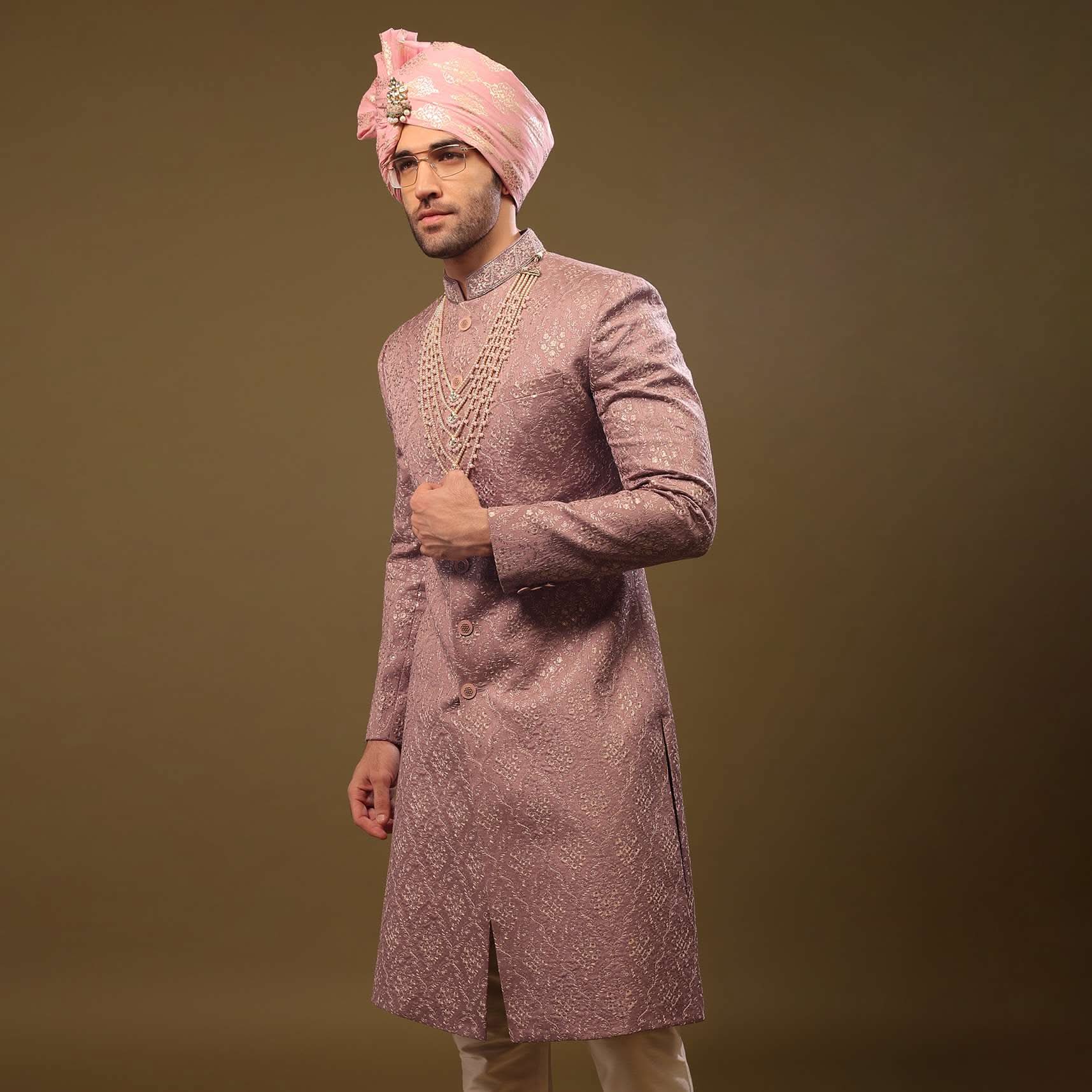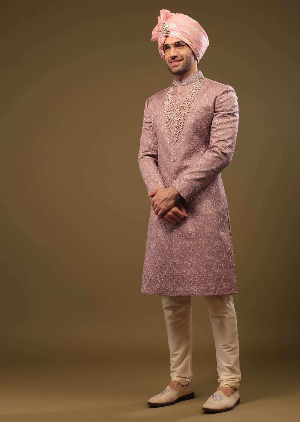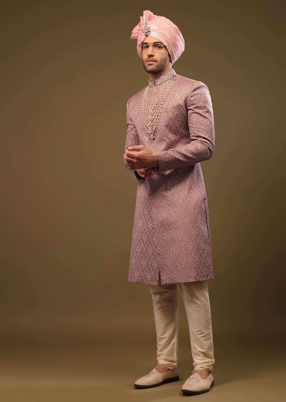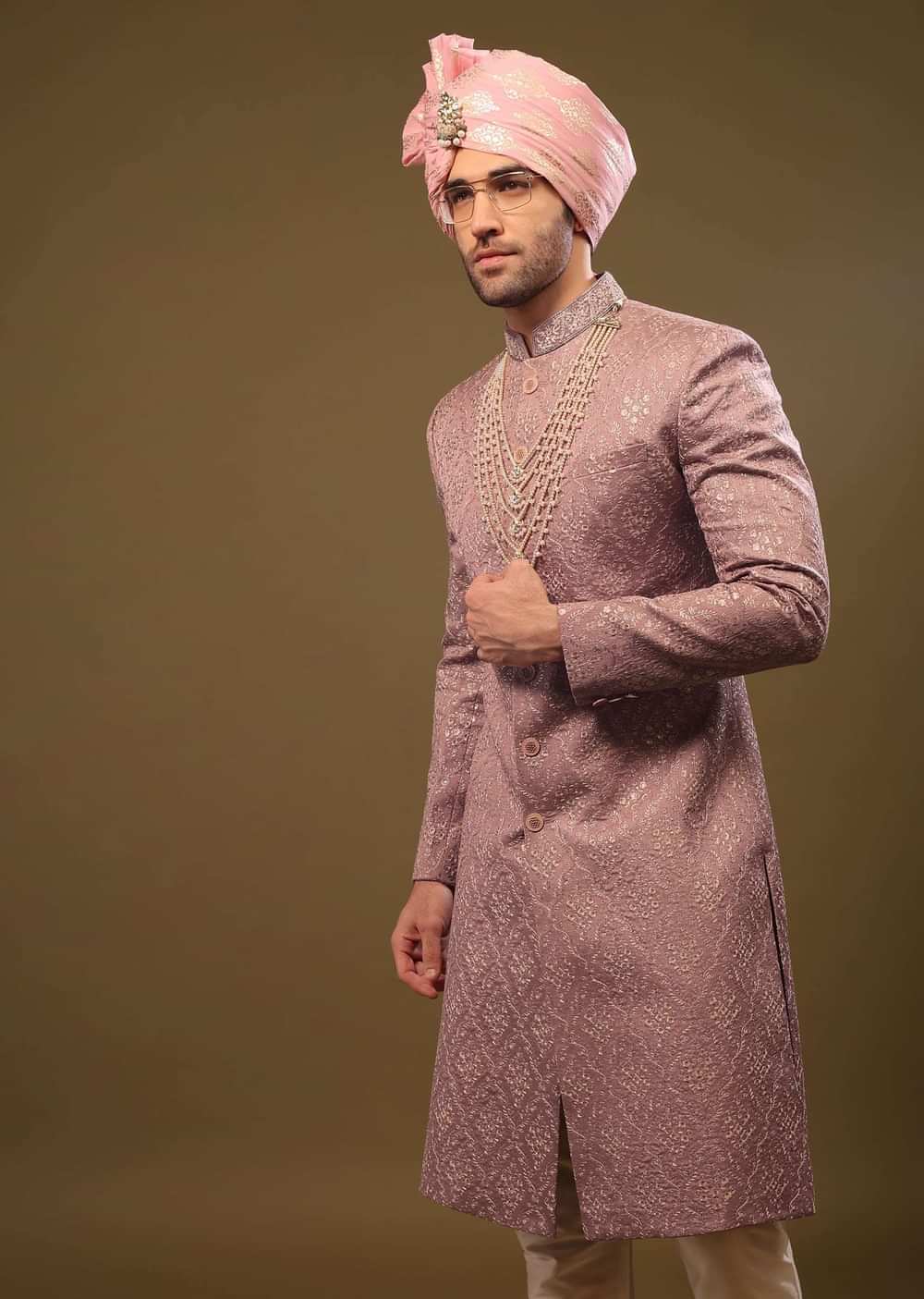 - An enticing dusty orchid purple sherwani set fabricated in silk, crafted in a hand-embroidered thread weave.