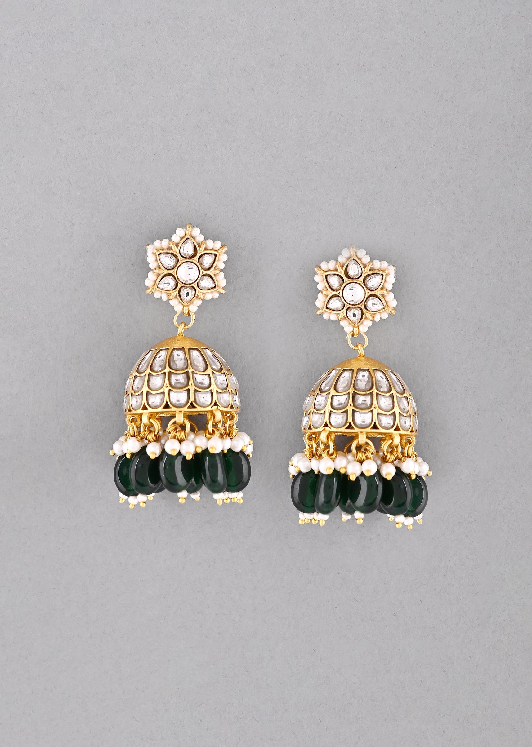 Elevate your festive look with these dark green gold earrings featuring intricate pachi kundan work. The rich green hue paired with delicate kundan detailing adds a regal touch, making them... More Product Details