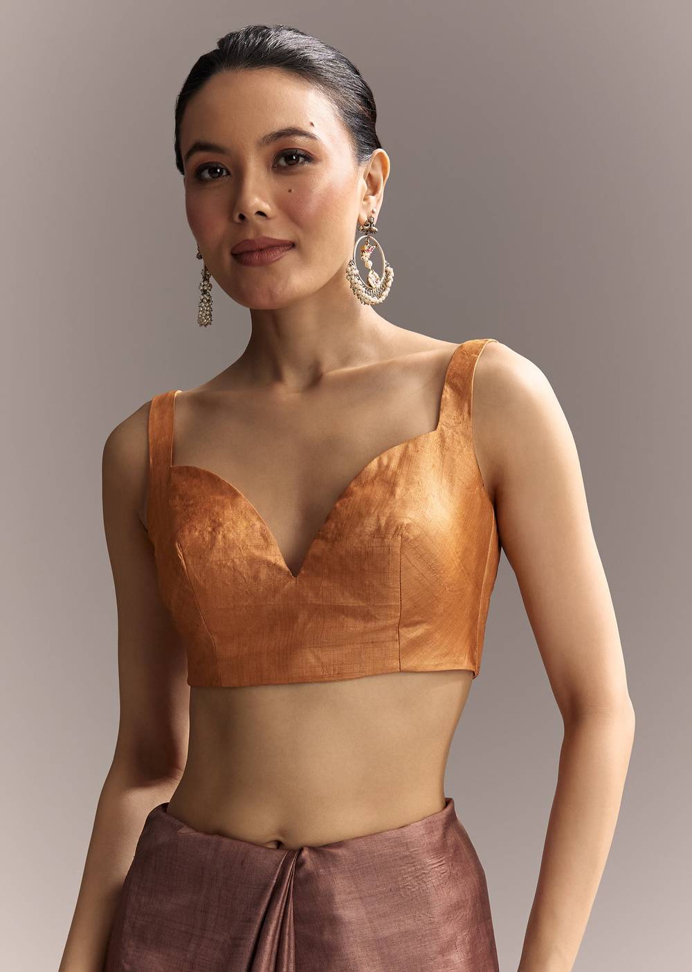 Unique and expressive, this brown cotton saree features hand-painted detailing and a contrast border that celebrates artisanal craftsmanship. Ideal for intimate festive gatherings.