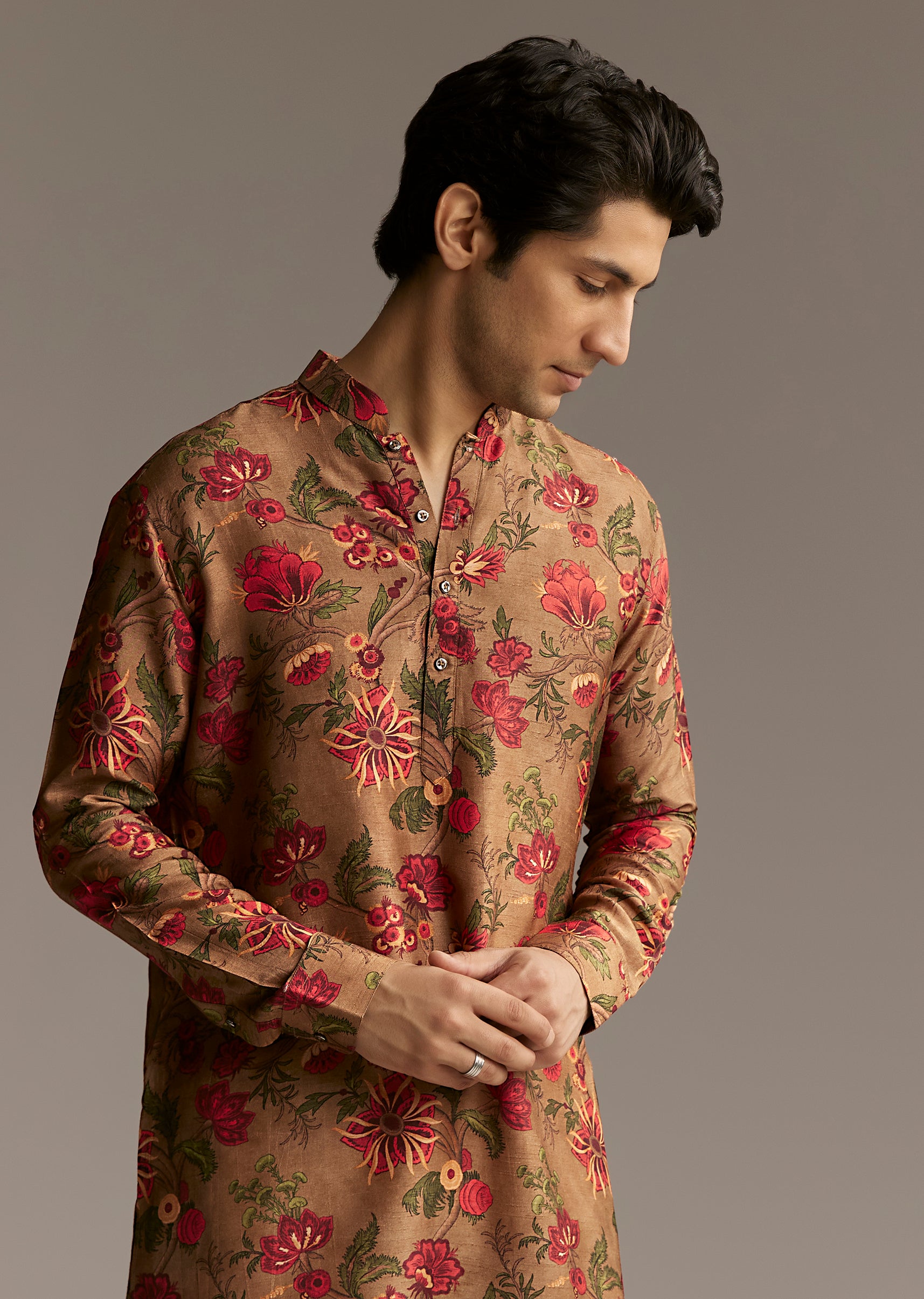 Refined and artistic, this brown silk kurta with floral print adds depth and richness. A perfect complement for heritage-inspired couple looks.
