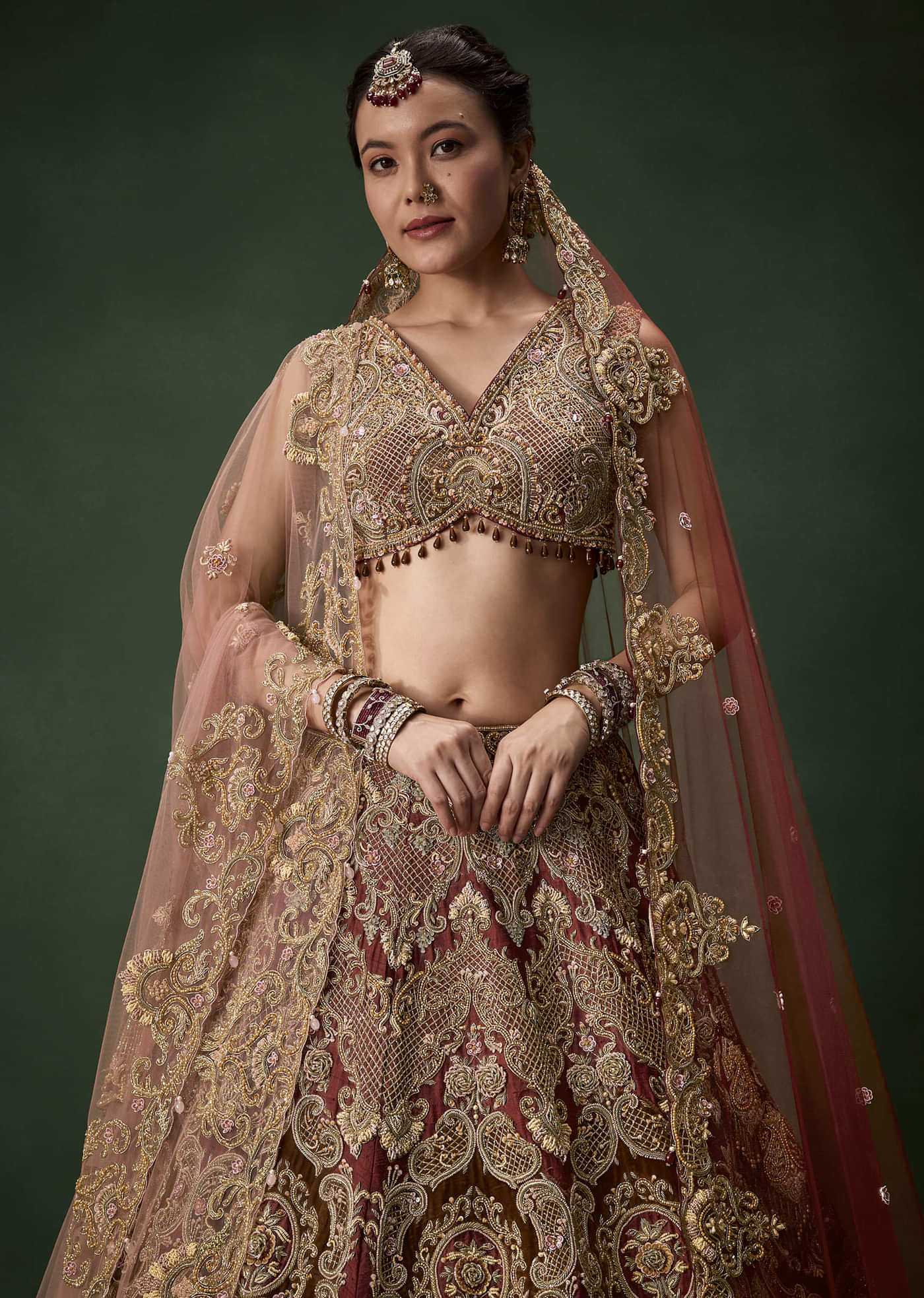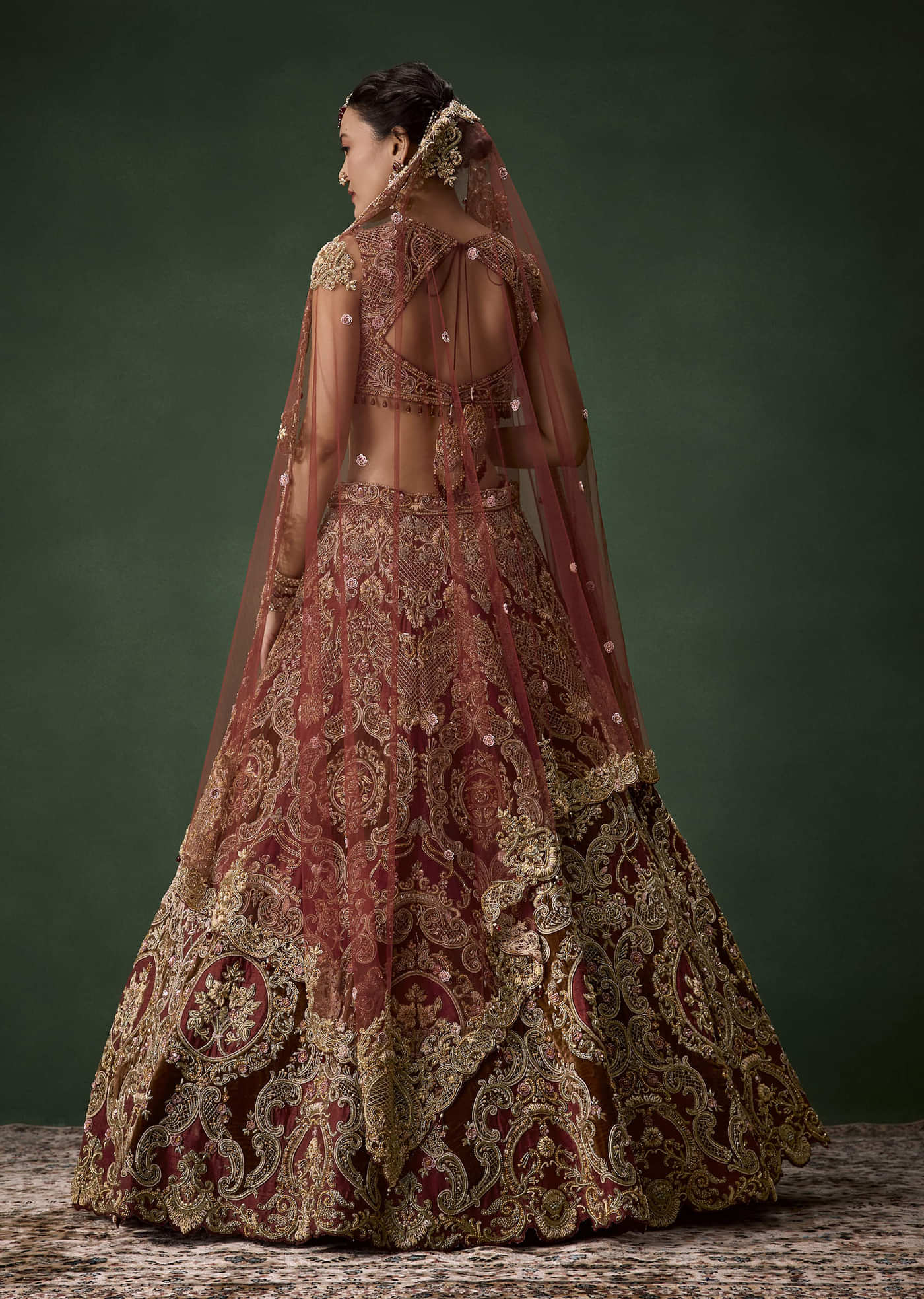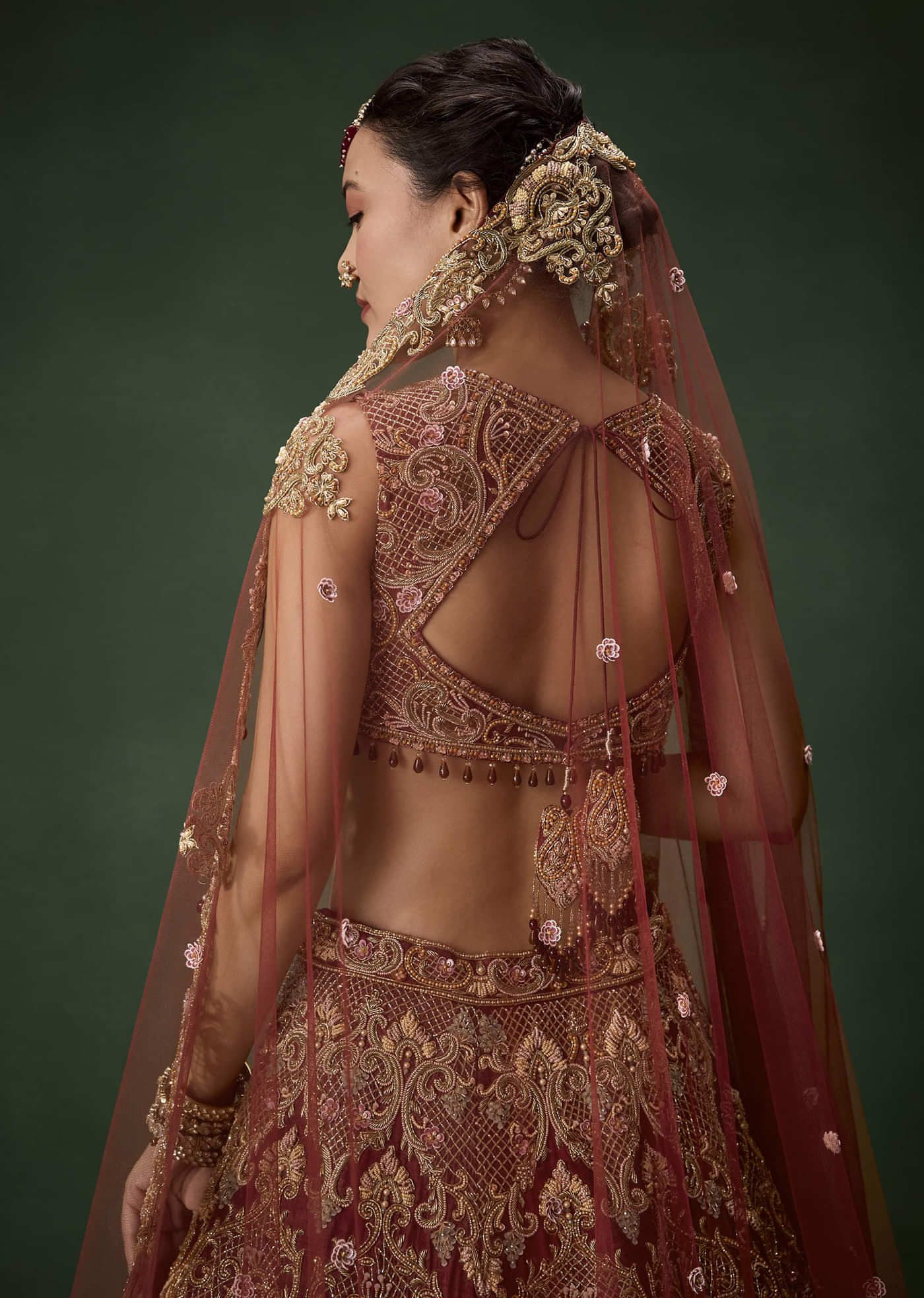 Complement the regal craftsmanship with statement polki jewellery and a sleek bun adorned with fresh flowers for a classic bridal finish.
