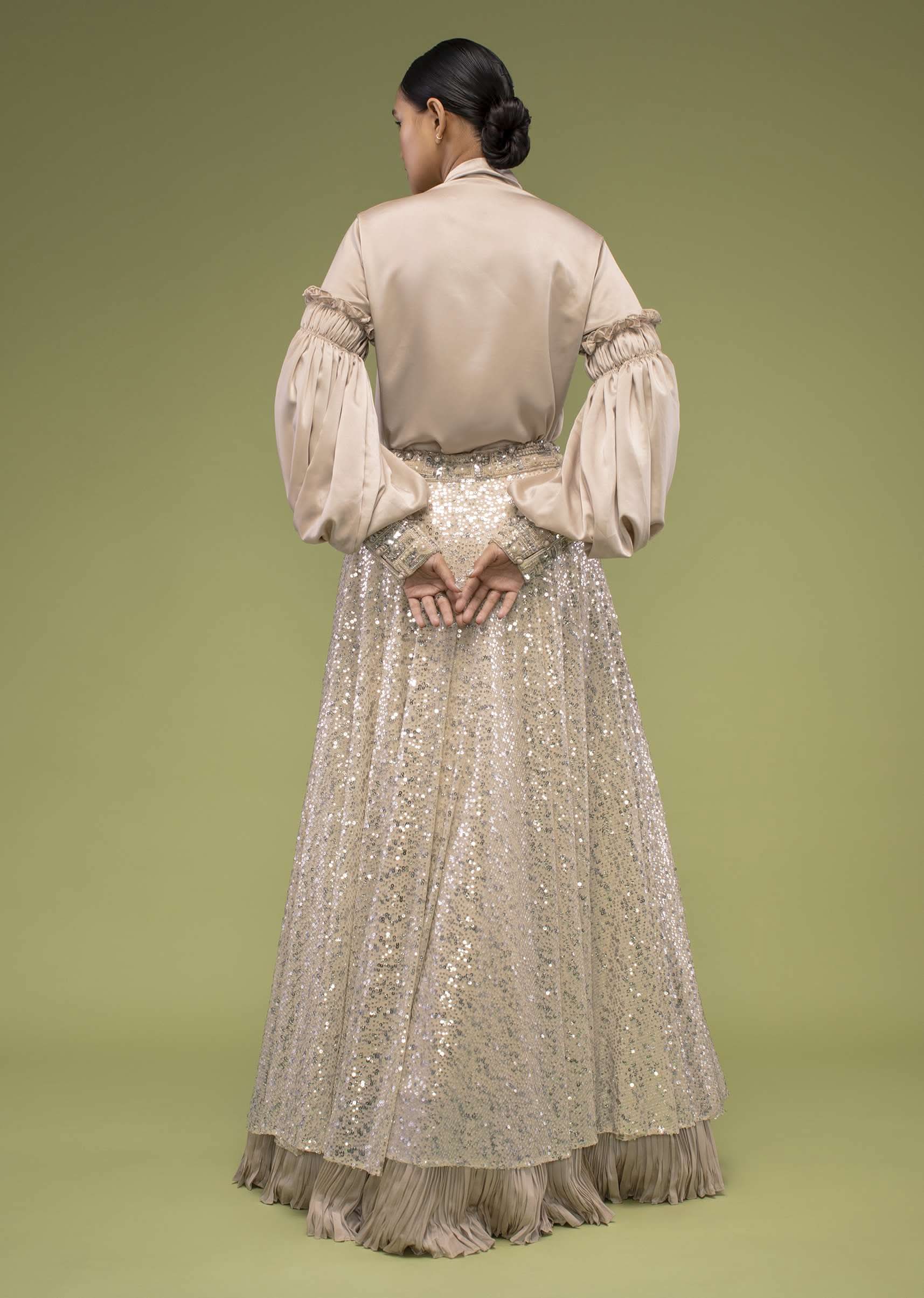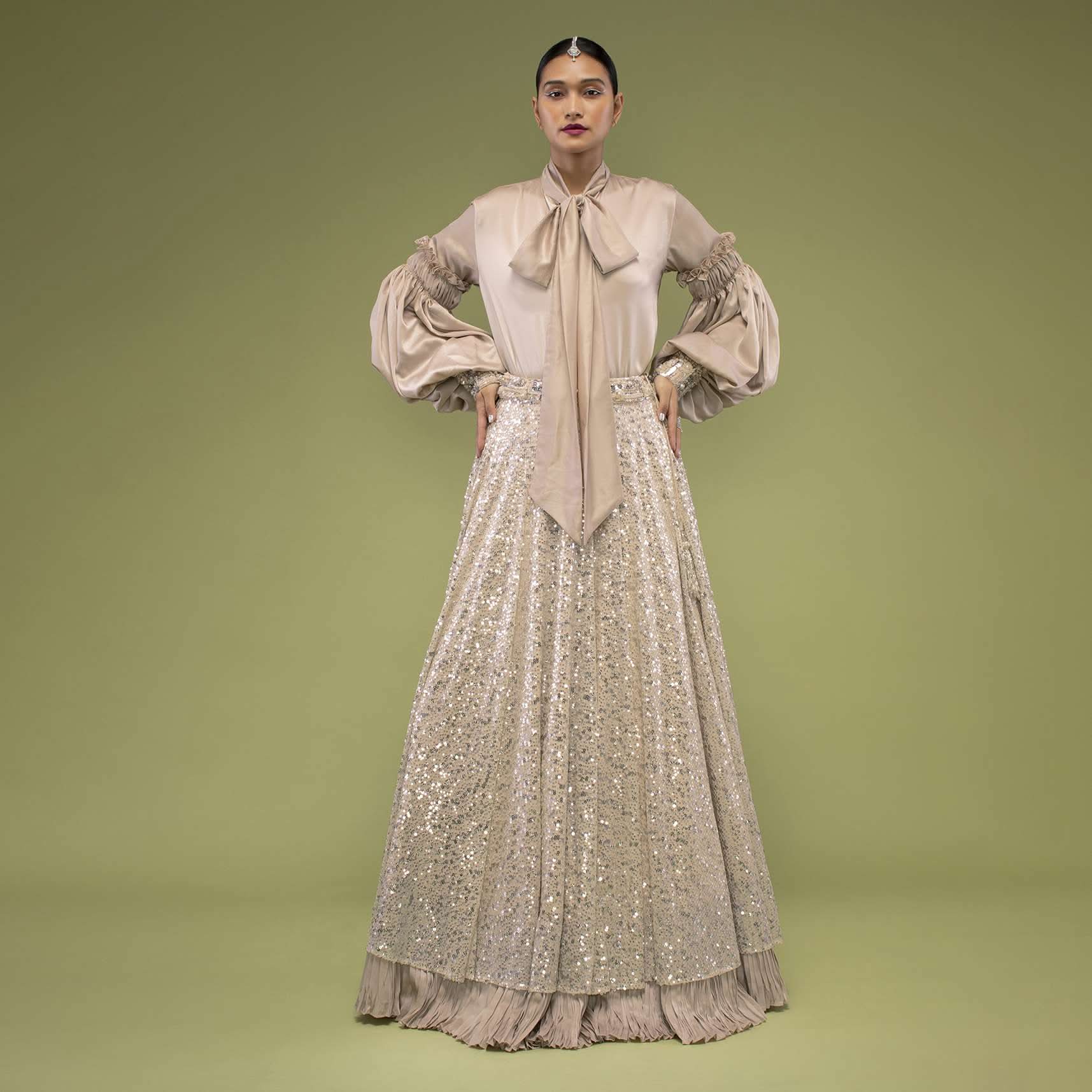 English Beige Shirt And Ivory Lehenga In Sequins Embroidery, Shirt Is Crafted In Satin With A Bow Tie-Up At The Front
