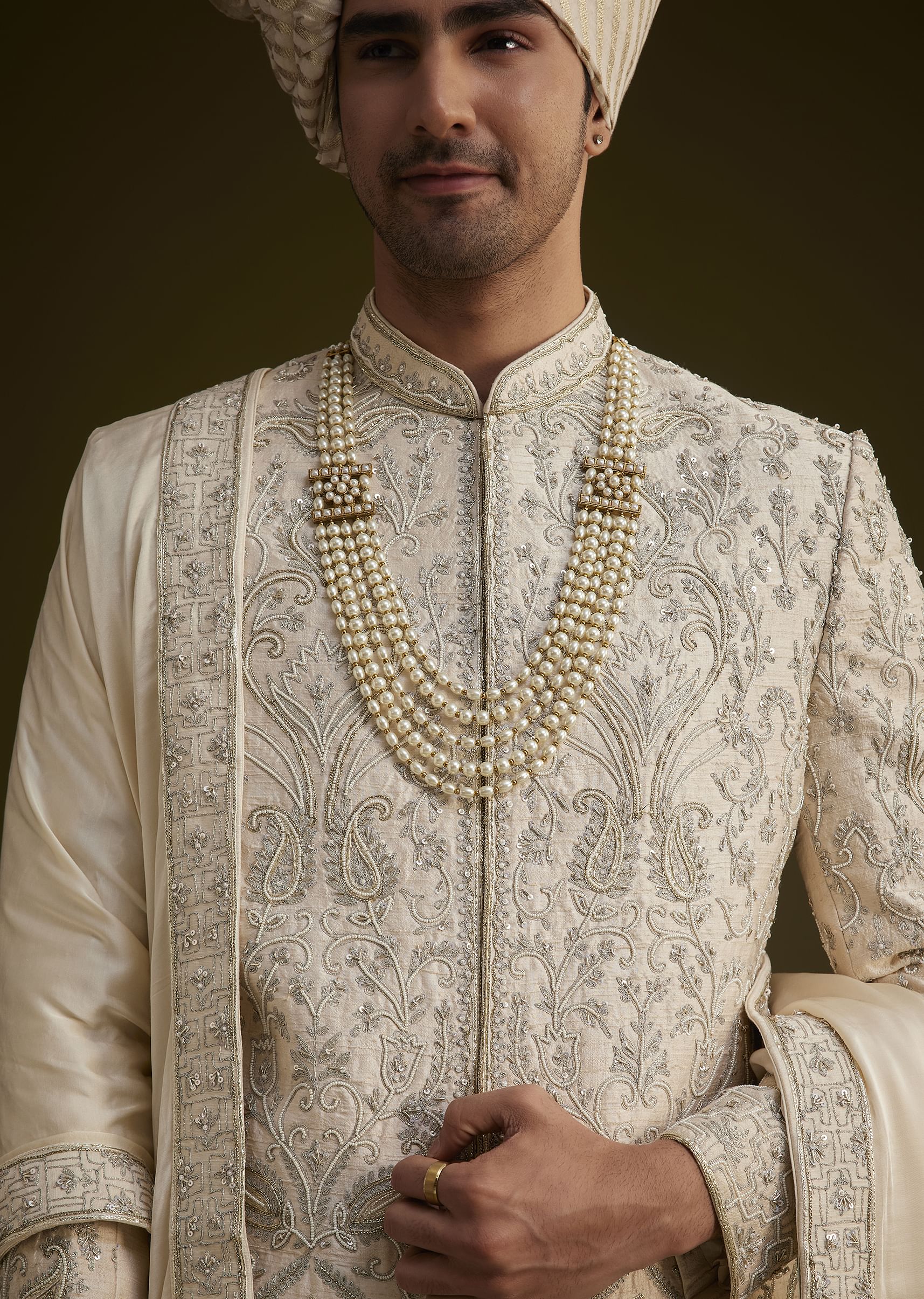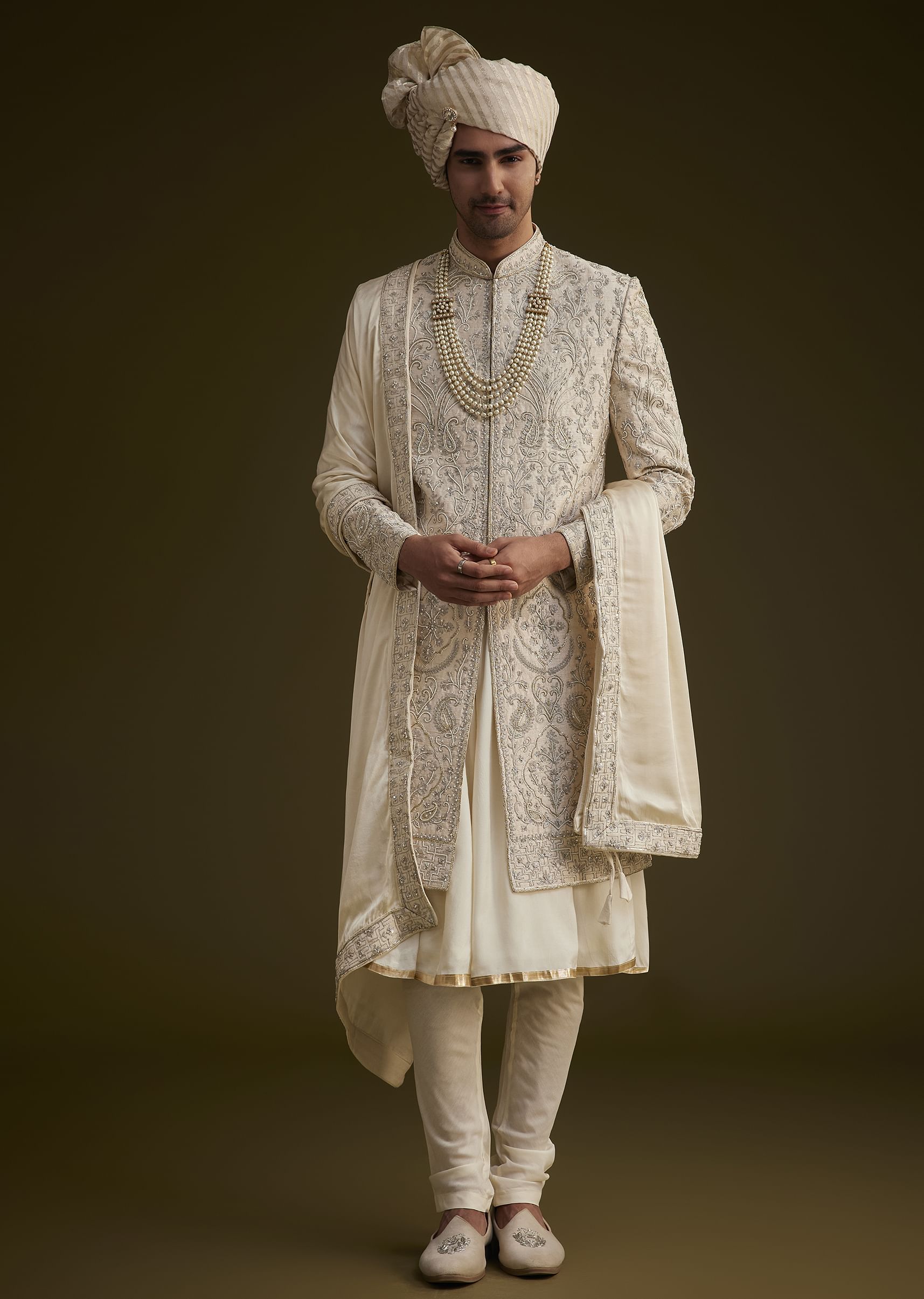 Fawn Silk Sherwani Set With Zardosi Detailing