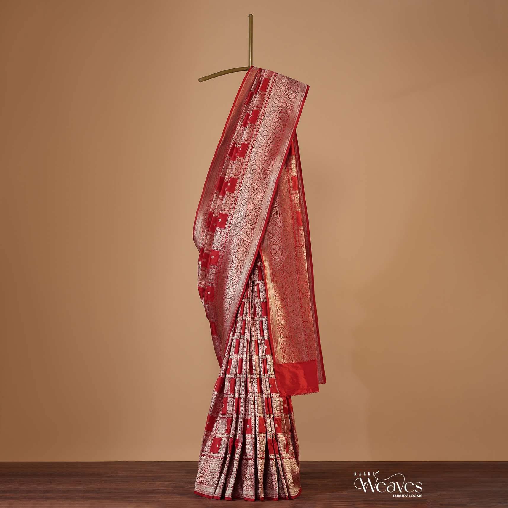 - Our premium red saree in banarasi katan silk with single zari work has a rich banarasi and intricate block butta weave all over.