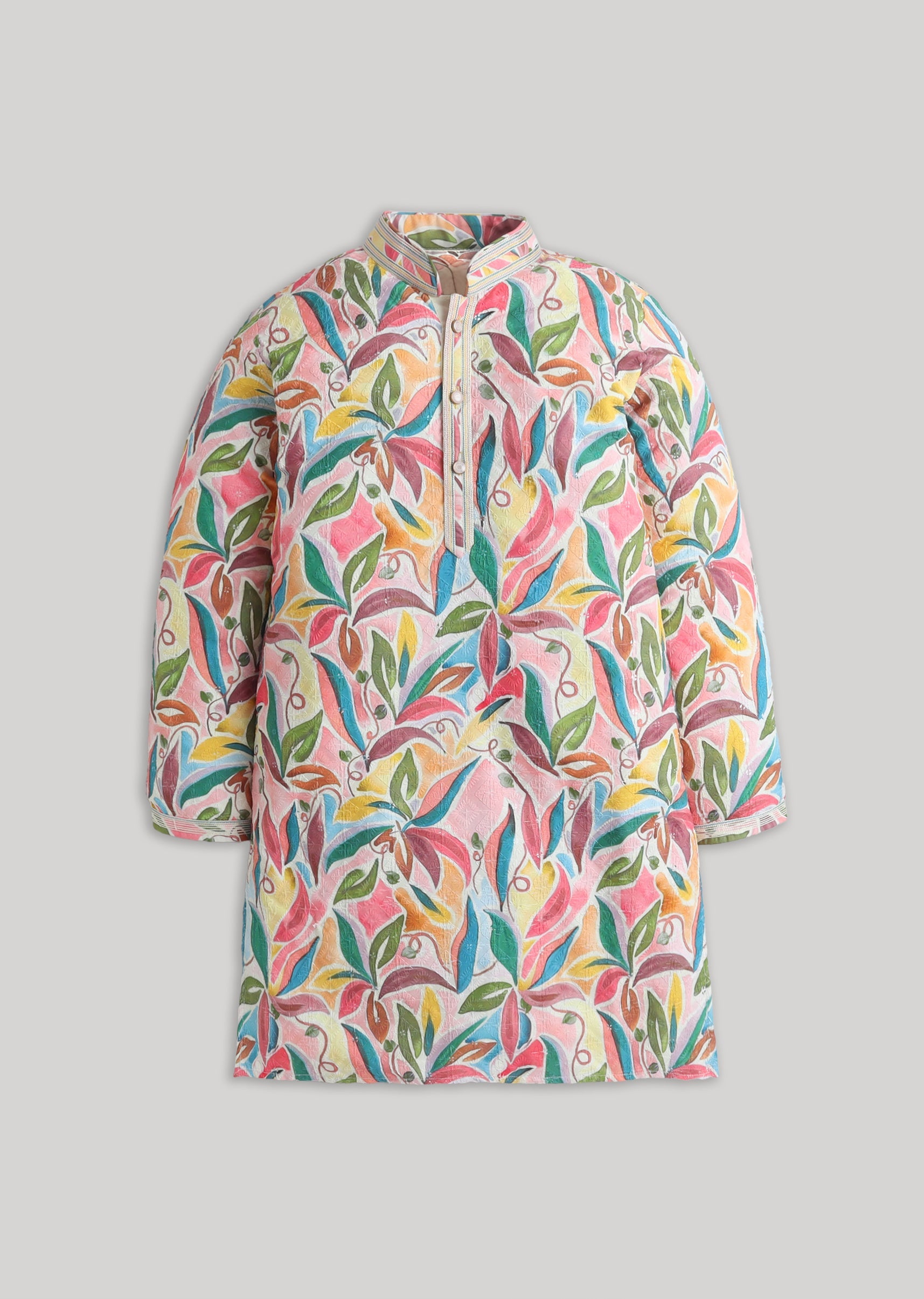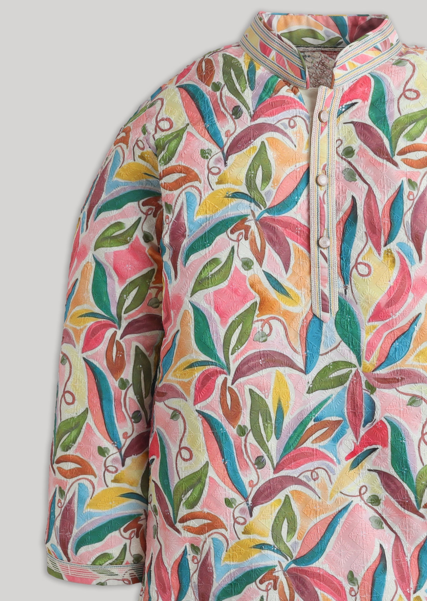 Made in breathable cotton, this festive kurta set features subtle sequin accents and a charming floral-inspired look. The mandarin collar and full sleeves maintain a classic appeal, while the matching... More Product Details