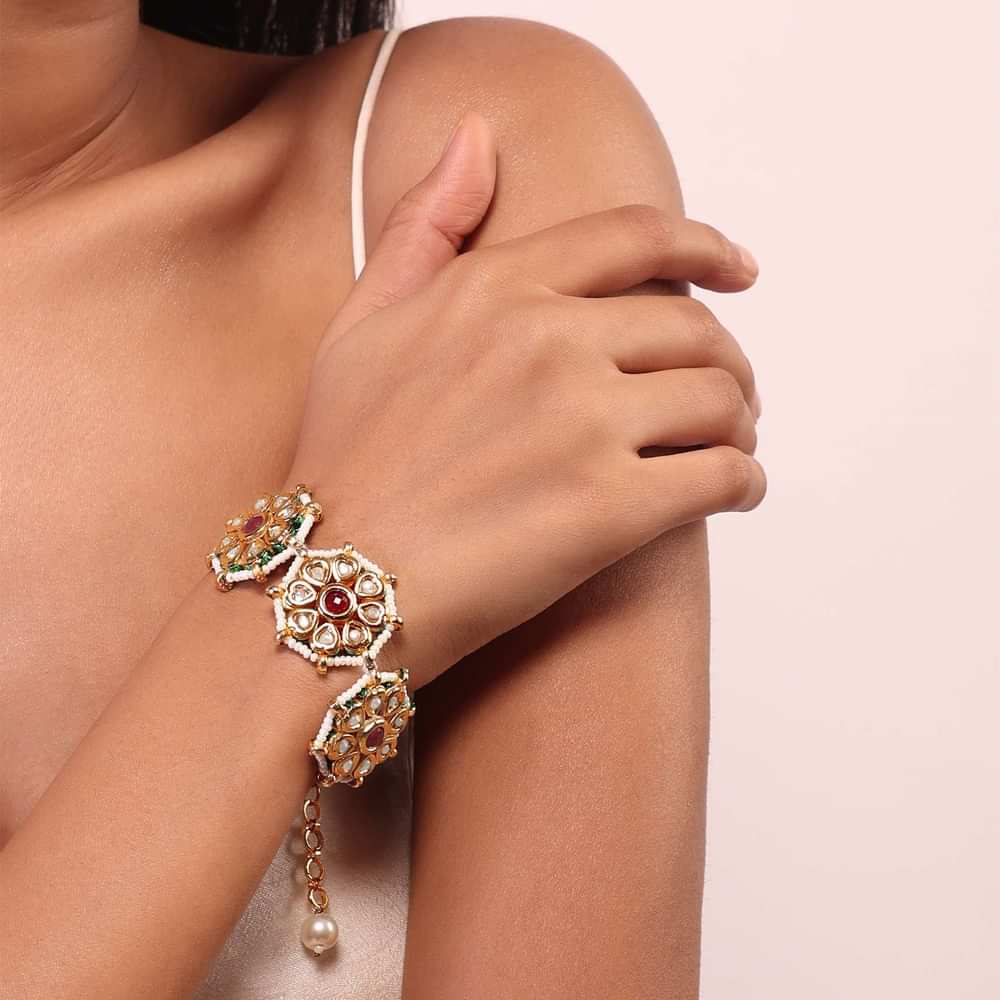 - The semi-precious kundan stones and pearls in this bracelet are paired beautifully that will surely adorn your wrist.