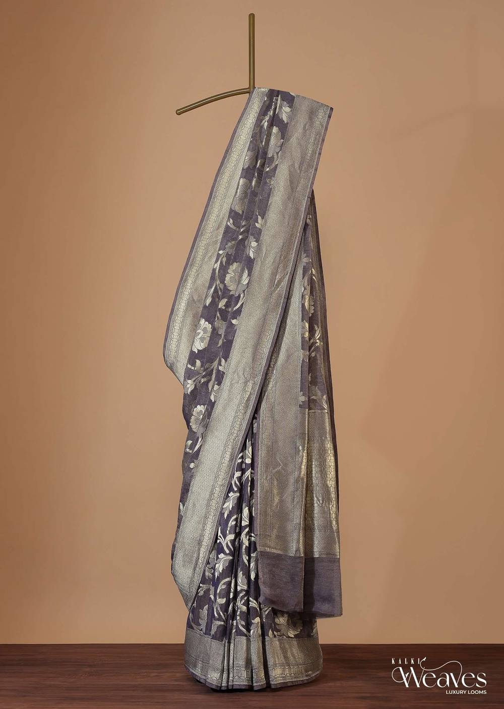 Fog Grey Saree In Tissue Georgette With Banarasi Zari Weave And An Unstitched Blouse