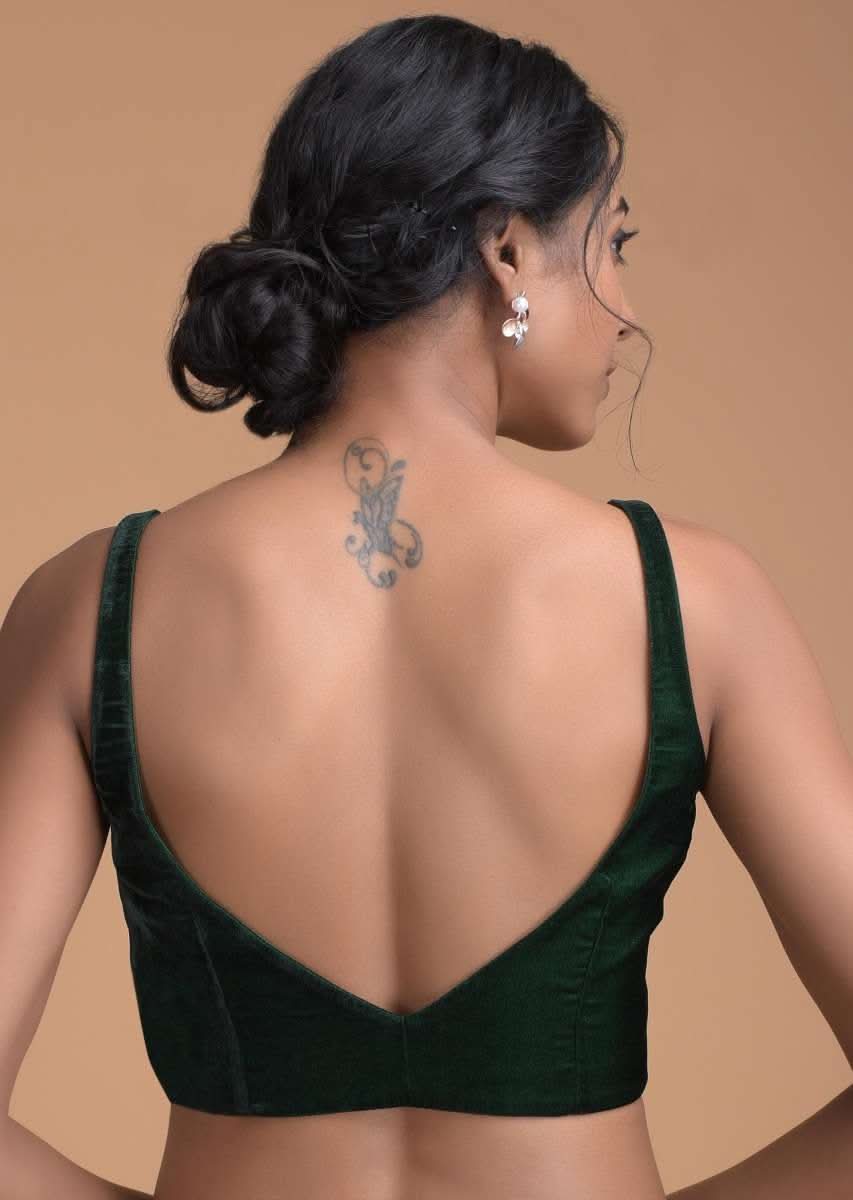 - Forest green sleeveless blouse in velvet with sweetheart neckline.