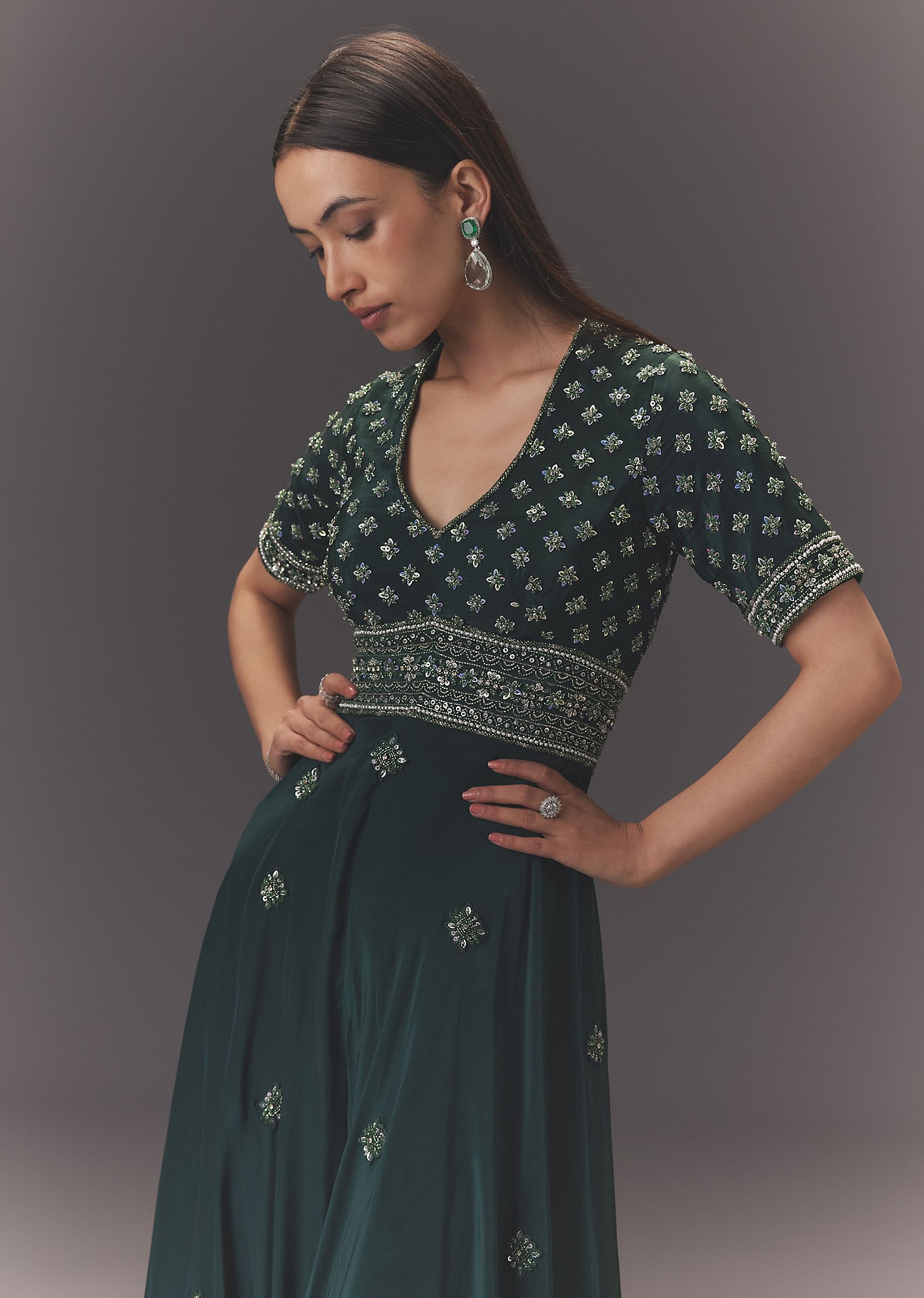 This forest green jumpsuit features a V neck blouse with a broad belt and sharara style pants.Butti accents add unique detailing while the layered design creates a flowy silhouette.Perfect for... More Product Details