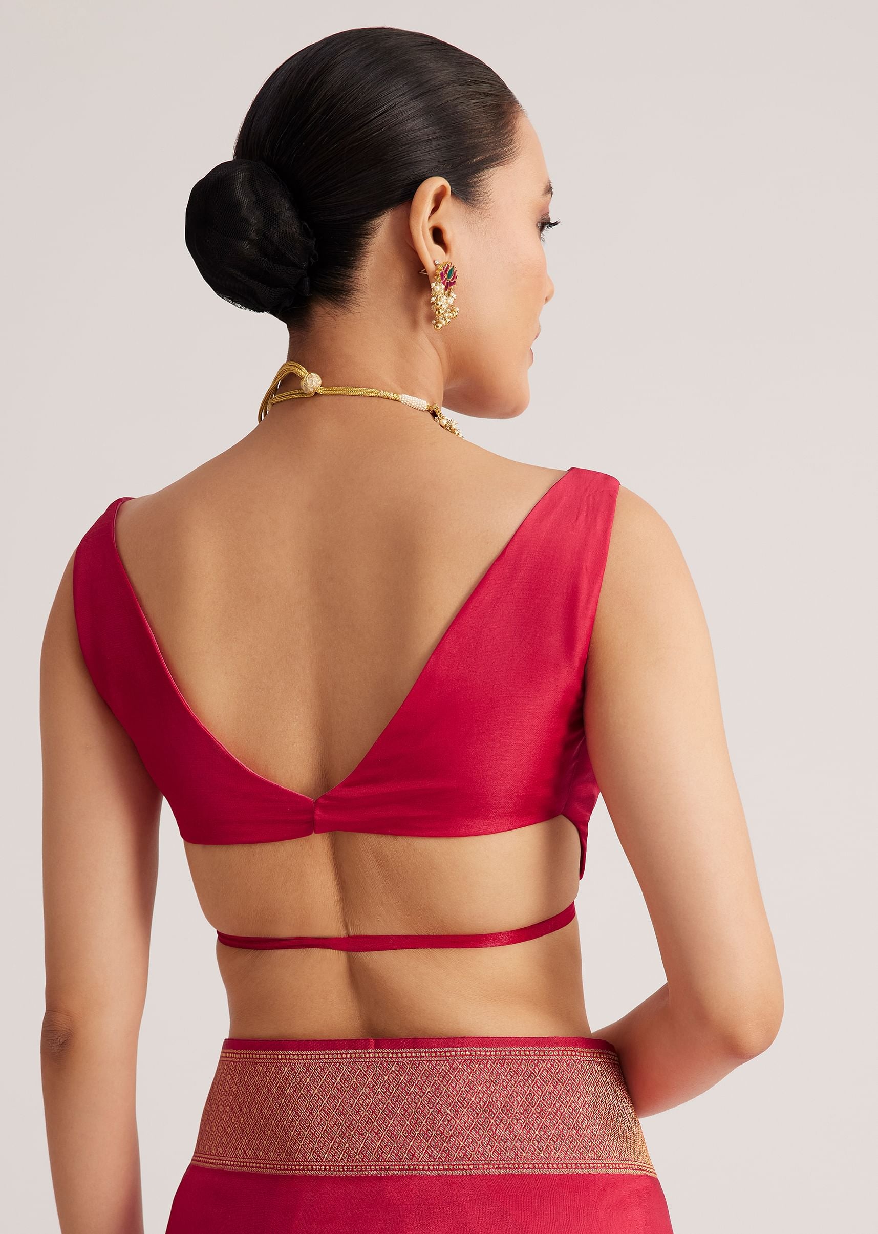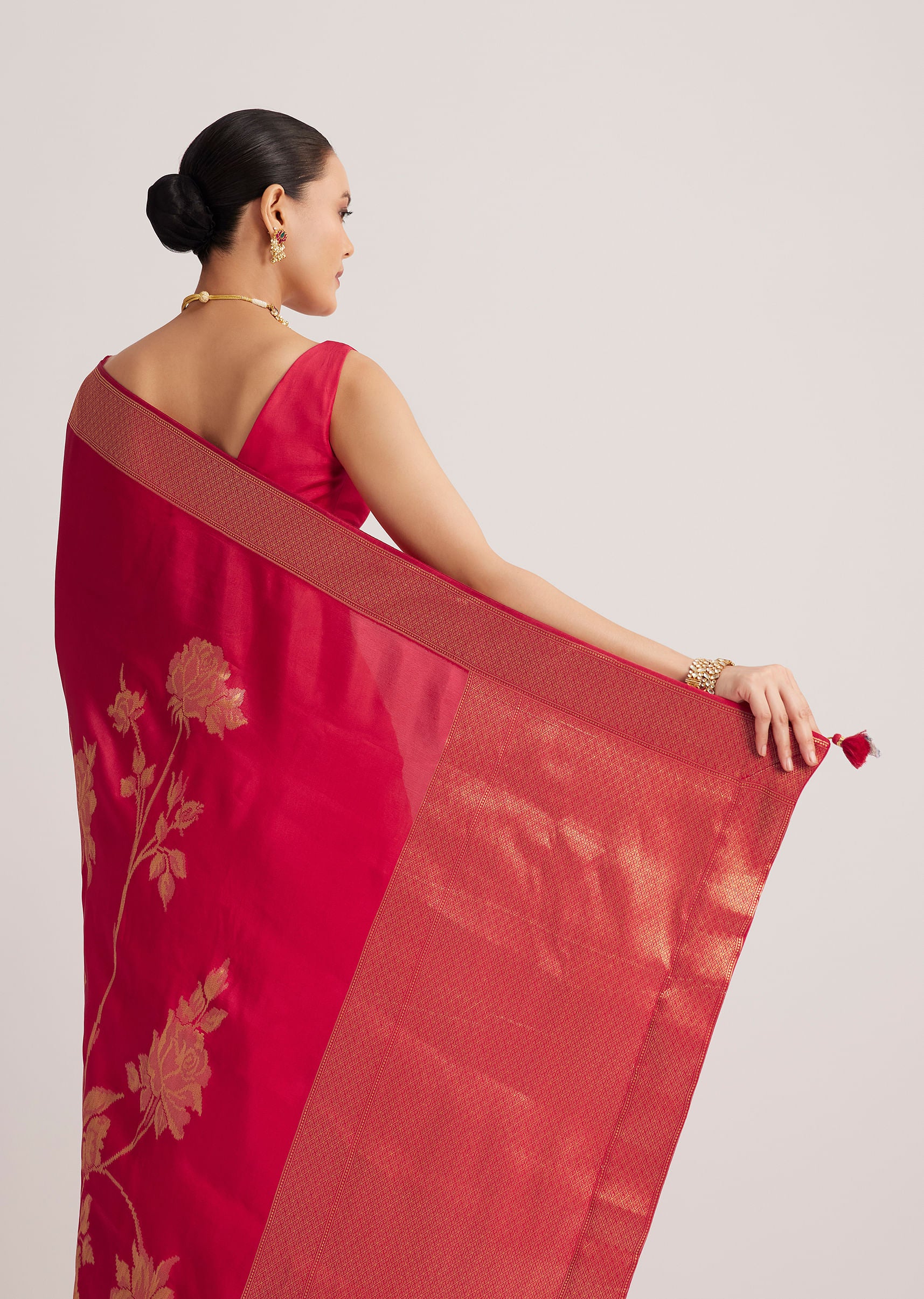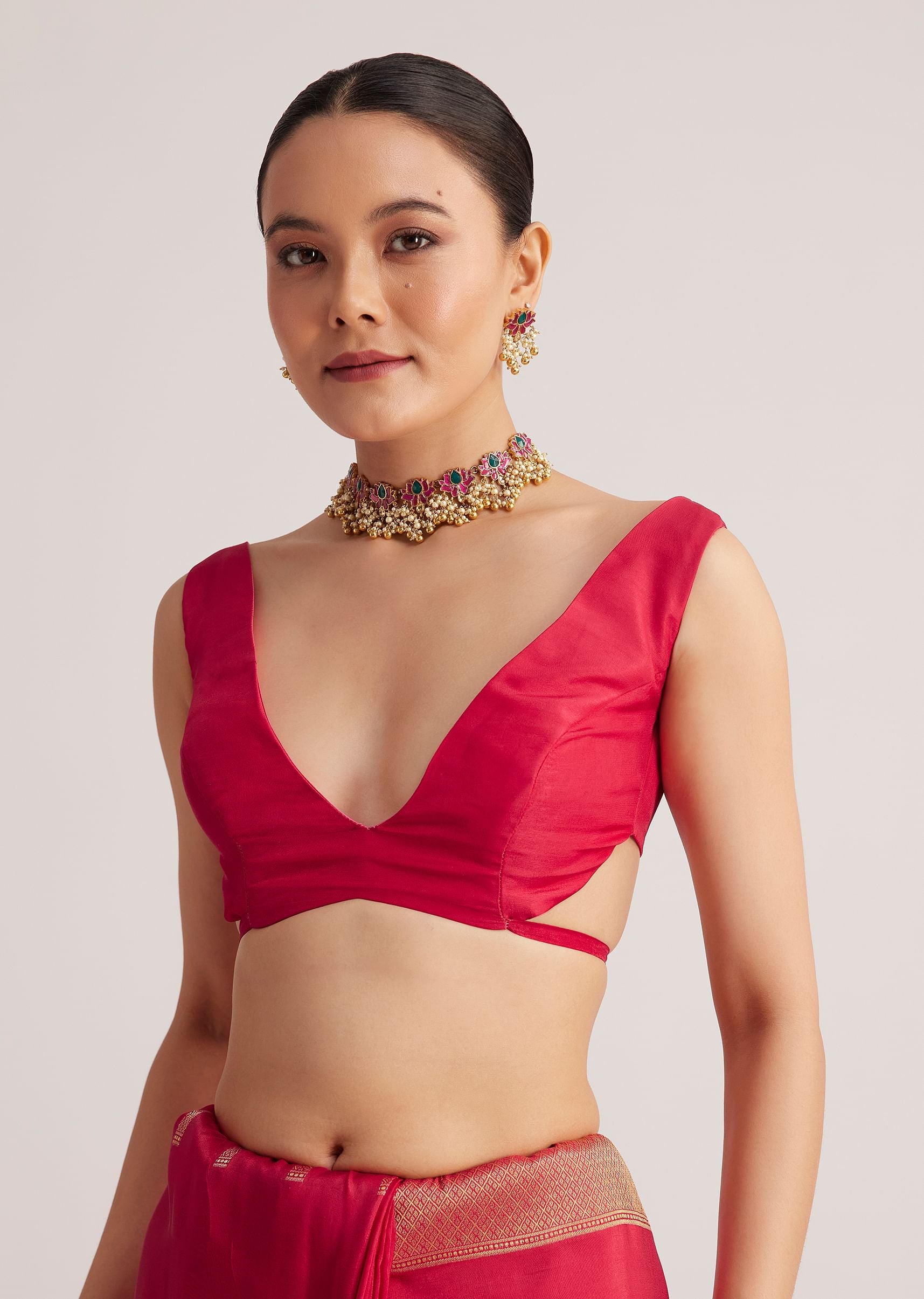 Pair this saree with a pearl choker and soft curls for an effortlessly elegant look.