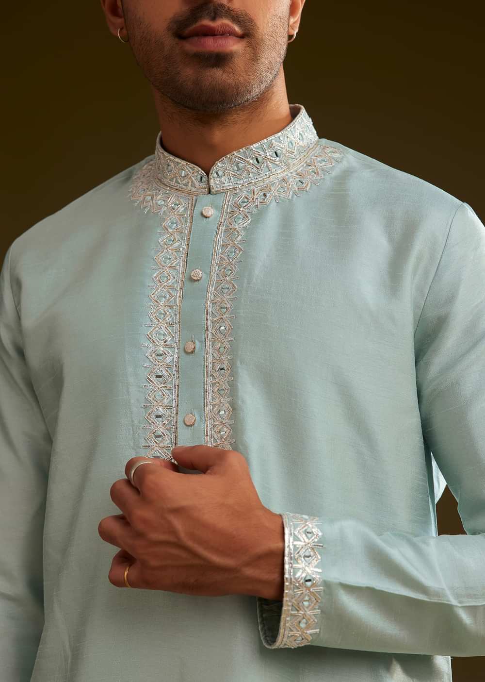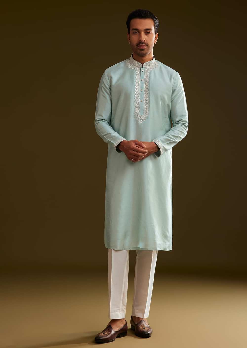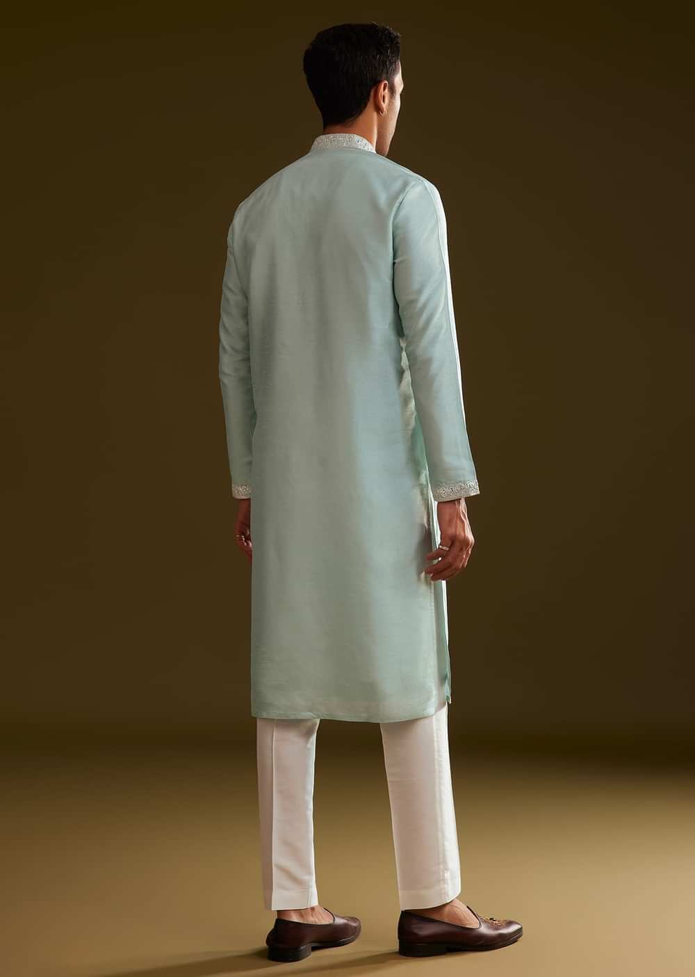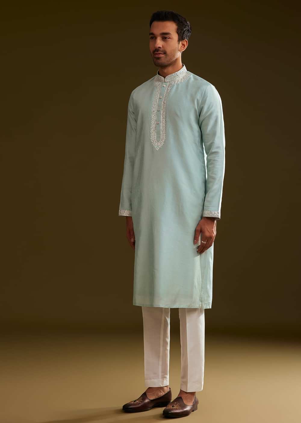Step into understated elegance with this glacier blue silk kurta set, adorned with delicate embroidery on the yoke. The refined detailing enhances the neckline, lending a touch of sophistication to... More Product Details