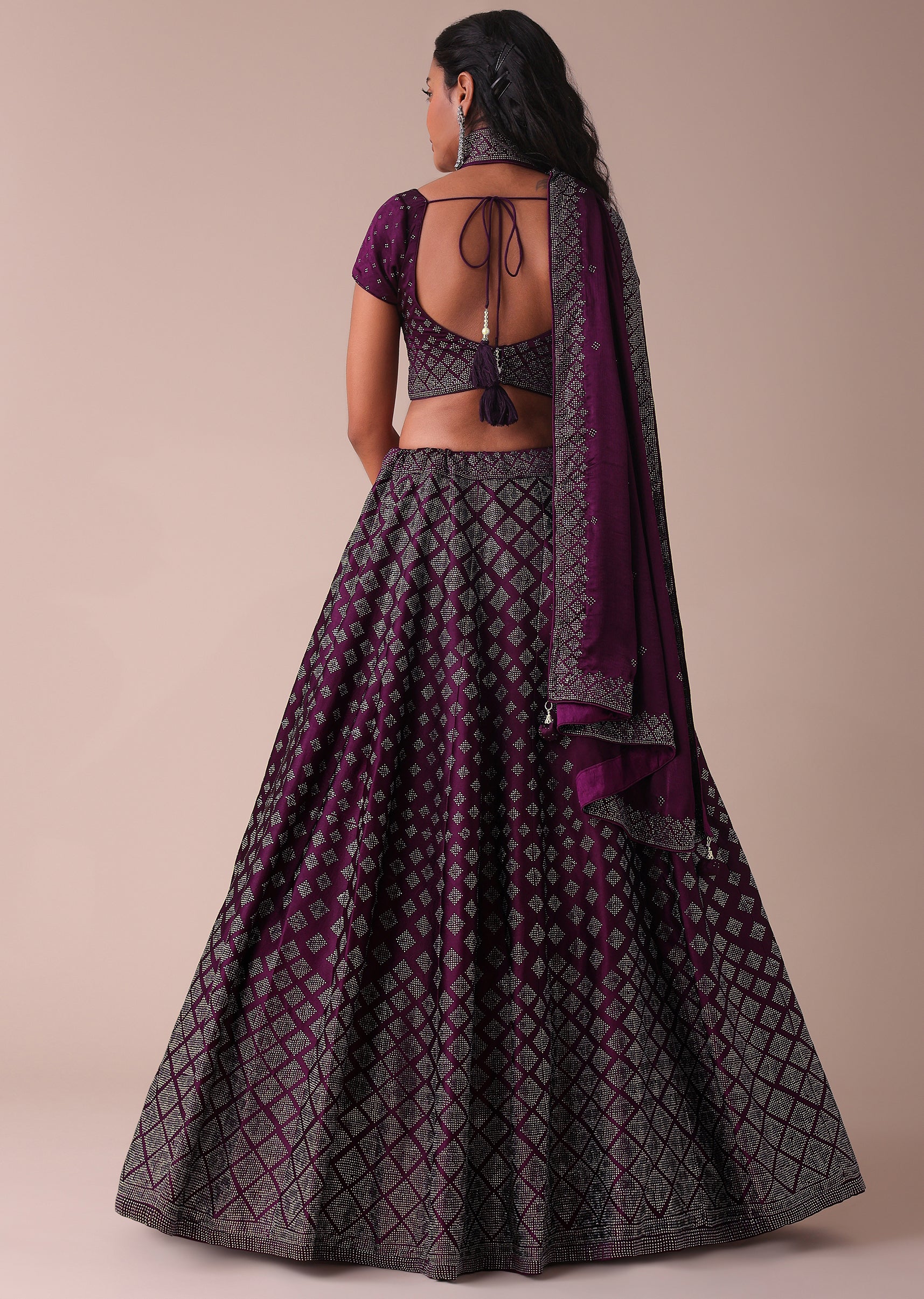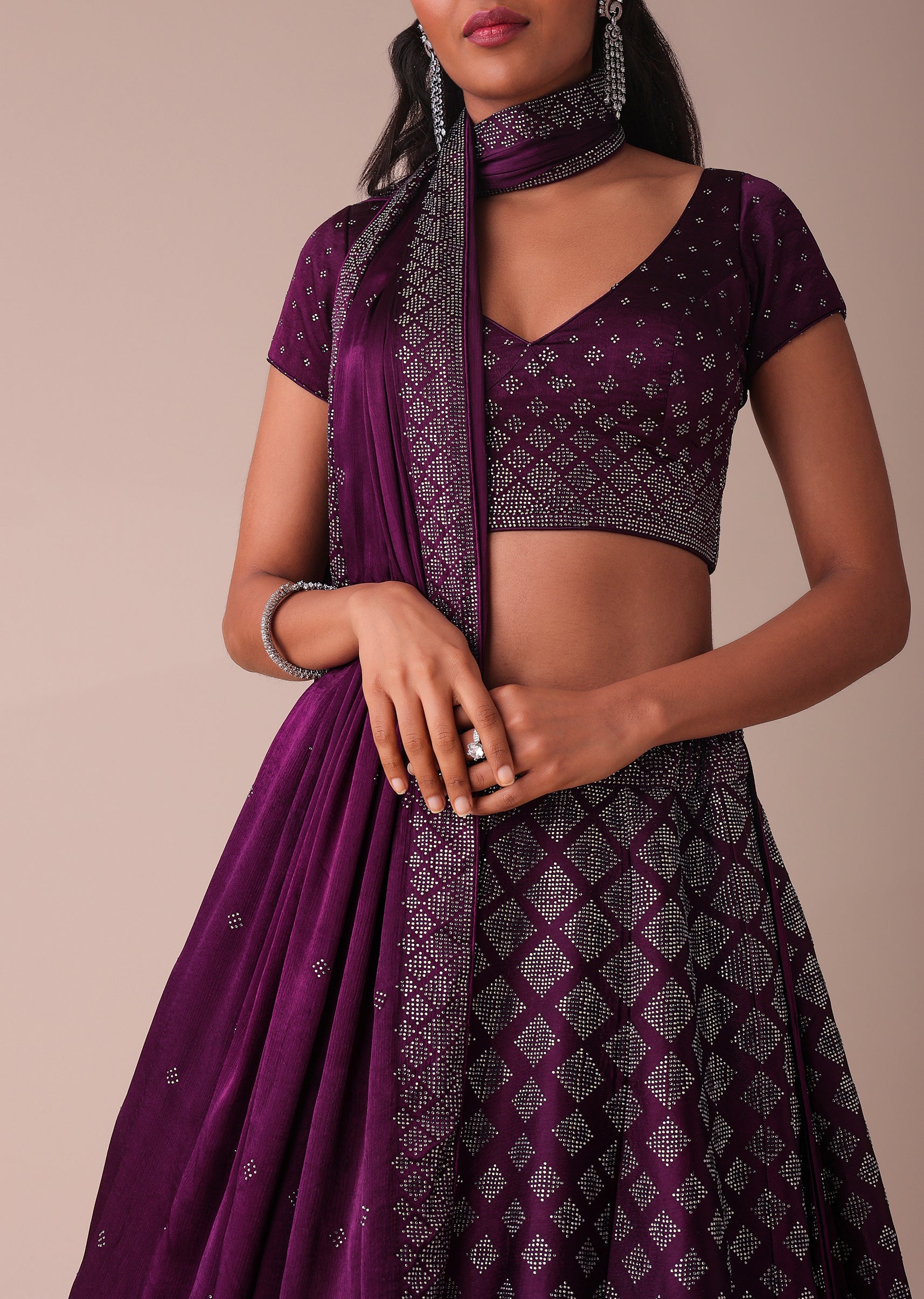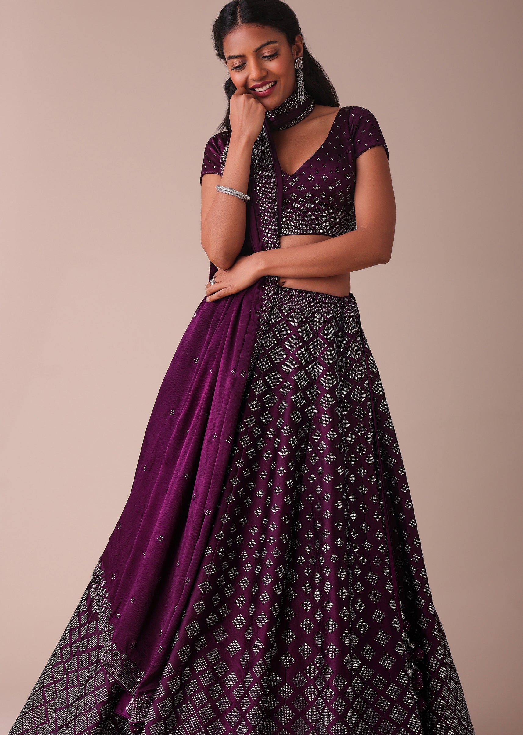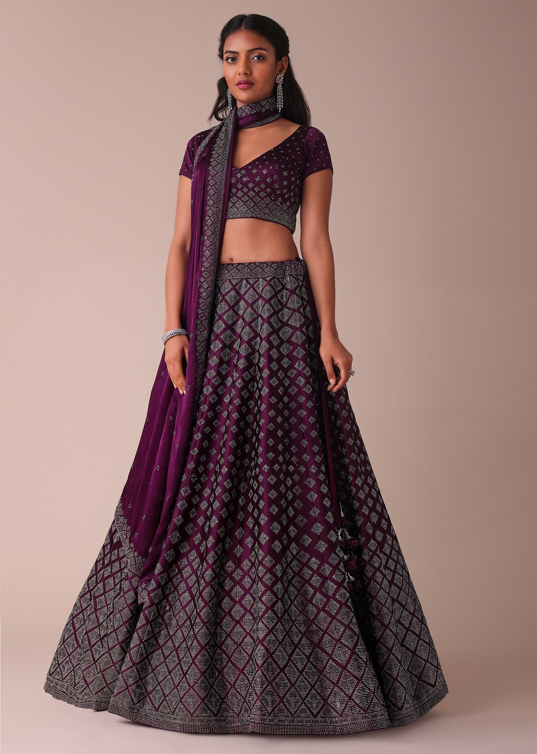 Plum Purple Swarovski Embellished Lehenga In Wrinkle Satin