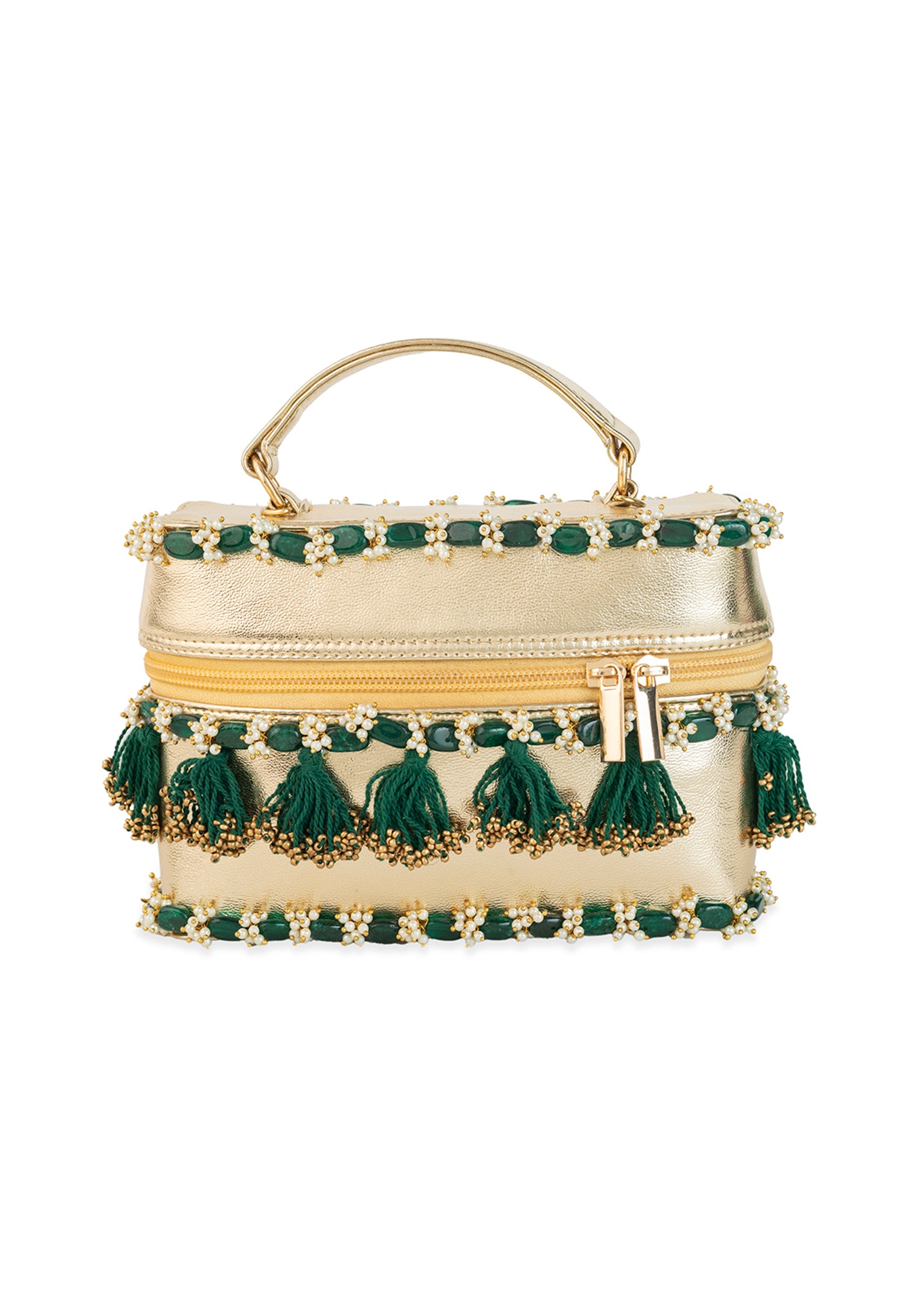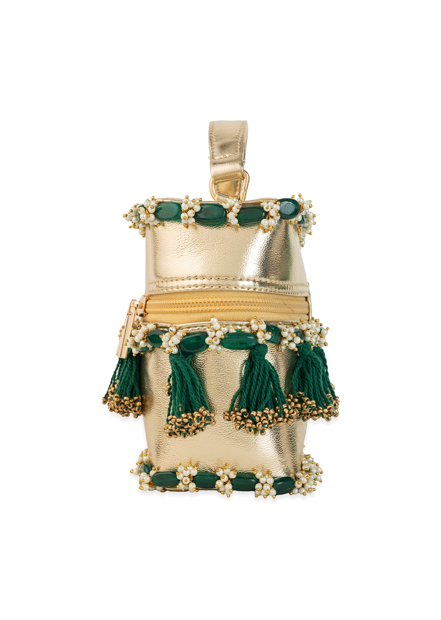 Gold and Green Tassel Drop Bead Embroidered Potli Bucket Bag