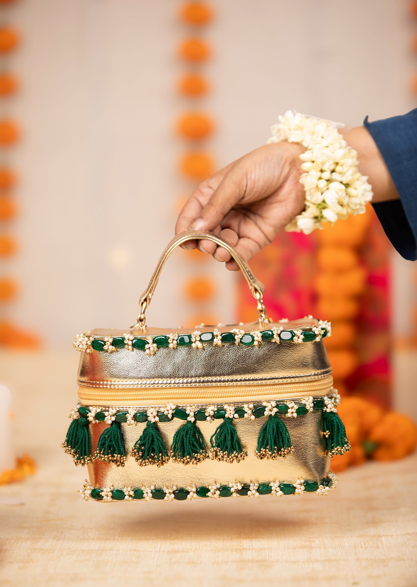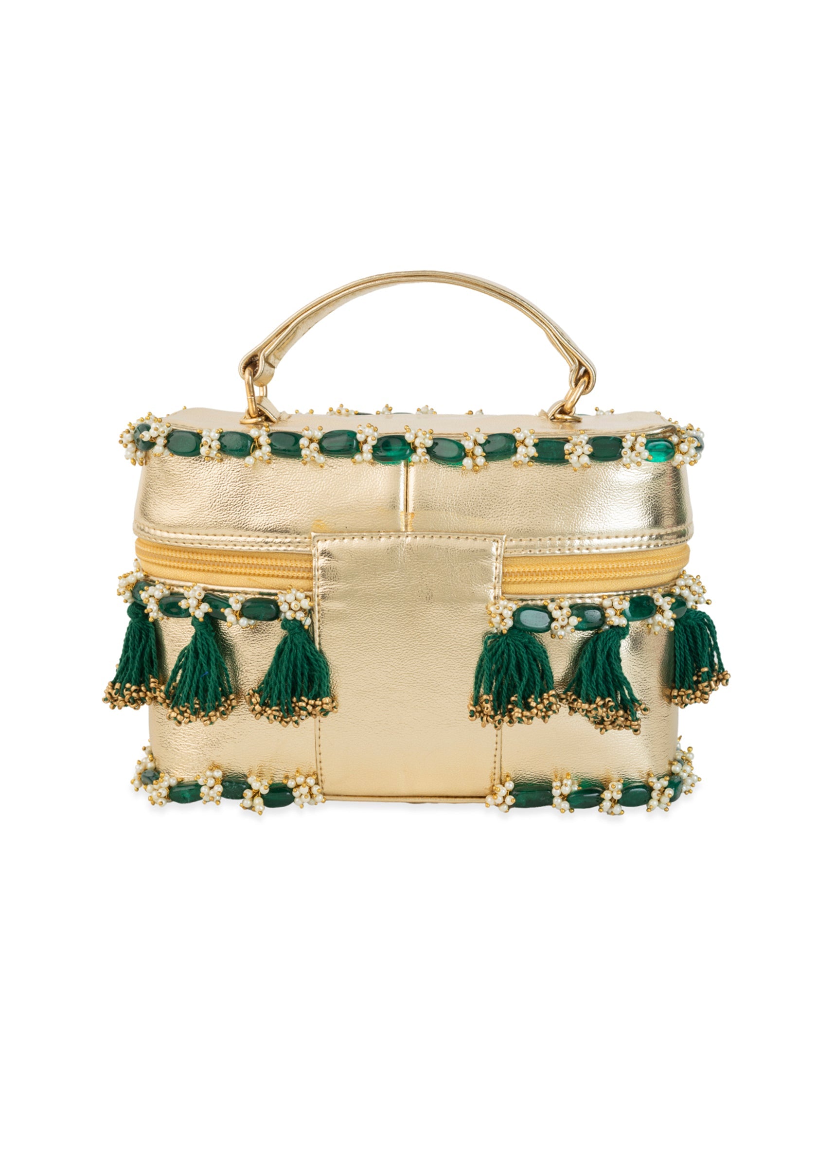 Make a festive statement with this gold and green potli bucket bag, adorned with intricate bead embroidery and playful tassel drops for added flair. The structured silhouette and front zip... More Product Details