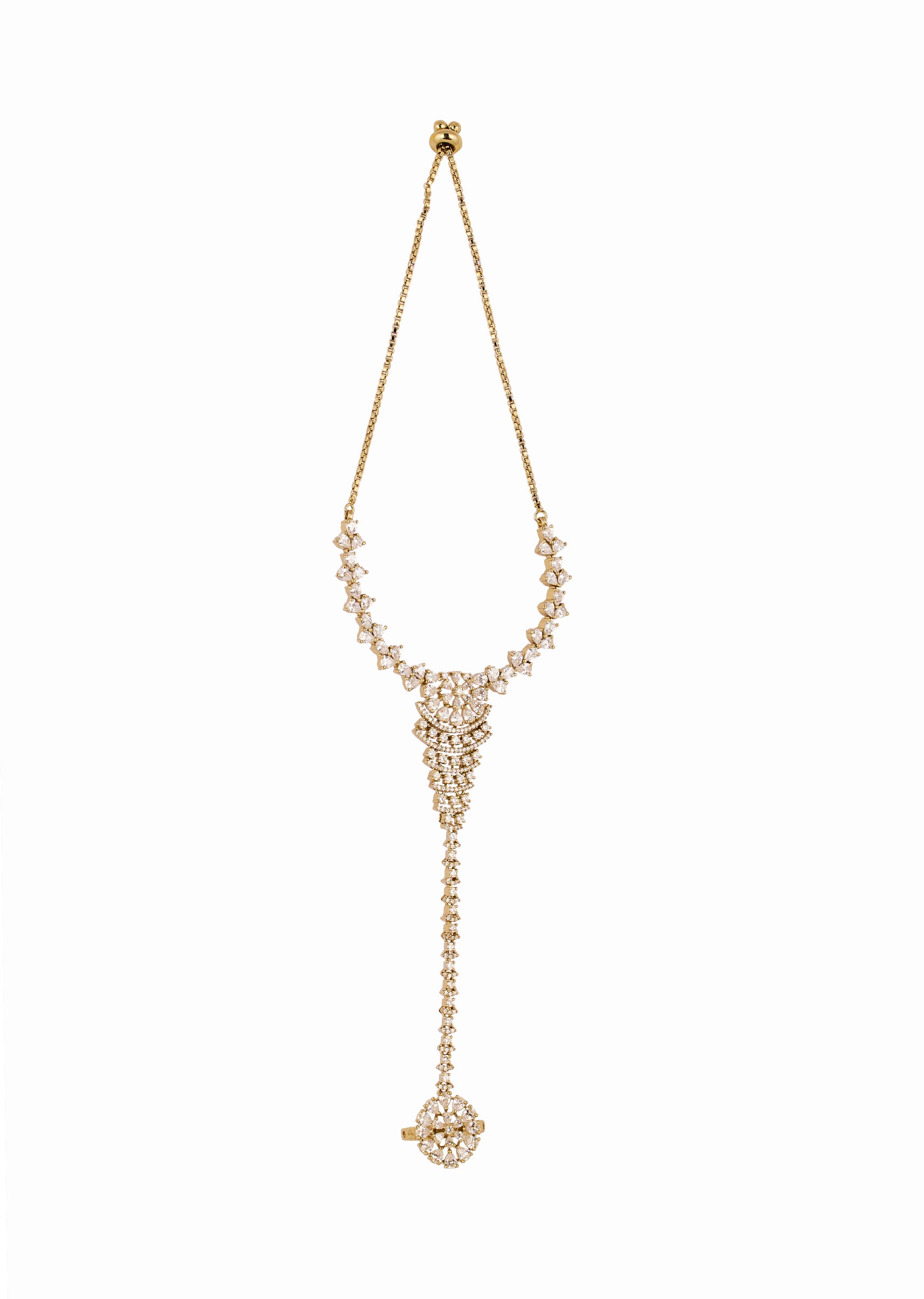 Crafted to add a touch of refined sparkle, this CZ diamond look haathphool is crafted in durable rhodium plated brass with an anti tarnish finish for long lasting brilliance. The shimmering stones create a graceful flow across the hand, making it an elegant accent for bridal and festive looks alike. Its delicate design balances tradition with contemporary charm, elevating every gesture with subtle glamour. Awarded as the Most Trusted Brand, we're delivering styles you love, just as promised.