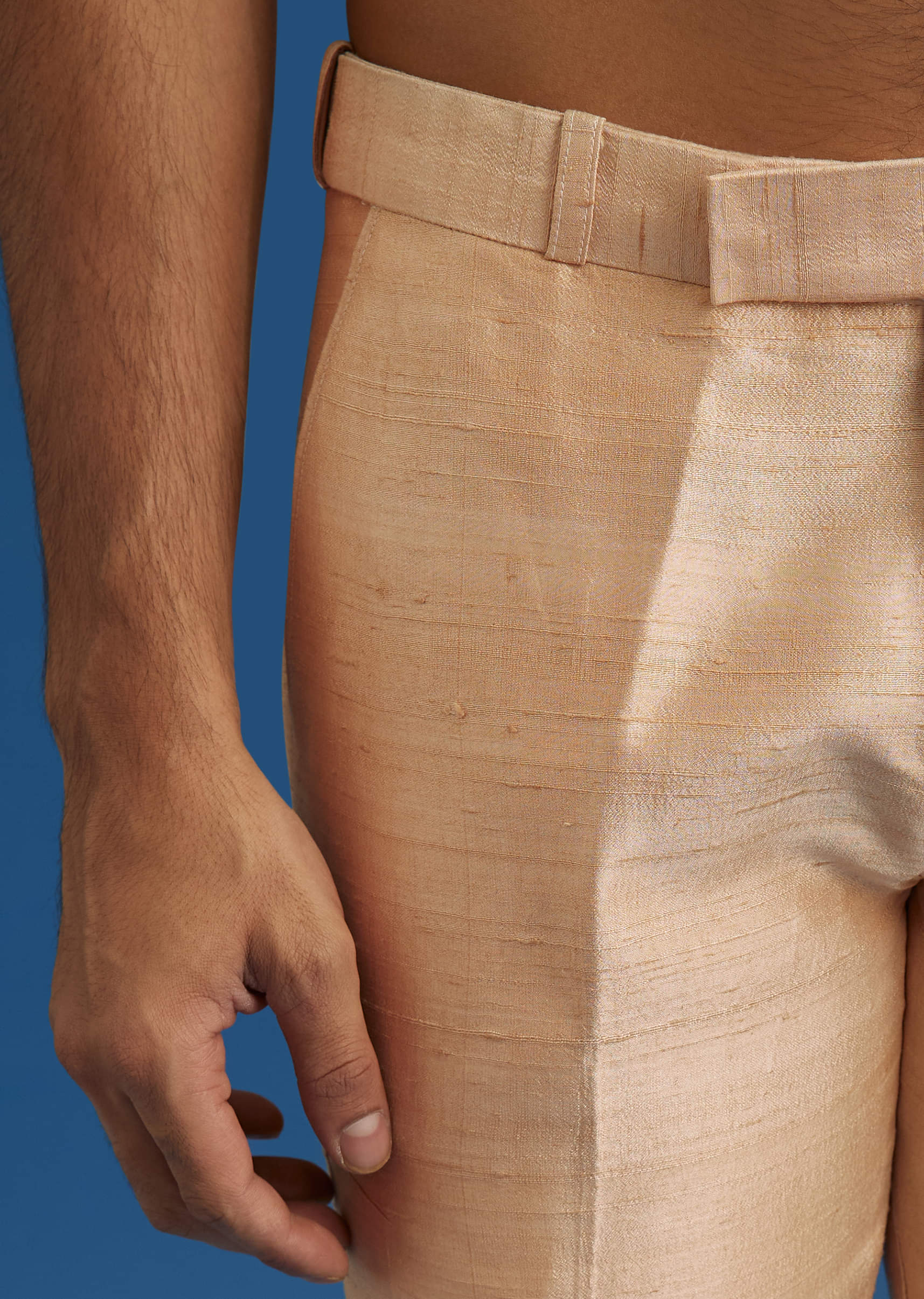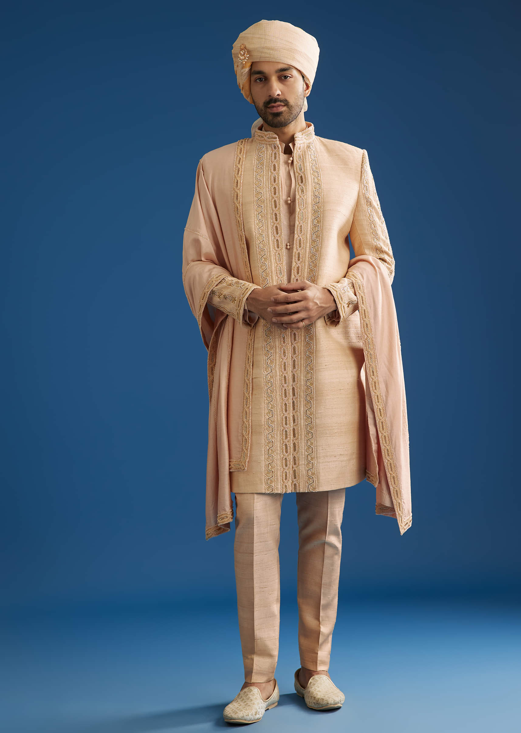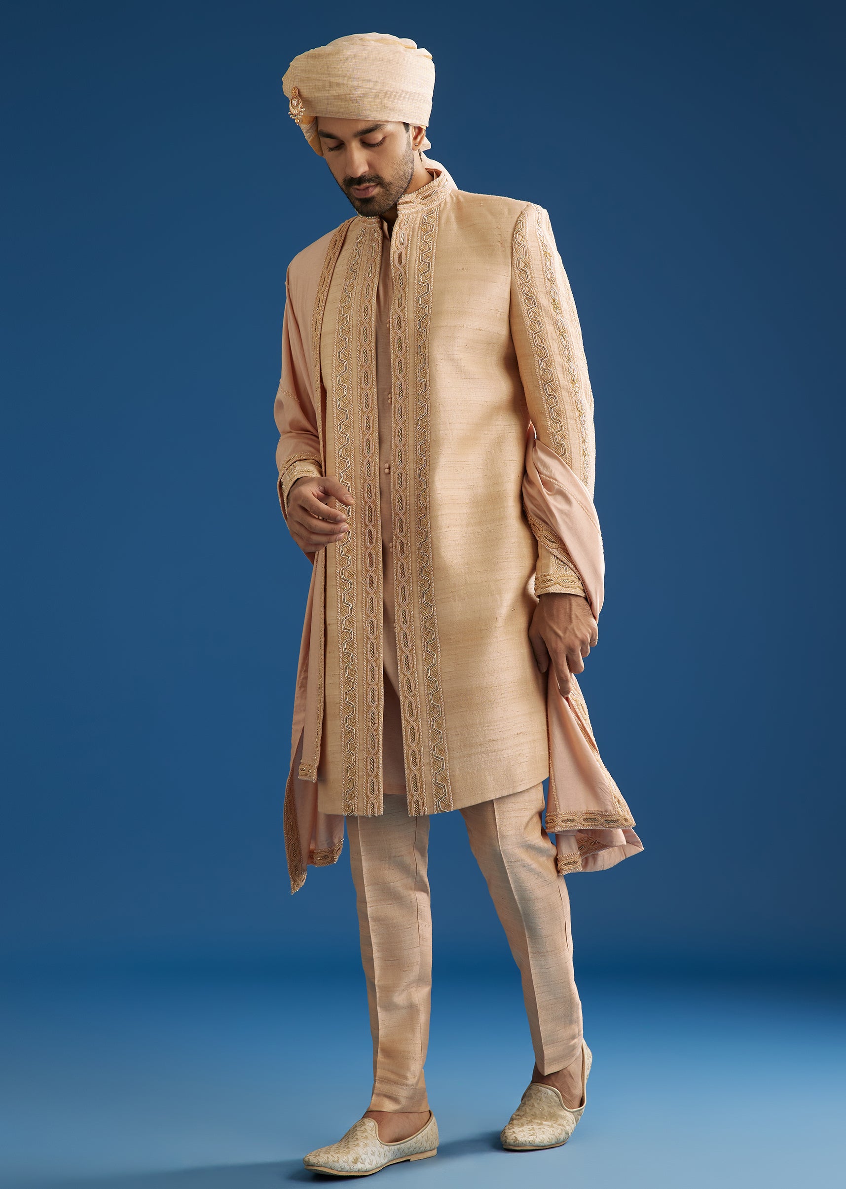 Designed in a warm gold beige raw silk, this sherwani features self and gold detailing with beads and cutdana. A regal pick for grand functions. Awarded as the Most Trusted Brand, we're delivering styles you love, just as promised.