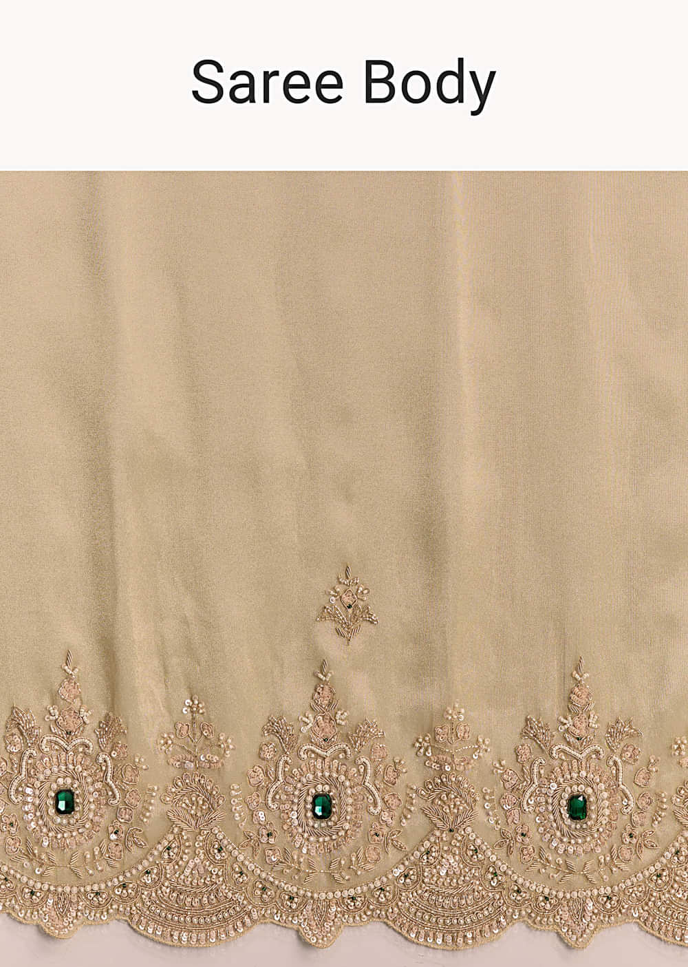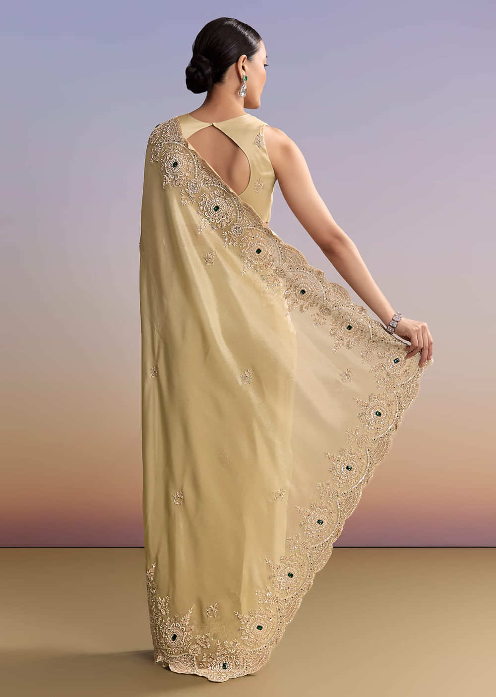 Golden hues in this beige tissue saree bring a regal glow, further enhanced by heavy scallop borders and embroidered buttis all over. Cutdana, sequins, beads, stones, and emerald stone detailing... More Product Details