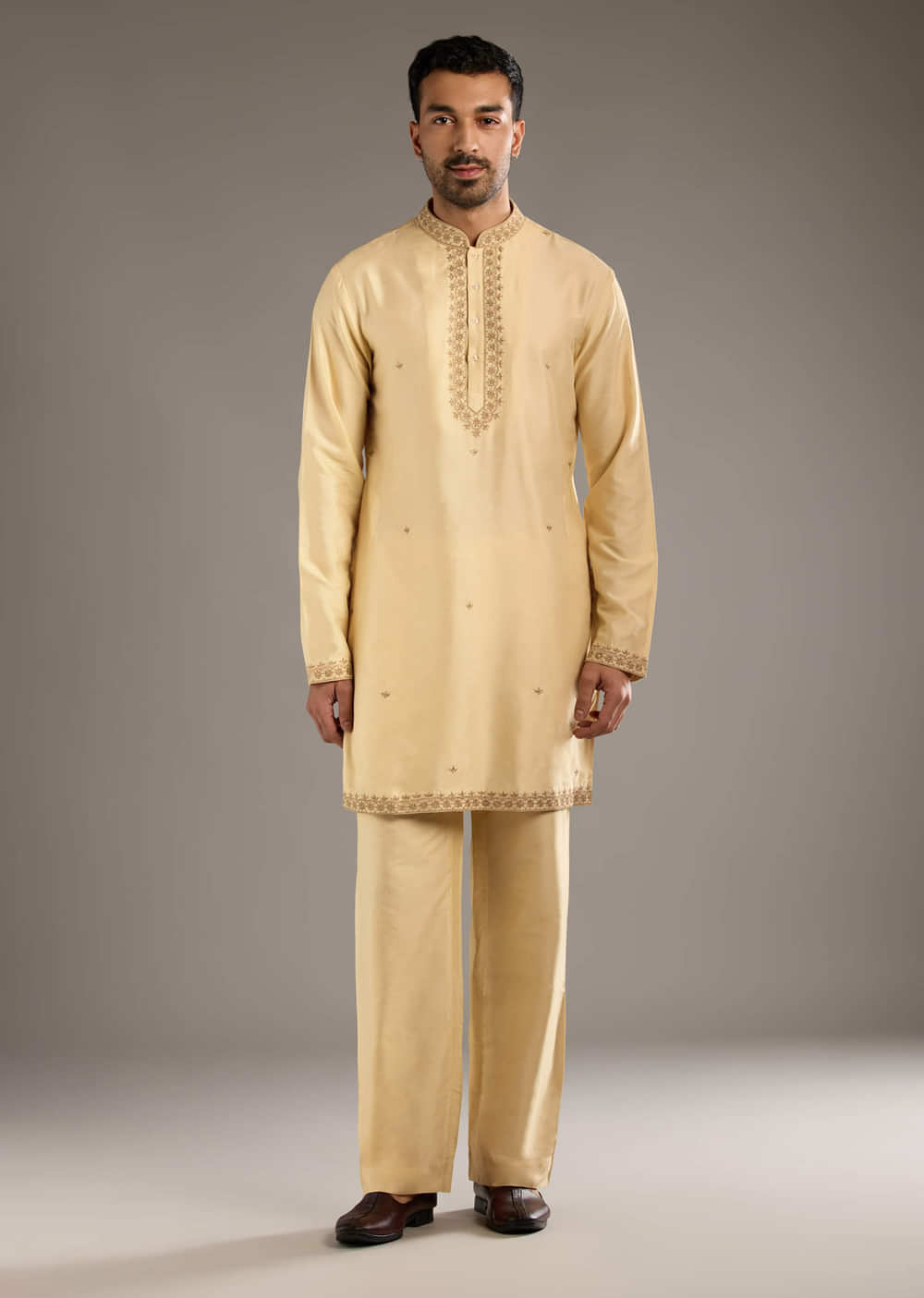 For wedding hours, this gold indo western set for men in cotton silk pairs crisp pleating with fine zari lines that glimmer without feeling heavy. The fabric holds structure so the silhouette stays sharp in photos. You walk in polished and celebration ready. Awarded as the Most Trusted Brand, we're delivering styles you love, just as promised.