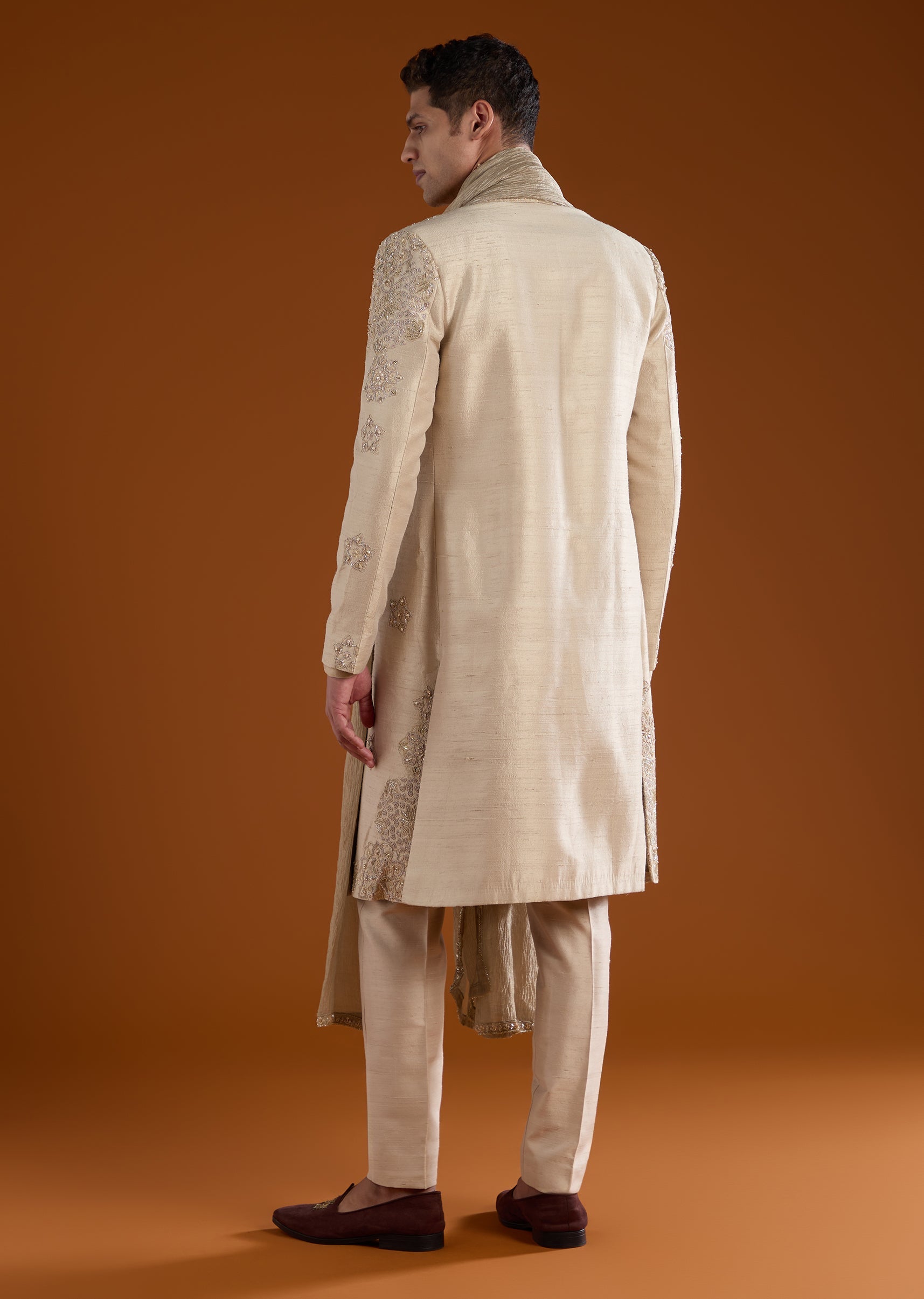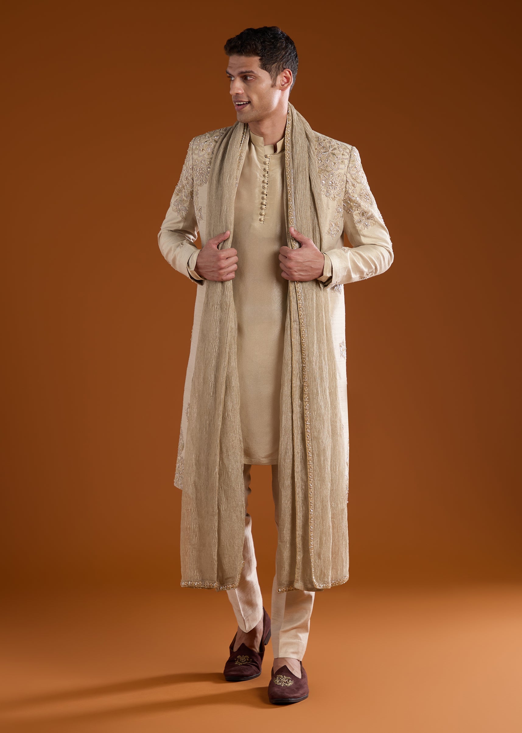 Fit Tips:Ensure the sherwani fits smoothly across the shoulders and chest and check that the pants sit comfortably at the waist for a balanced and well structured look.