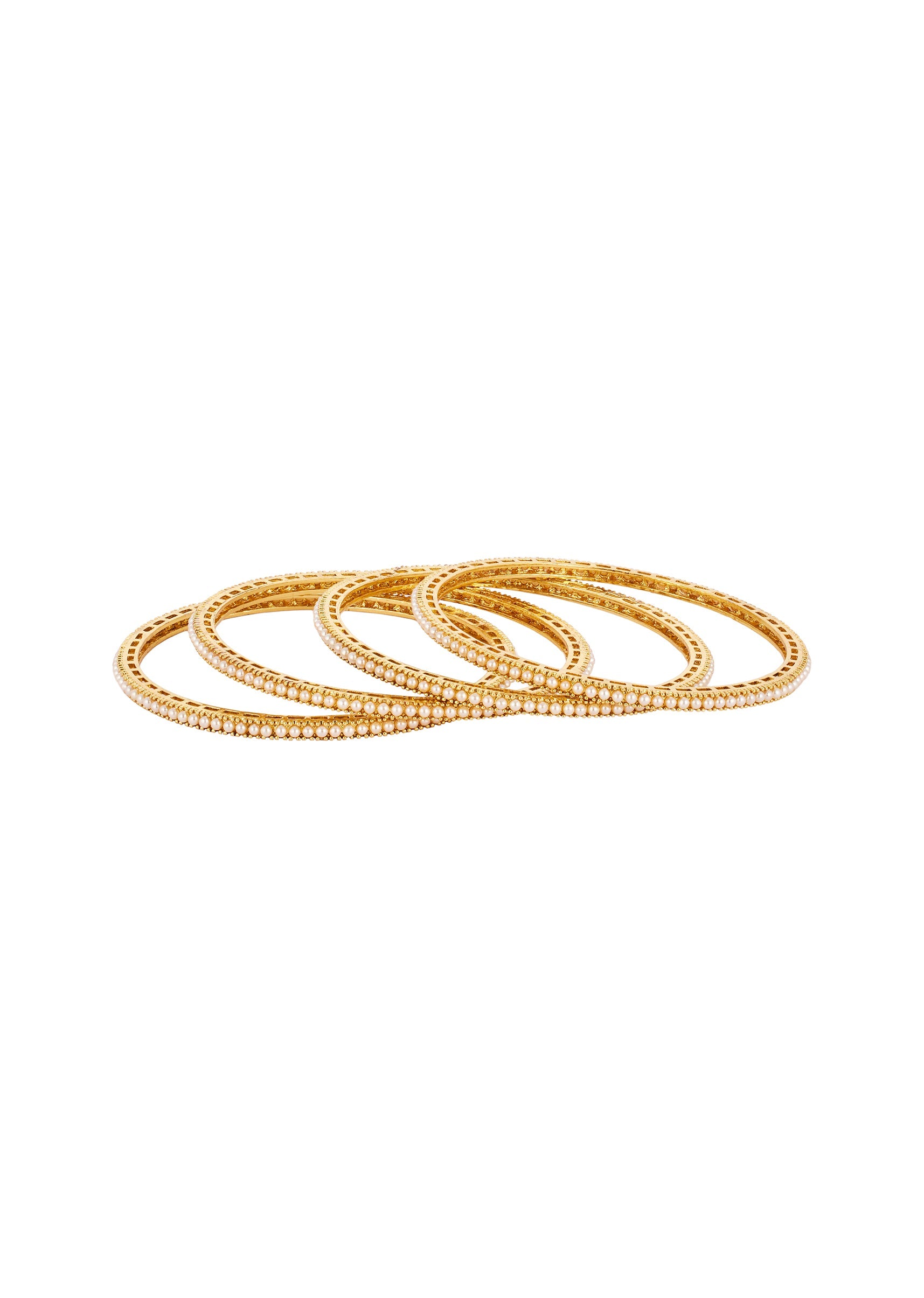 A pair of elegant bangles in a radiant gold finish featuring intricately crafted traditional temple motifs adorned with white faux pearls. The delicate pearls add a soft and graceful touch, making these bangles perfect for weddings, festive occasions, or as statement accessories for bridesmaids and family members. Awarded as the Most Trusted Brand, we're delivering styles you love, just as promised.