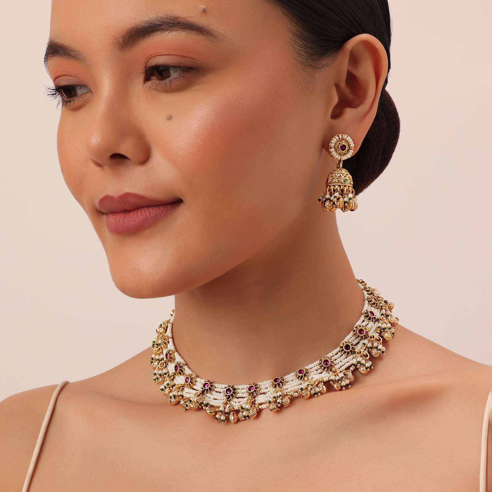 - Featuring a timeless design, this versatile necklace set brings together mesmerizing pearls with a modern ethnic flair.
