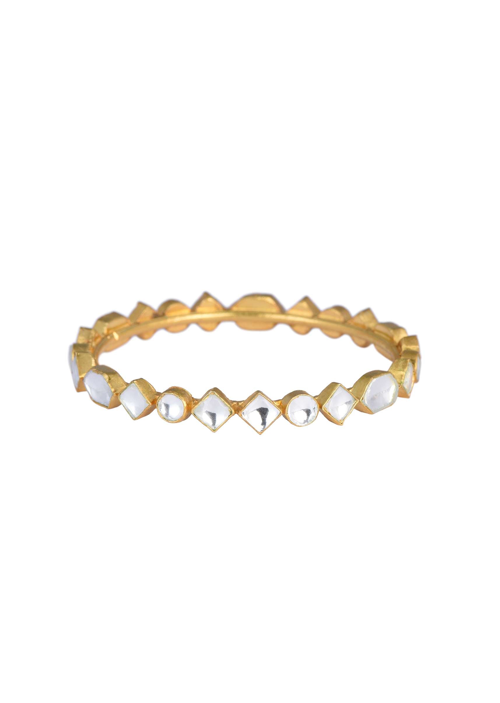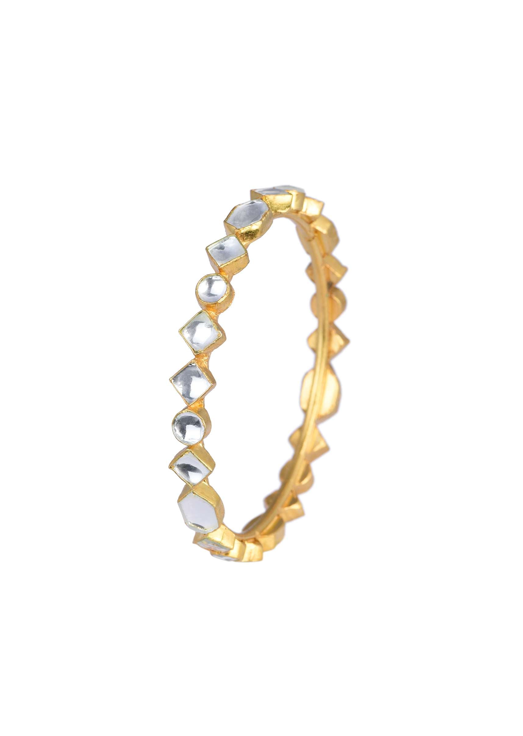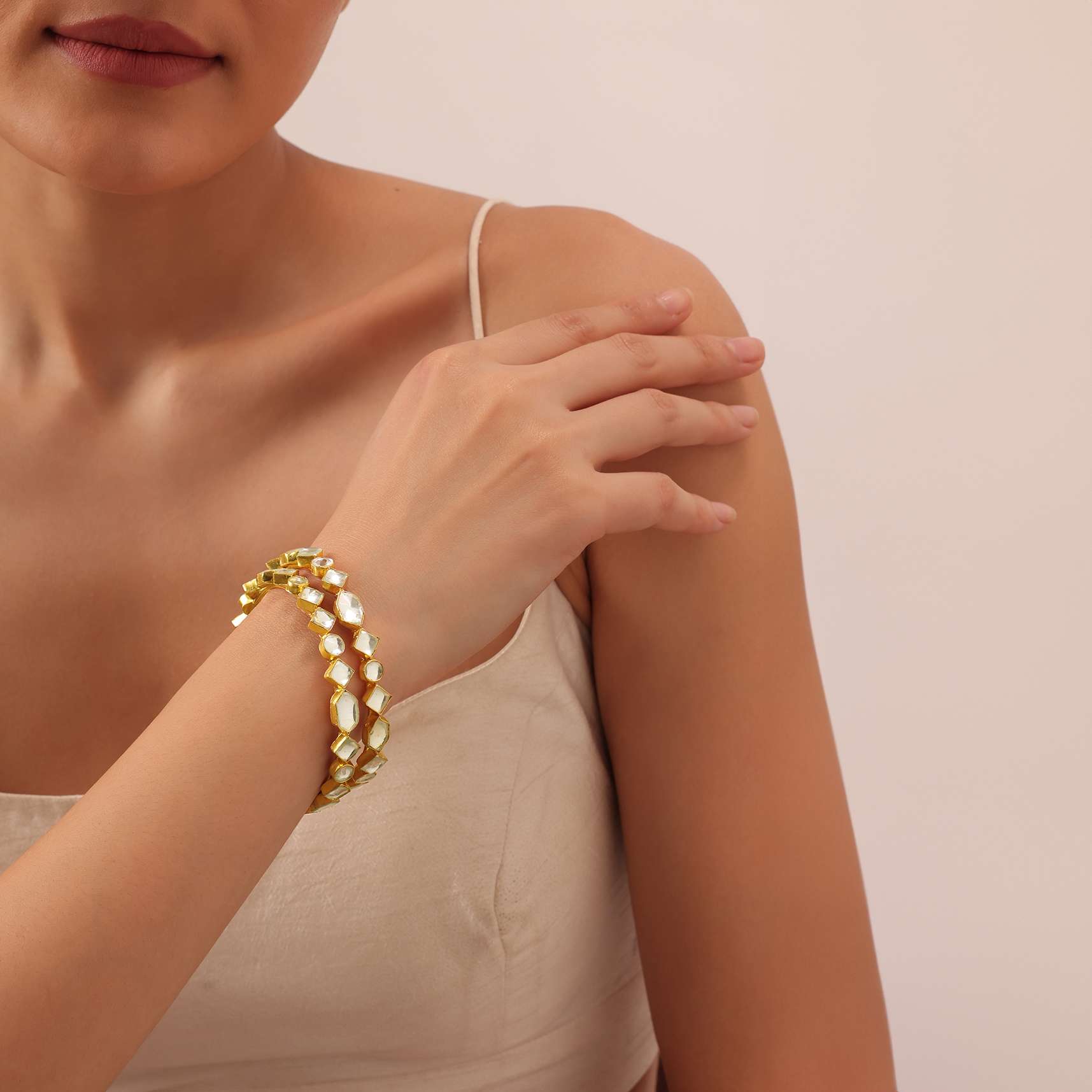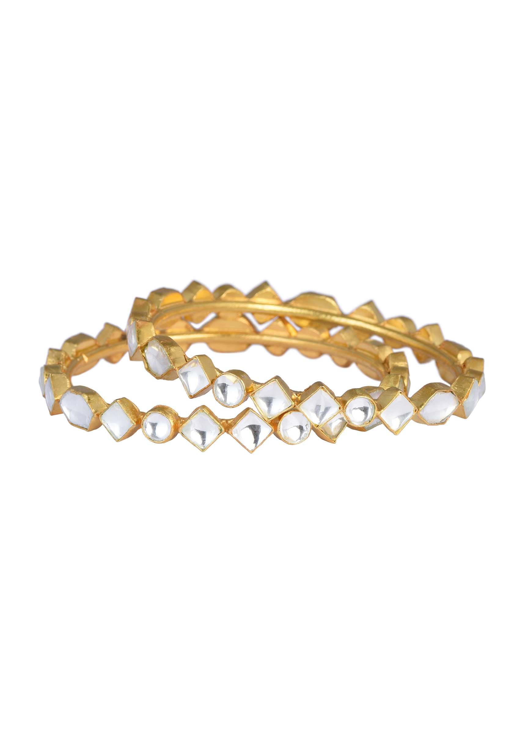 Gold Finish Dainty Bangle With Studded Kundan And Geometric Motifs Set of 2