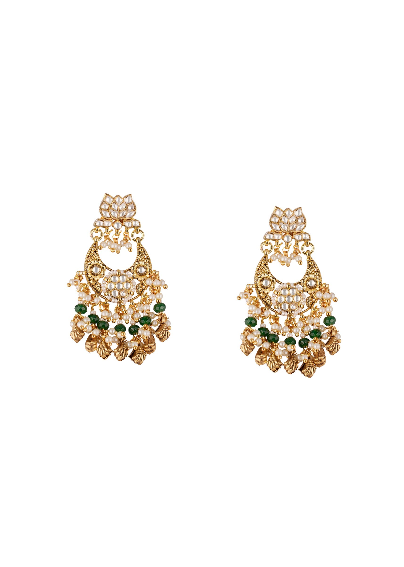 Gold Finish Earrings In Chandelier Style With Kundan And Green Stone And Pearl Detailing