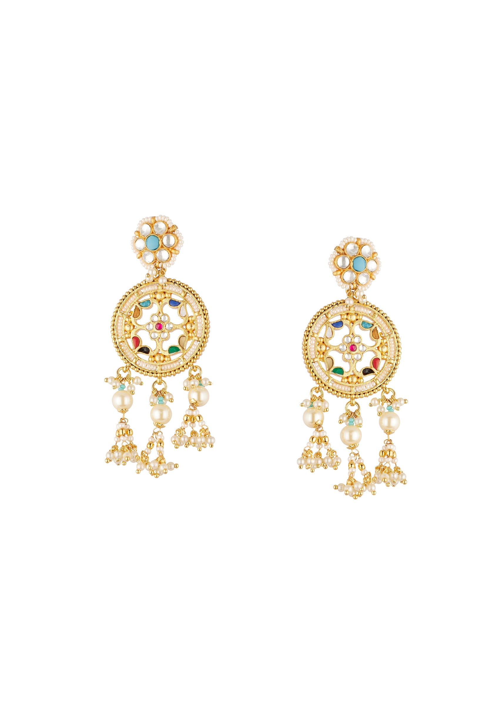 Gold Finish Earrings With Traditional Temple Motifs And Green Purple Red Yellow and Blue Simulated Stones And Faux Pearls.