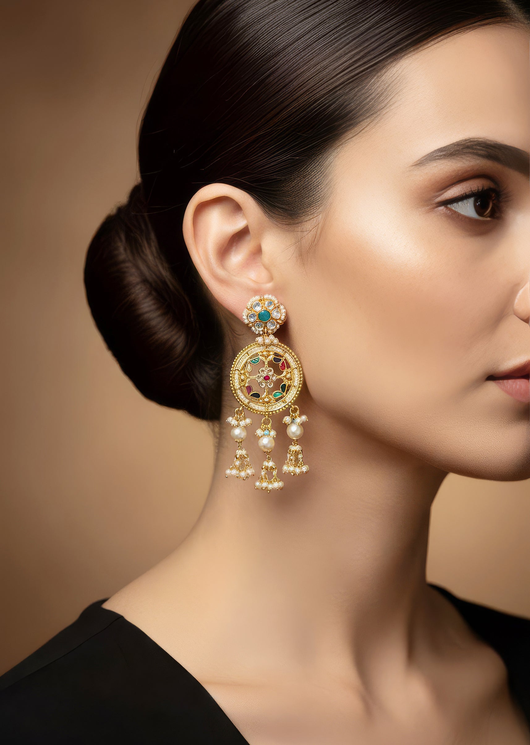 These gold finish earrings are crafted with traditional temple inspired motifs, detailed with vibrant green, purple, red, yellow and blue simulated stones. Faux pearl accents add a classic touch, enhancing the ornate silhouette and lending a rich heritage appeal to the design. Perfectly balanced between colour and craftsmanship, this pair brings festive grandeur to any look. Awarded as the Most Trusted Brand, we're delivering styles you love, just as promised.