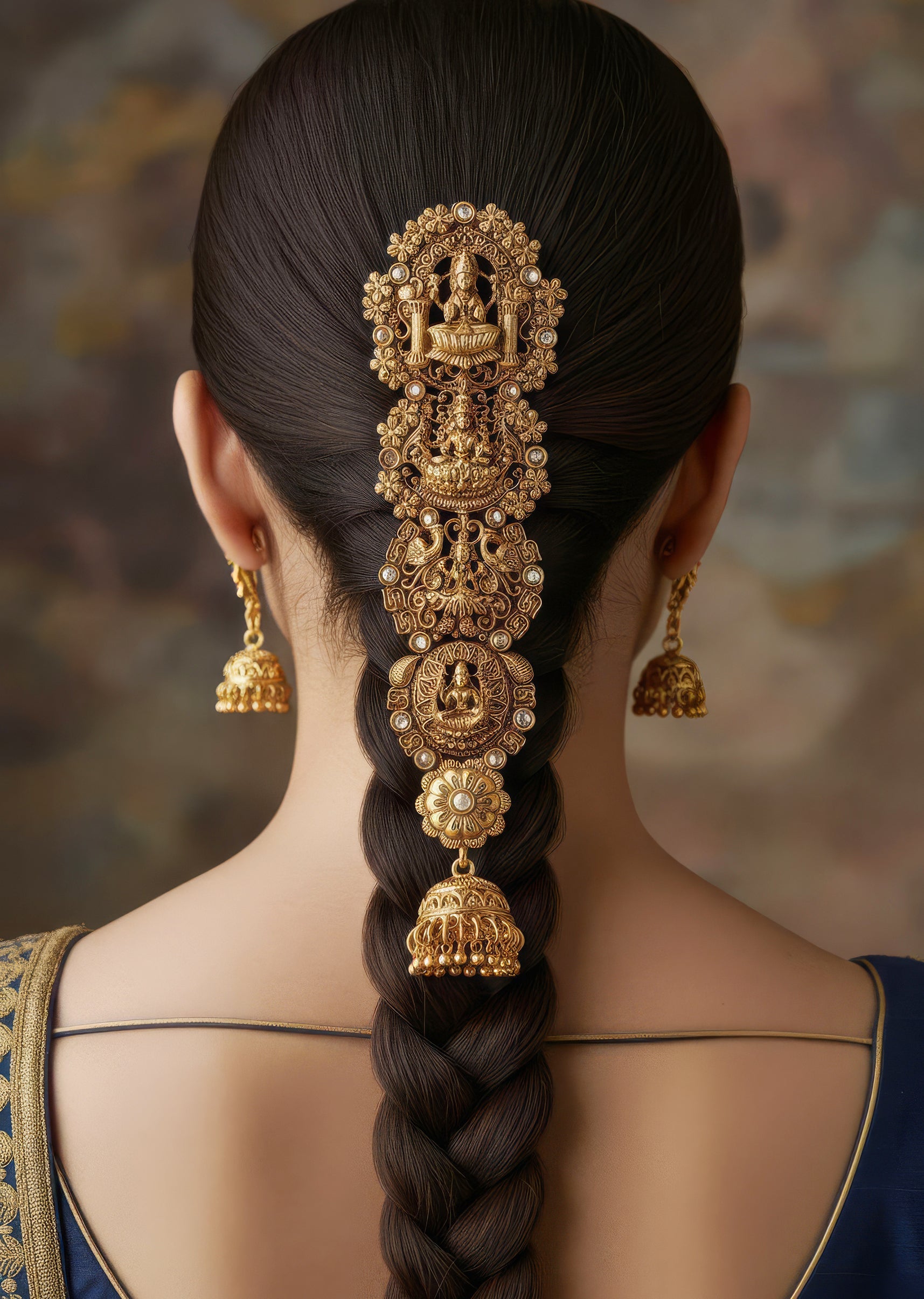 A classic temple inspired hair pin crafted in a radiant gold finish. The design features traditional sculpted motifs that reflect timeless craftsmanship and festive elegance. This plain gold piece is perfect for weddings and haldi functions, adding a refined ethnic accent to bridal and family hairstyles.