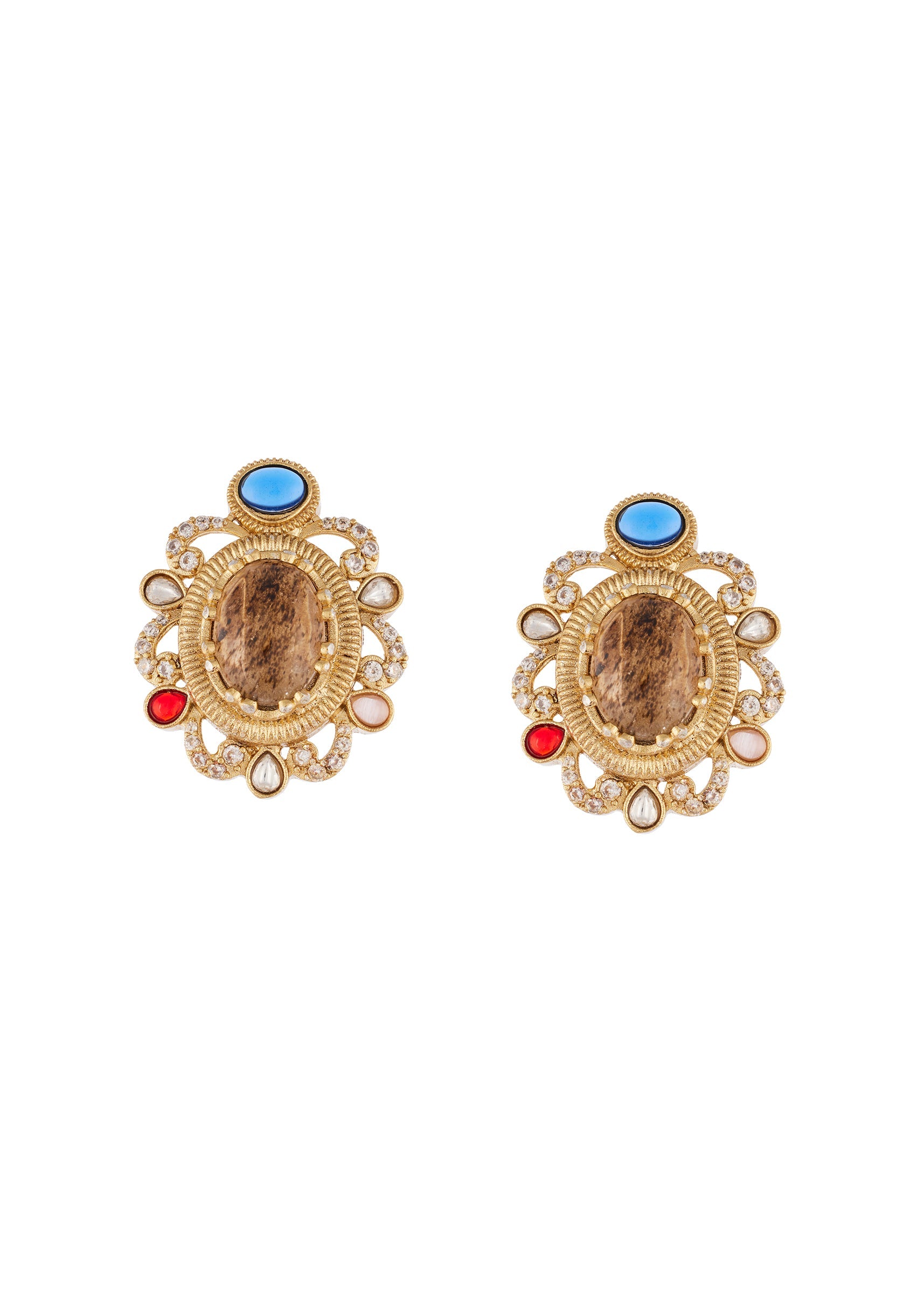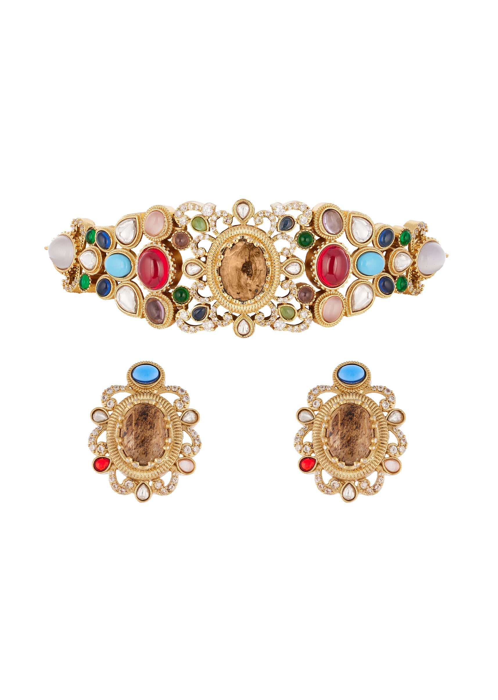 Gold Finish Jewellery Set In Kundan Detailing With Semi Precious Stones