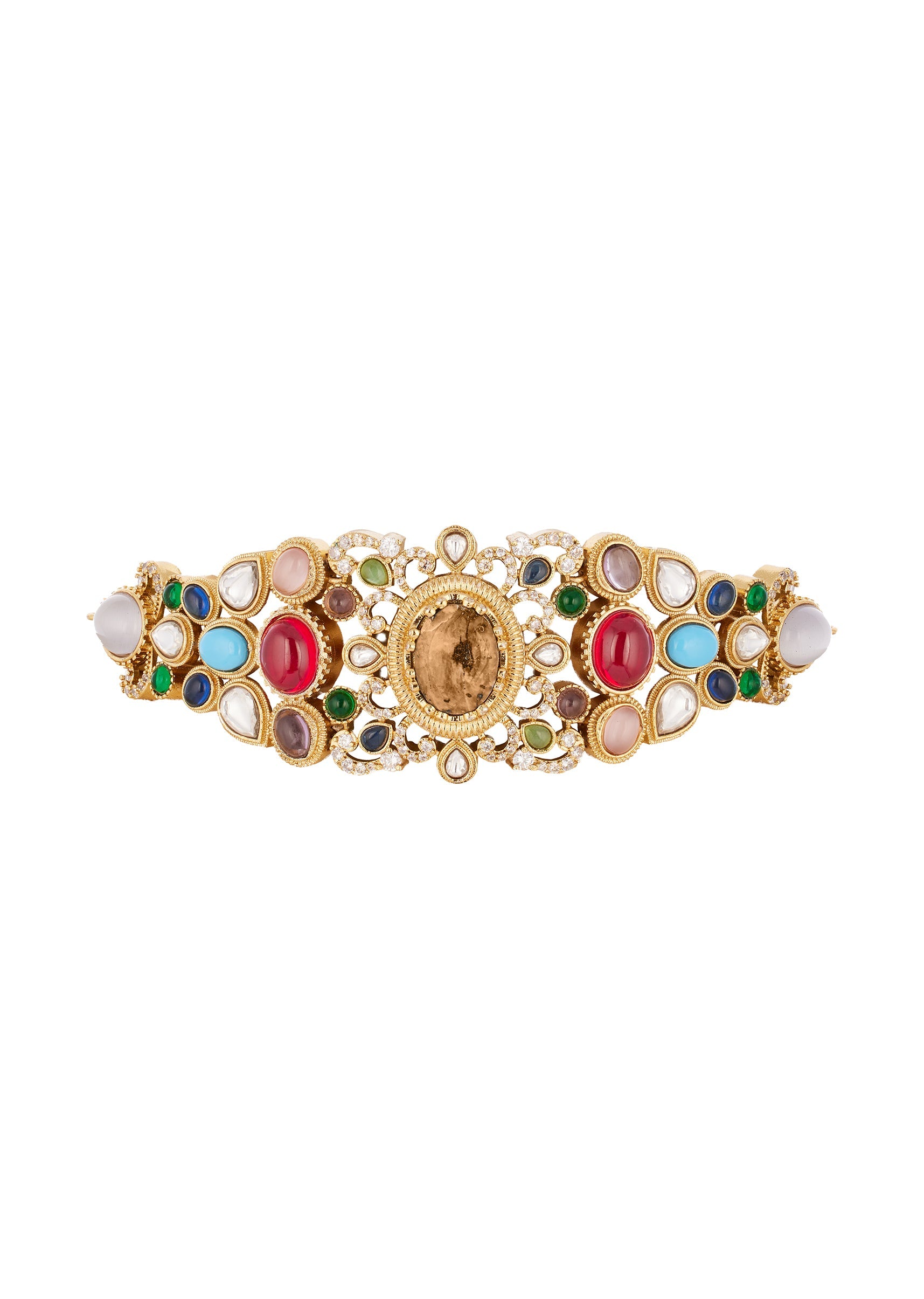 Rooted in timeless Indian artistry, this multi gold jewellery set is crafted using the traditional Kundan Jadau technique. The semi precious stones add refined sparkle, while the rich gold tones... More Product Details