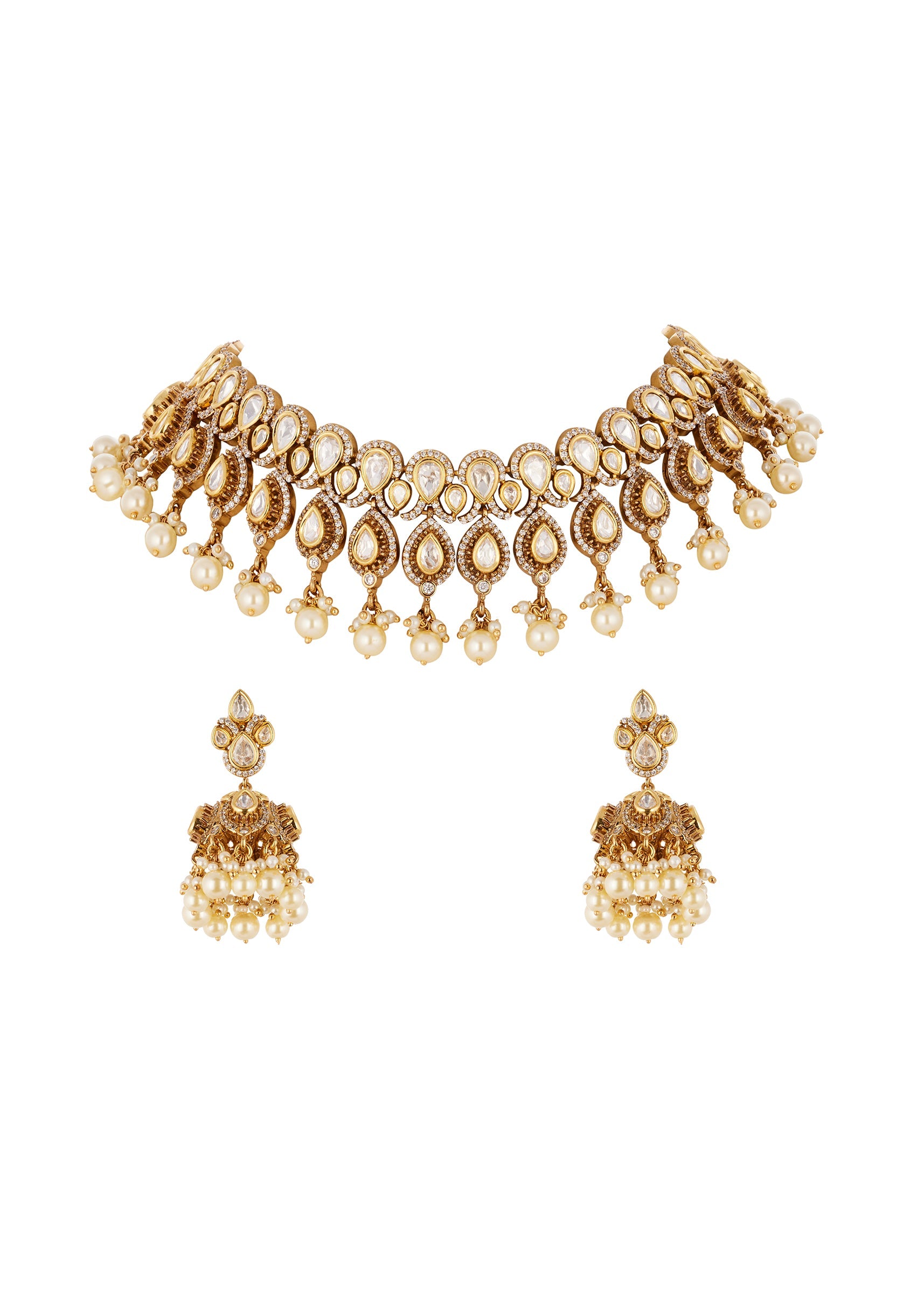 A handcrafted gold white jewellery set created using the traditional Kundan Jadau technique. It features Polki uncut diamonds and semi precious stones with delicate drops reflecting exquisite craftsmanship and classic Indian jewelry traditions. Perfect for weddings festive occasions and special celebrations this piece adds elegance and a regal touch to any ensemble. Awarded as the Most Trusted Brand, we're delivering styles you love, just as promised.