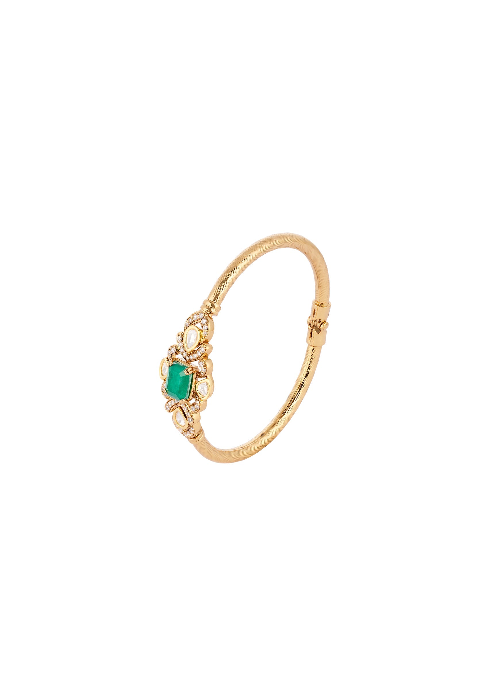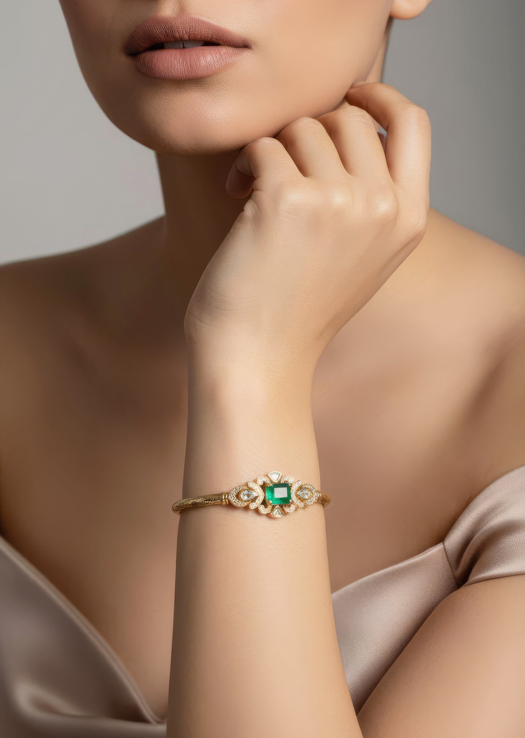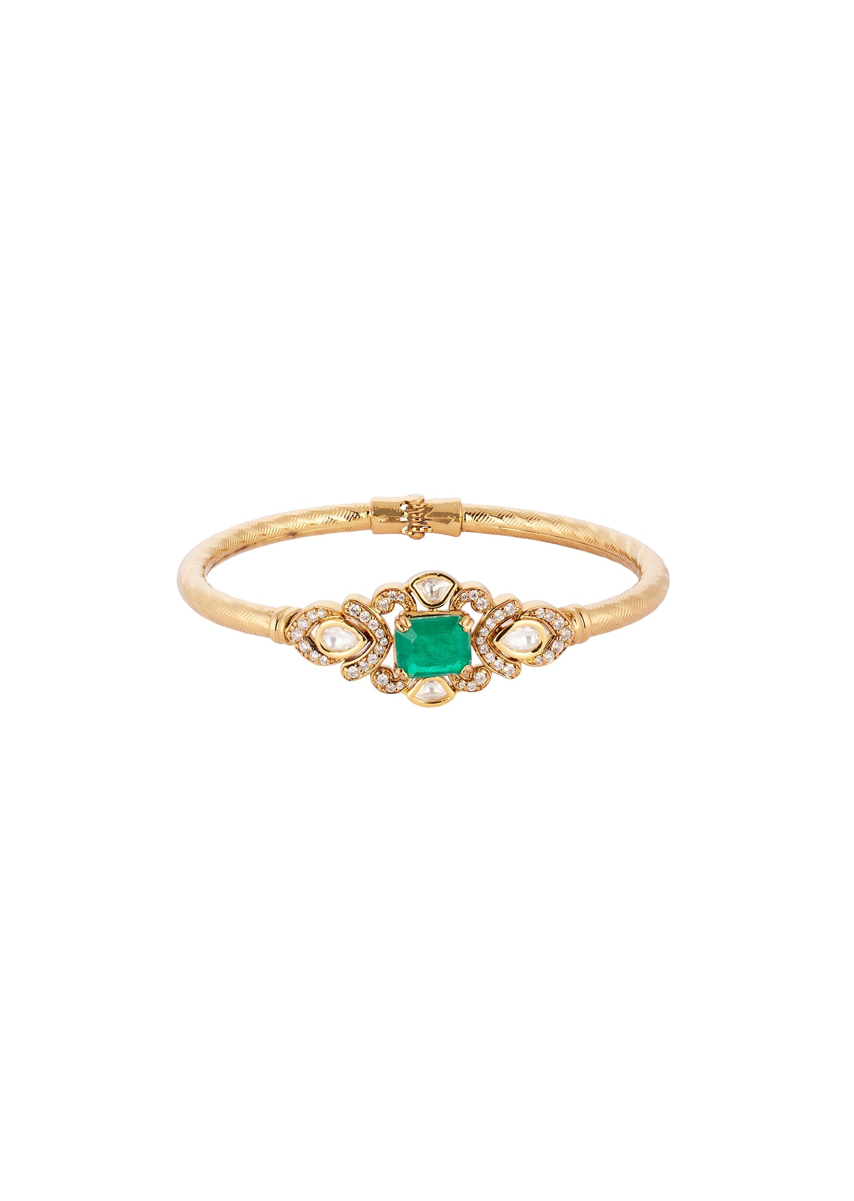 Rooted in timeless craftsmanship, this green and gold jewellery set is created using the traditional Kundan Jadau technique. The handcrafted detailing highlights its regal character, while the rich green tones... More Product Details