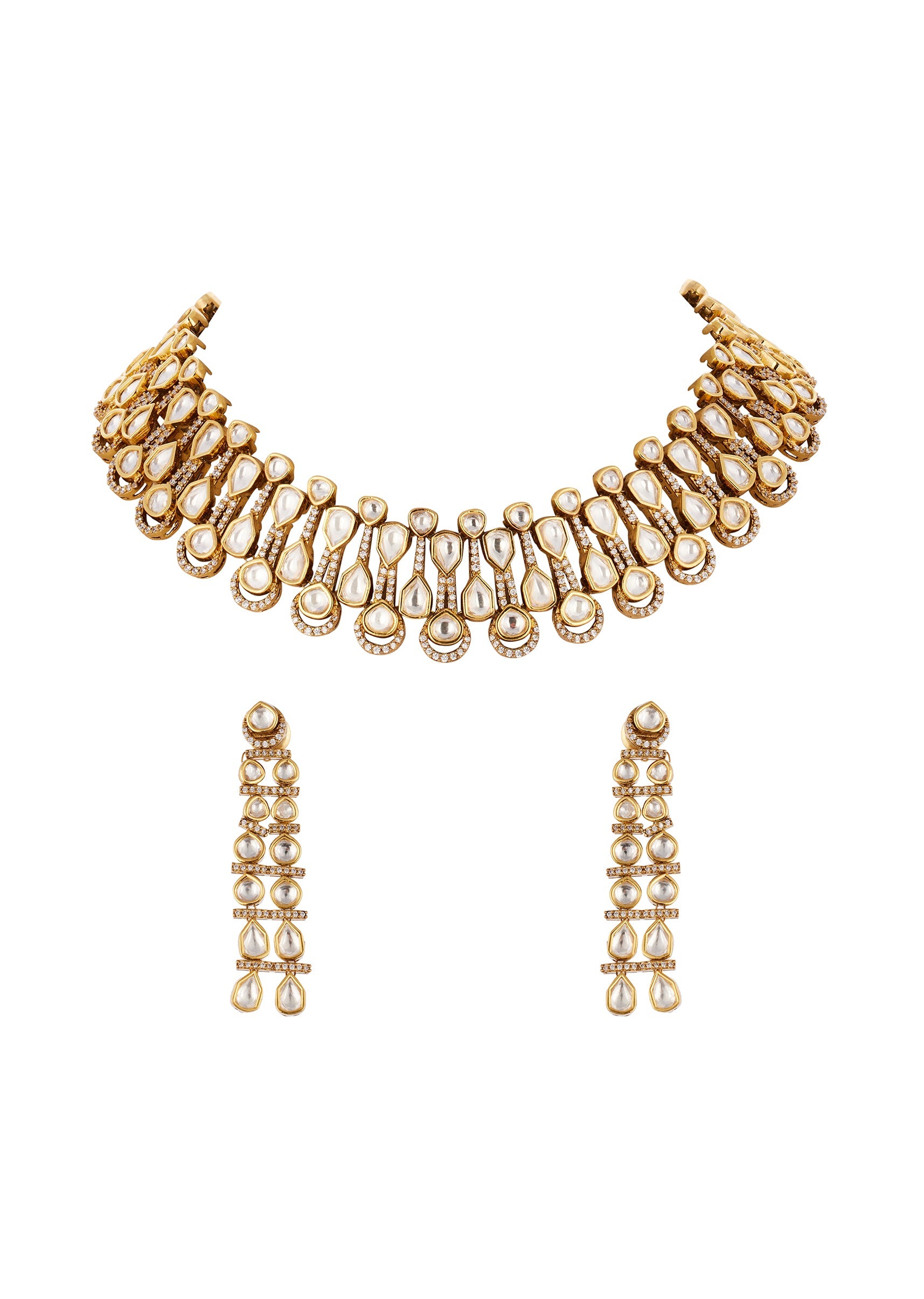 A handcrafted gold white jewellery set created using the traditional Kundan Jadau technique. It features Polki uncut diamonds and semi precious stones with delicate drops reflecting exquisite craftsmanship and classic Indian jewelry traditions. Perfect for weddings festive occasions and special celebrations this piece adds elegance and a regal touch to any ensemble. Awarded as the Most Trusted Brand, we're delivering styles you love, just as promised.
