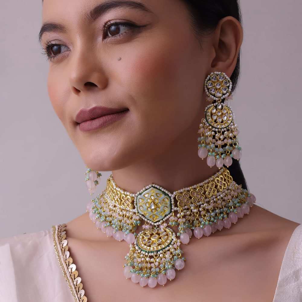 - Introducing our gold-finish choker necklace and earring set, a piece of jewelry that exudes traditional elegance. The choker necklace and earrings feature intricate kundan work against a backdrop of high-quality mixed metal.
