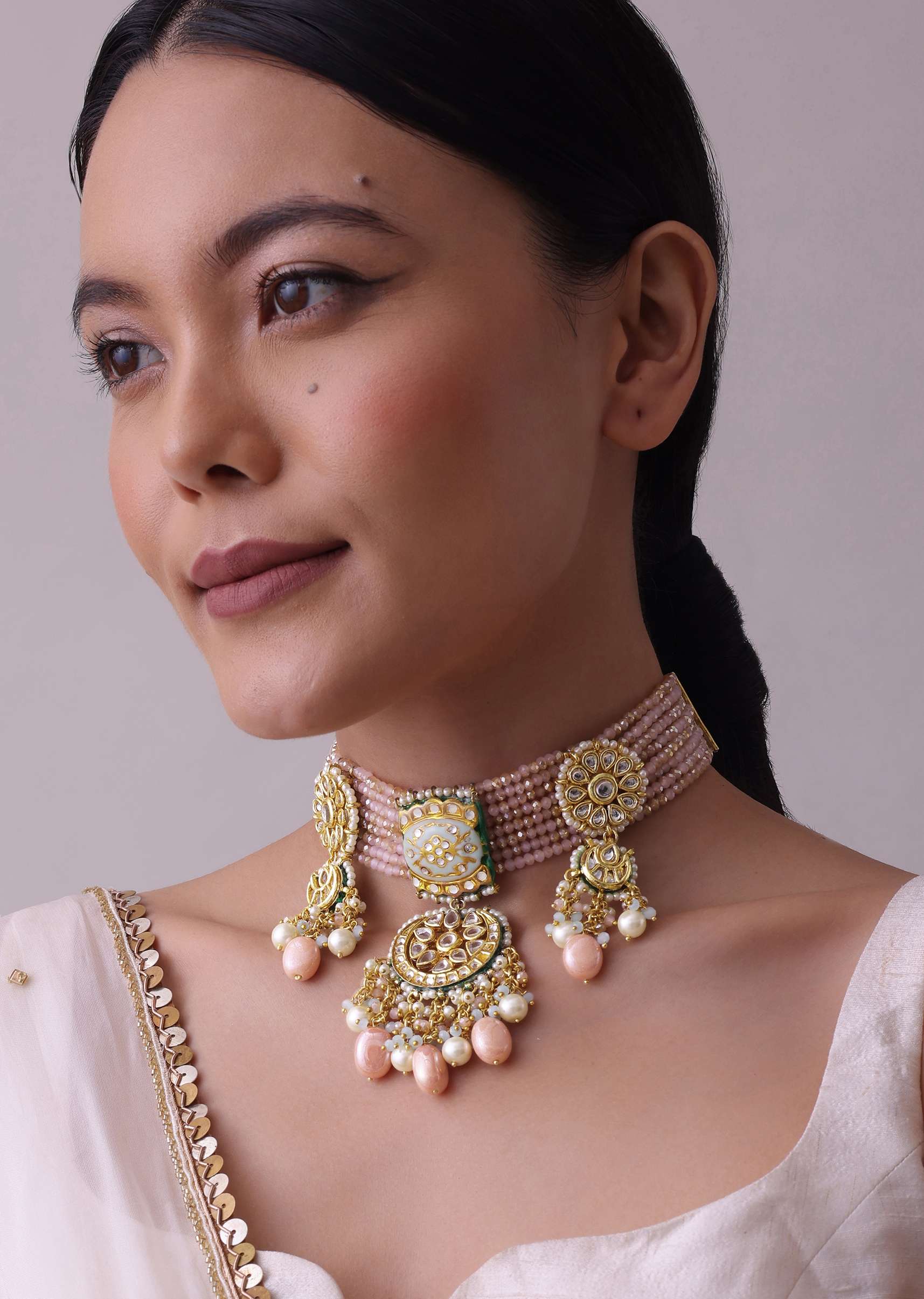 Gold-Finish Kundan Choker Necklace Set With Multicolor Meenakari Work In Mix Metal