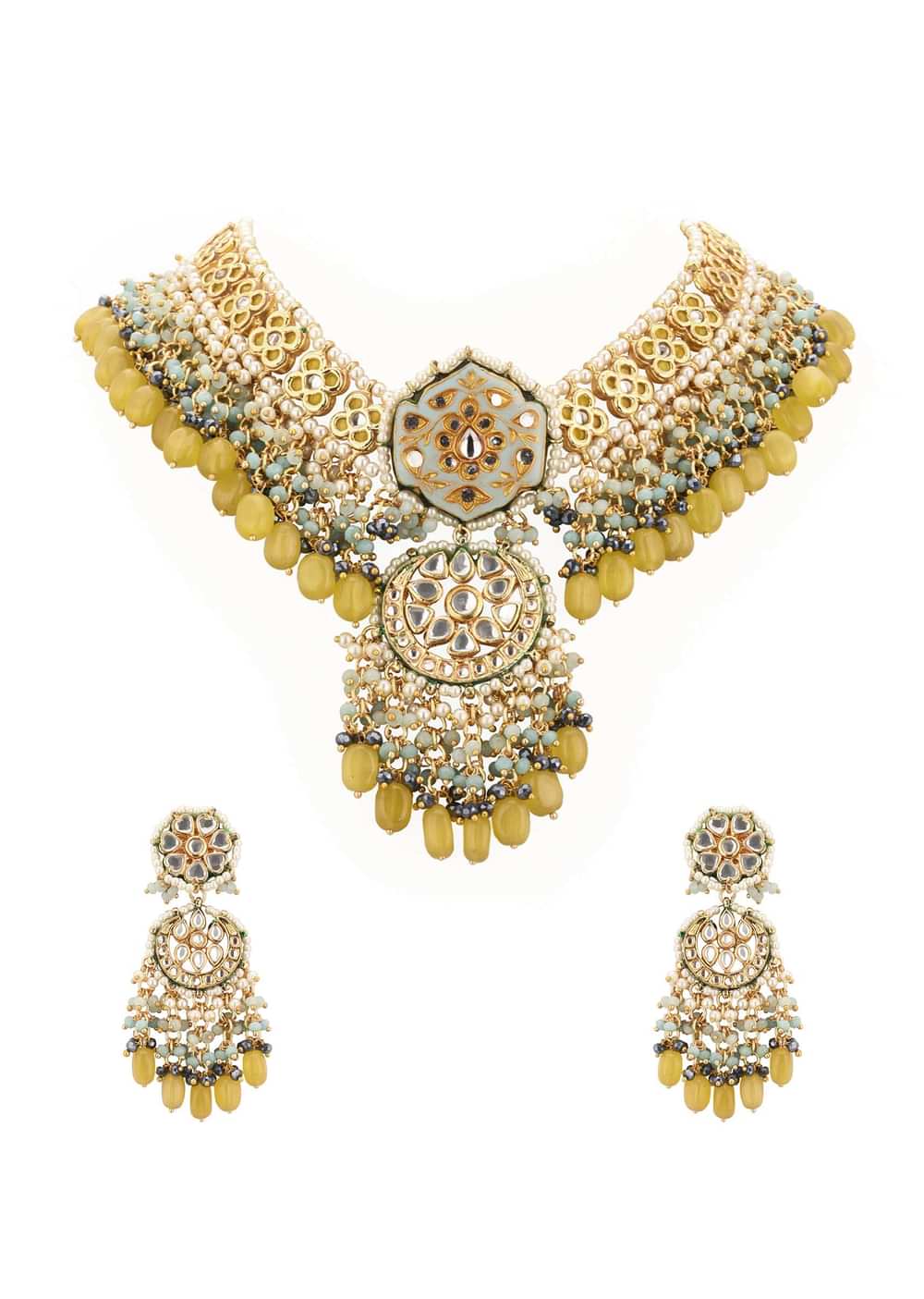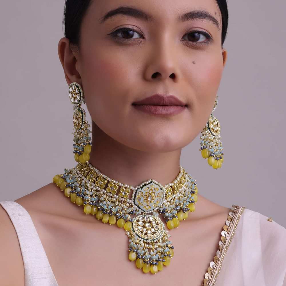- Presenting our gold-finish kundan choker necklace and earring set, a must-have for anyone who wants to elevate their jewelry collection.