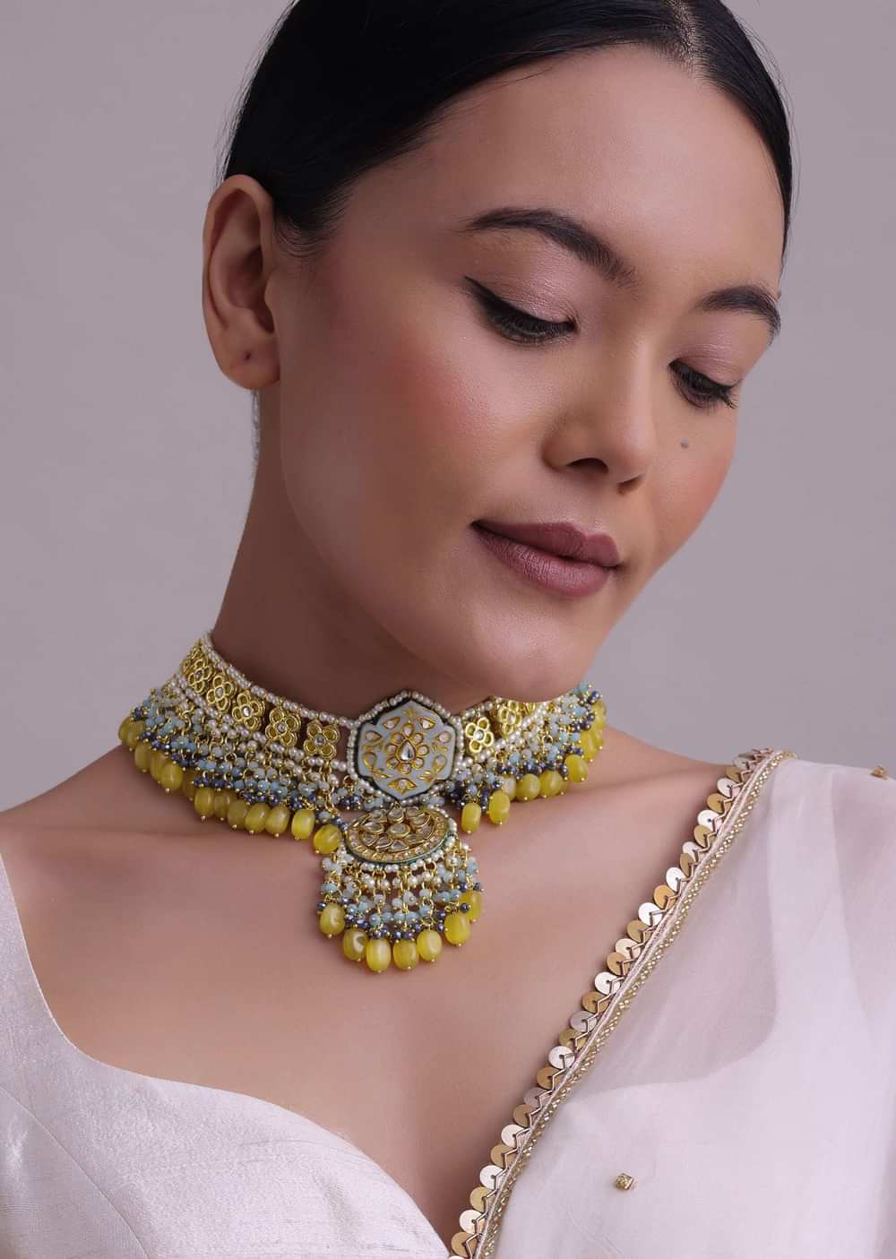 A solid color saree or a traditional salwar kameez would make the perfect backdrop for this stunning piece of jewelry.