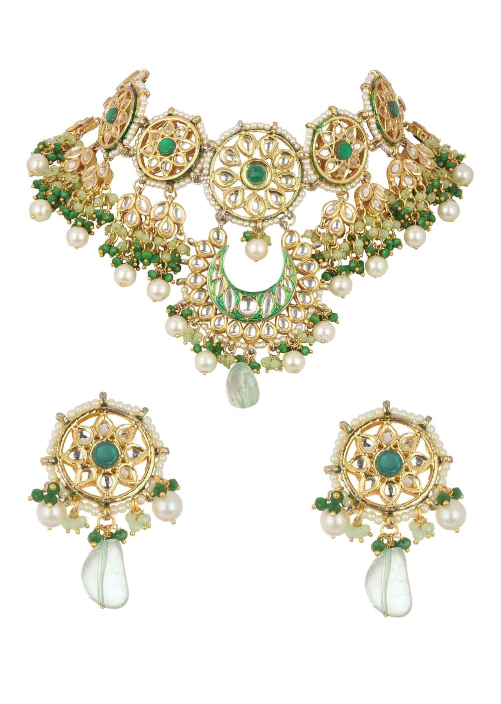 - This choker and the studs are embellished with captivating green drops and lustrous pearls.