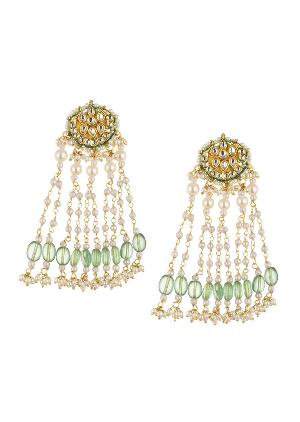 - These exquisite danglers boast intricate kundan work and are embellished with lustrous white and vibrant green beads.