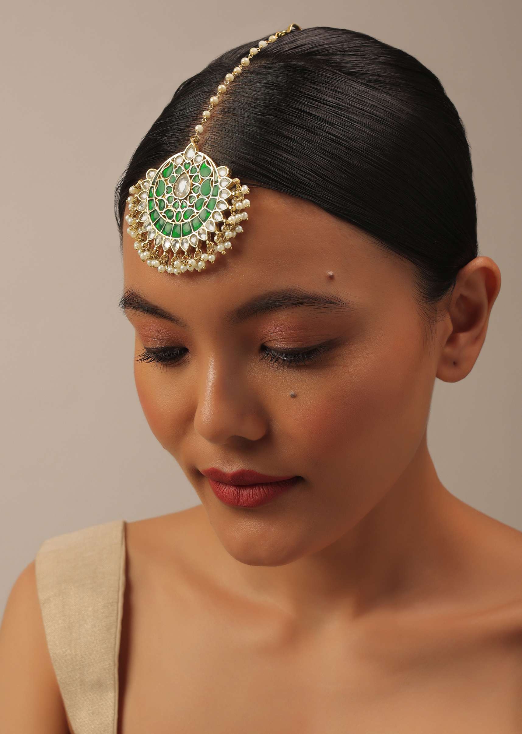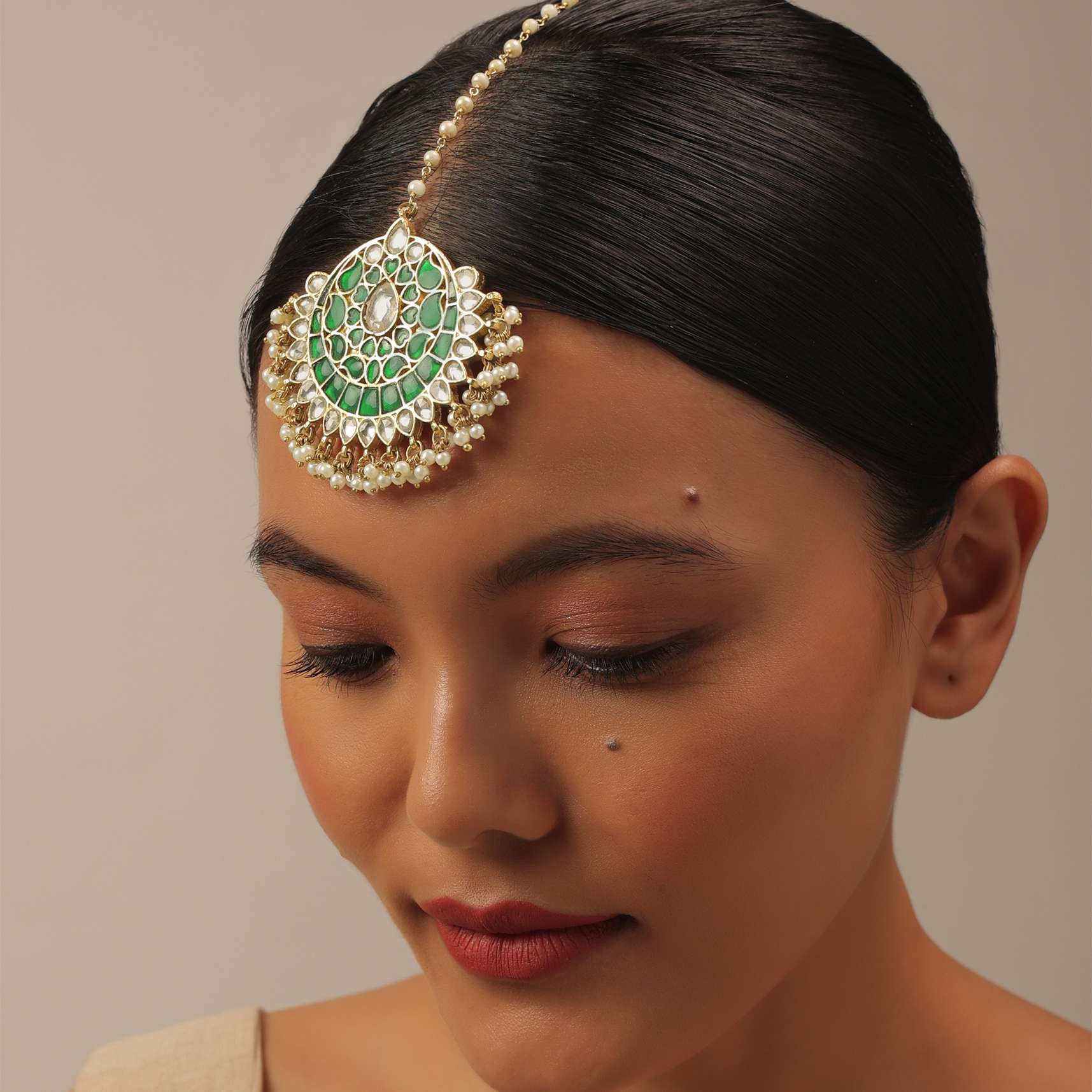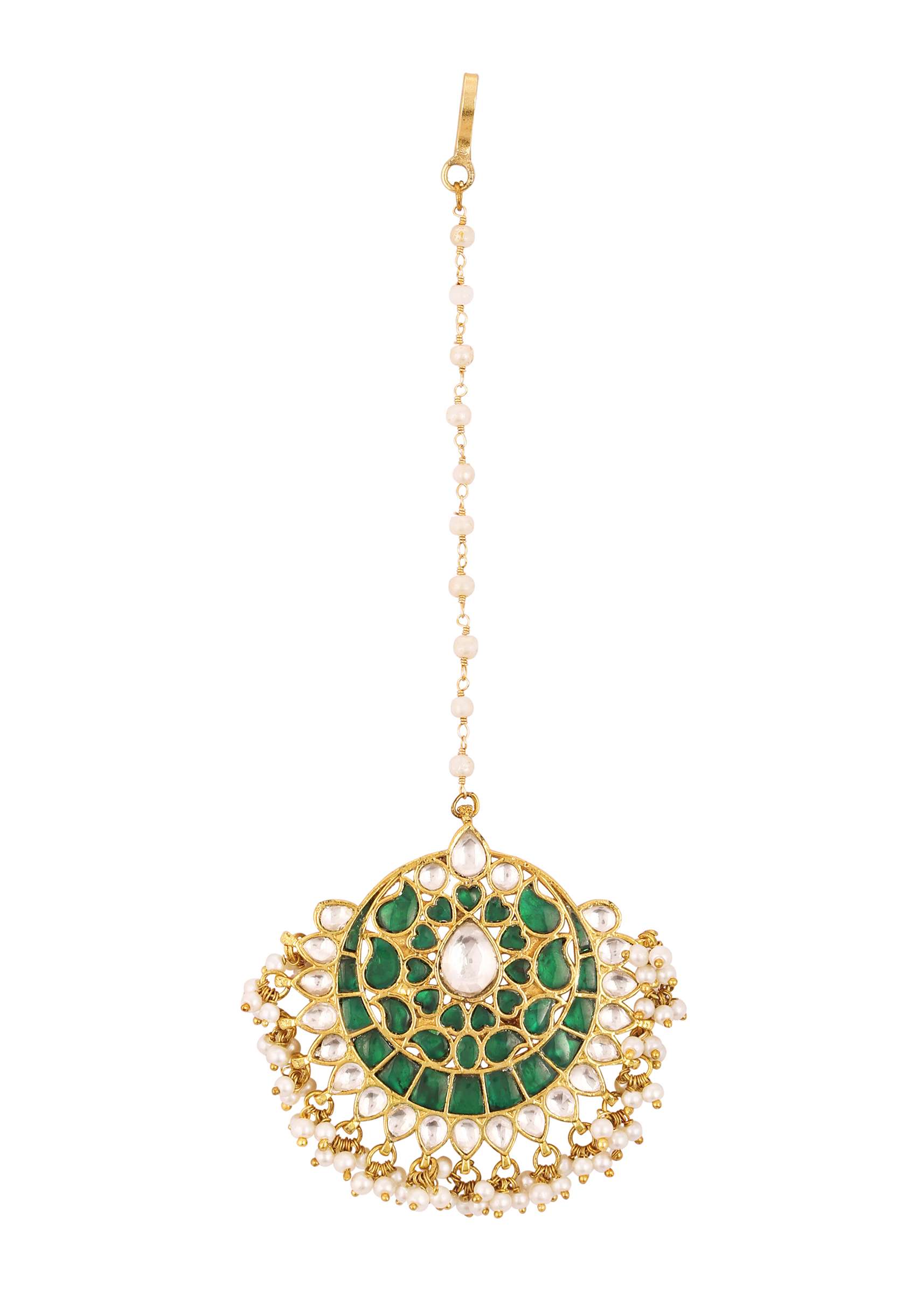 - A gorgeous gold finish kundan maangteeka in mixed metal, synthetic emerald stones, and beads in a floral design that accentuates the piece's beauty.