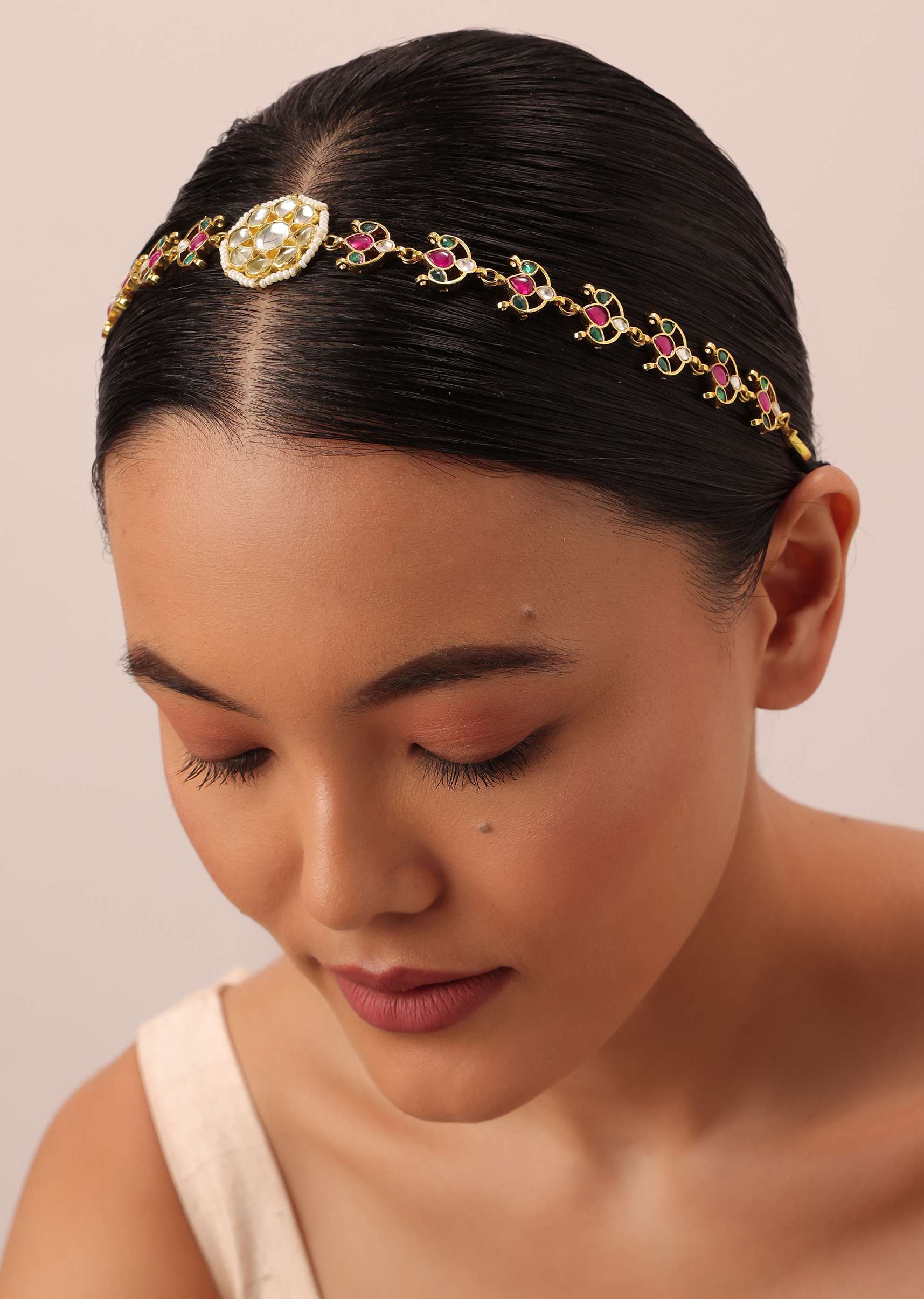 - Studded with glistening kundan this headgear is elevated with a beautiful floral motif.