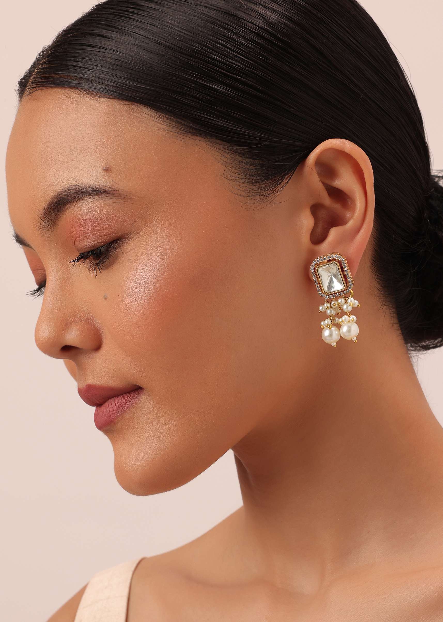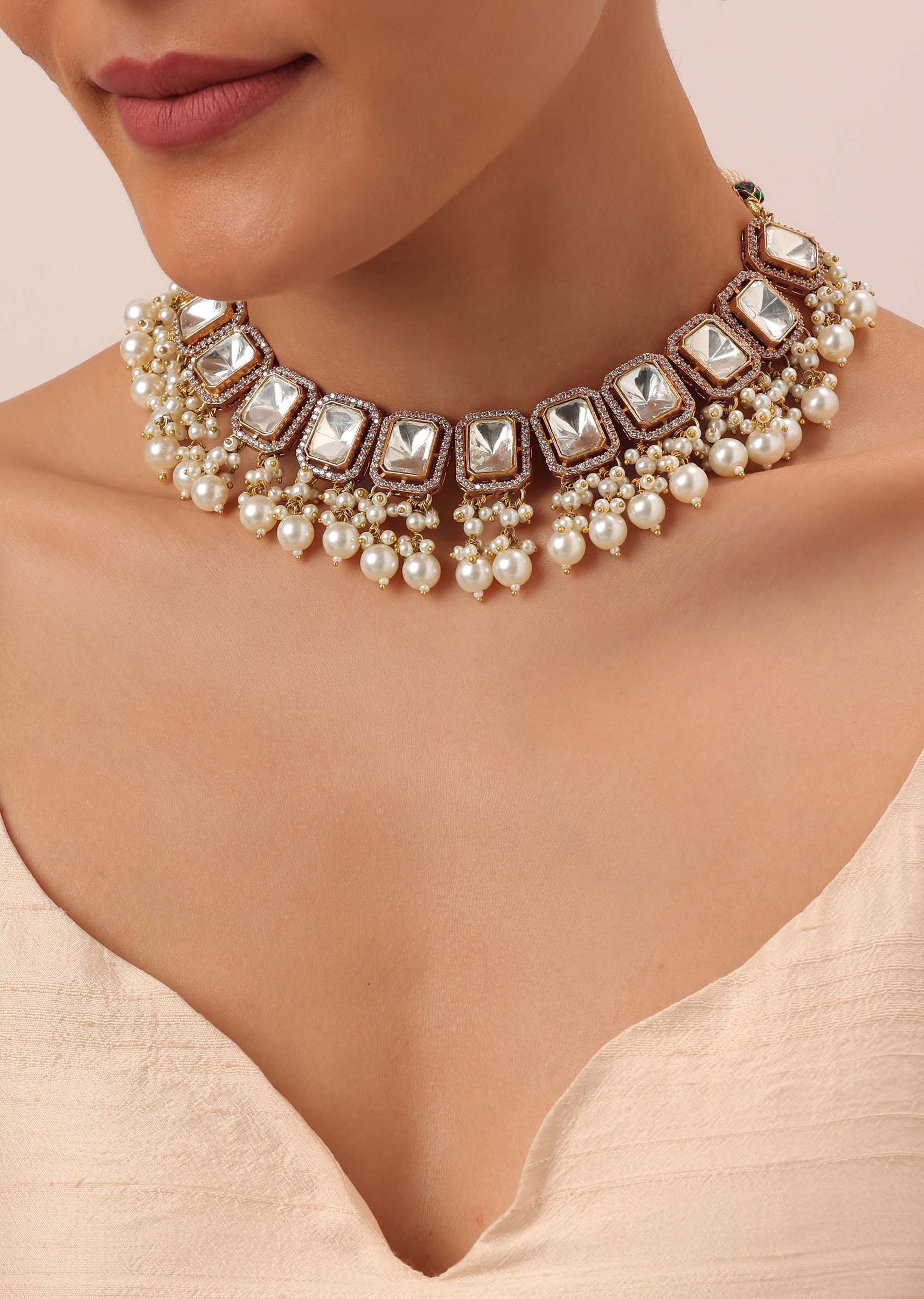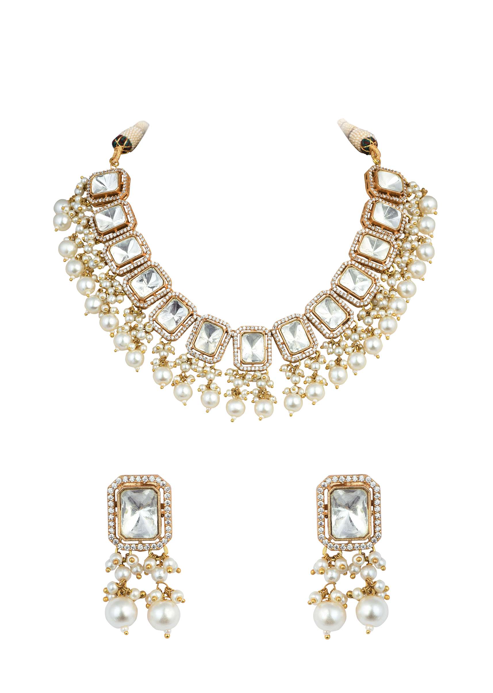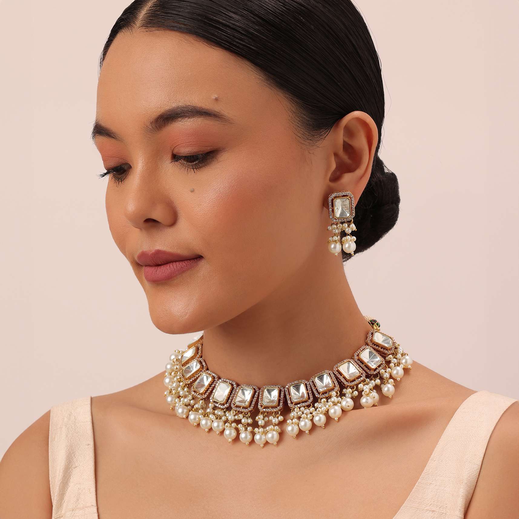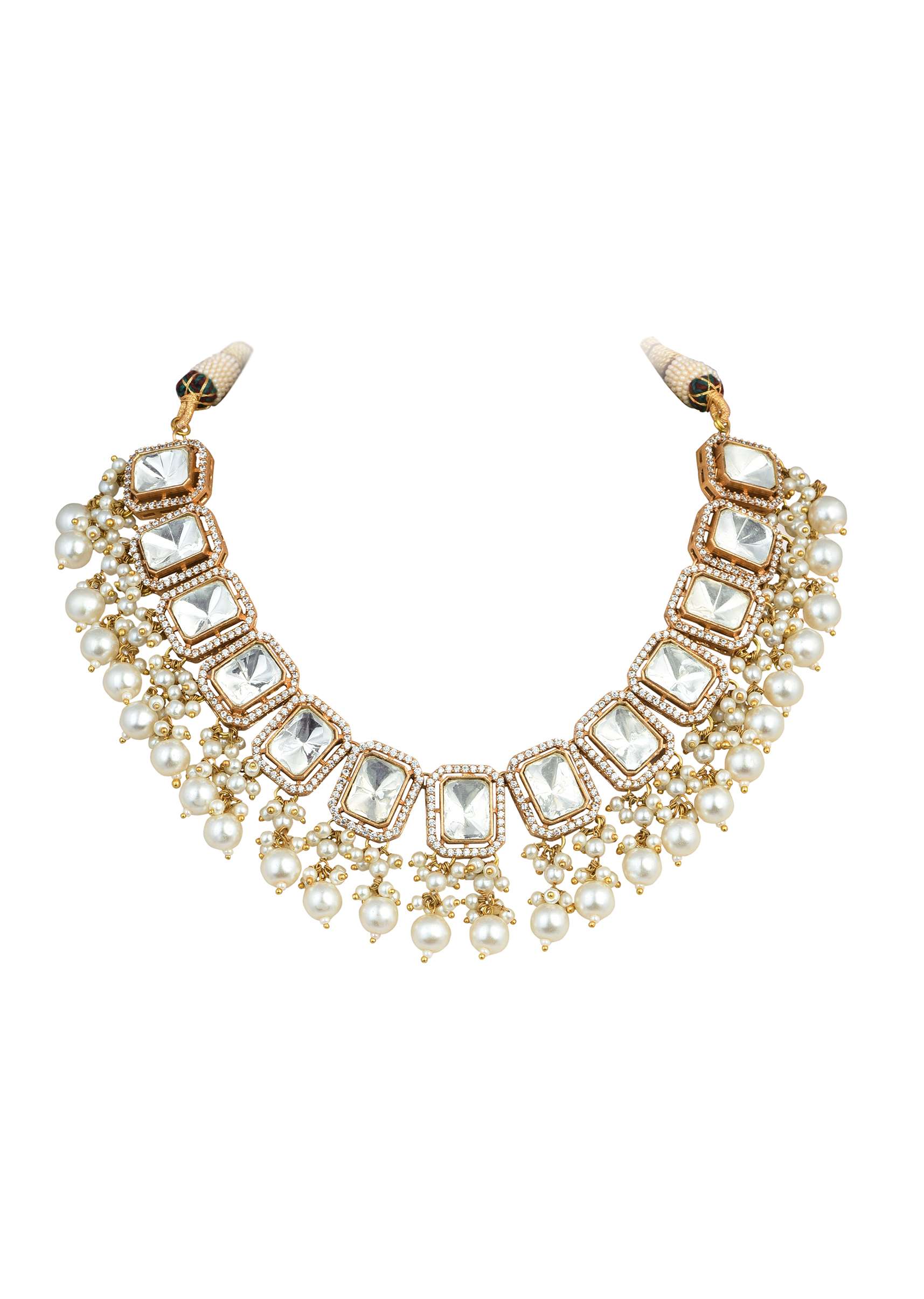 - Adorned in kundan and embellished with cluster pearl drops it displays stunning geometric motifs.