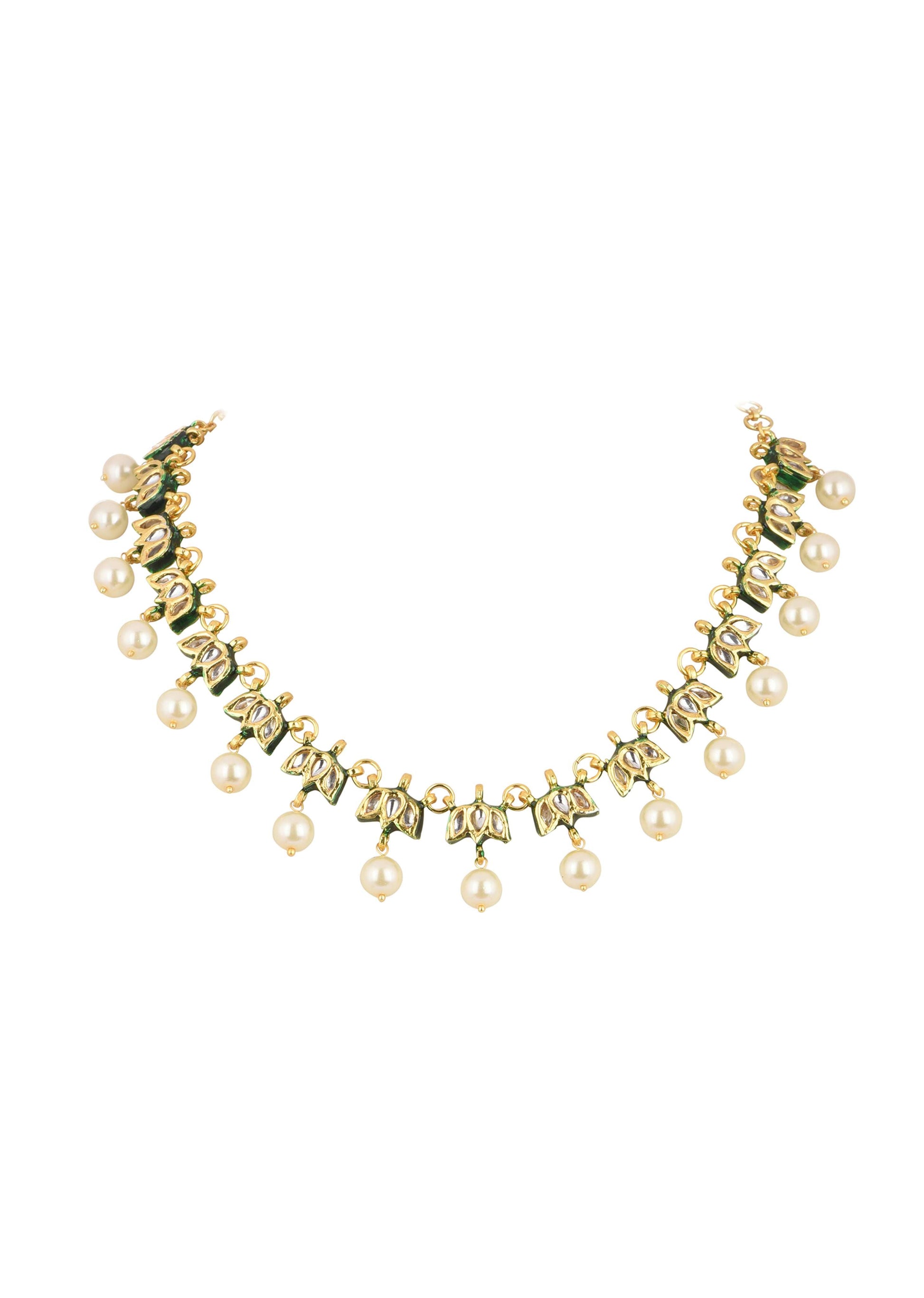 - Step into a world of sophistication with our gold-finish kundan necklace with pearls.