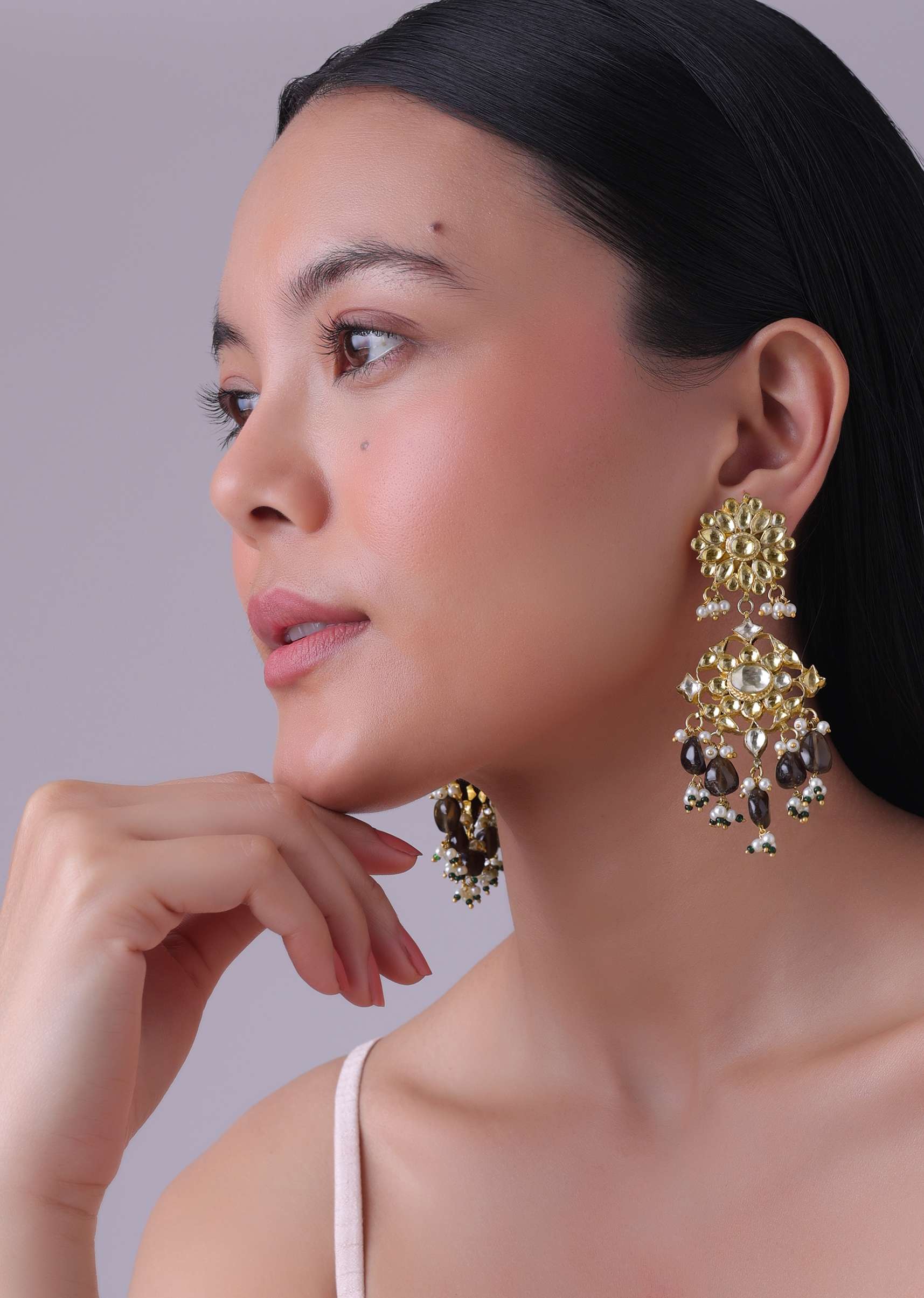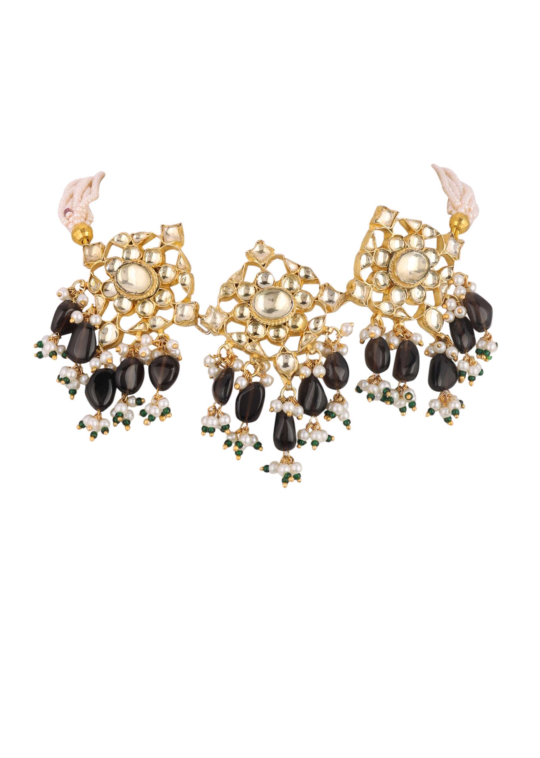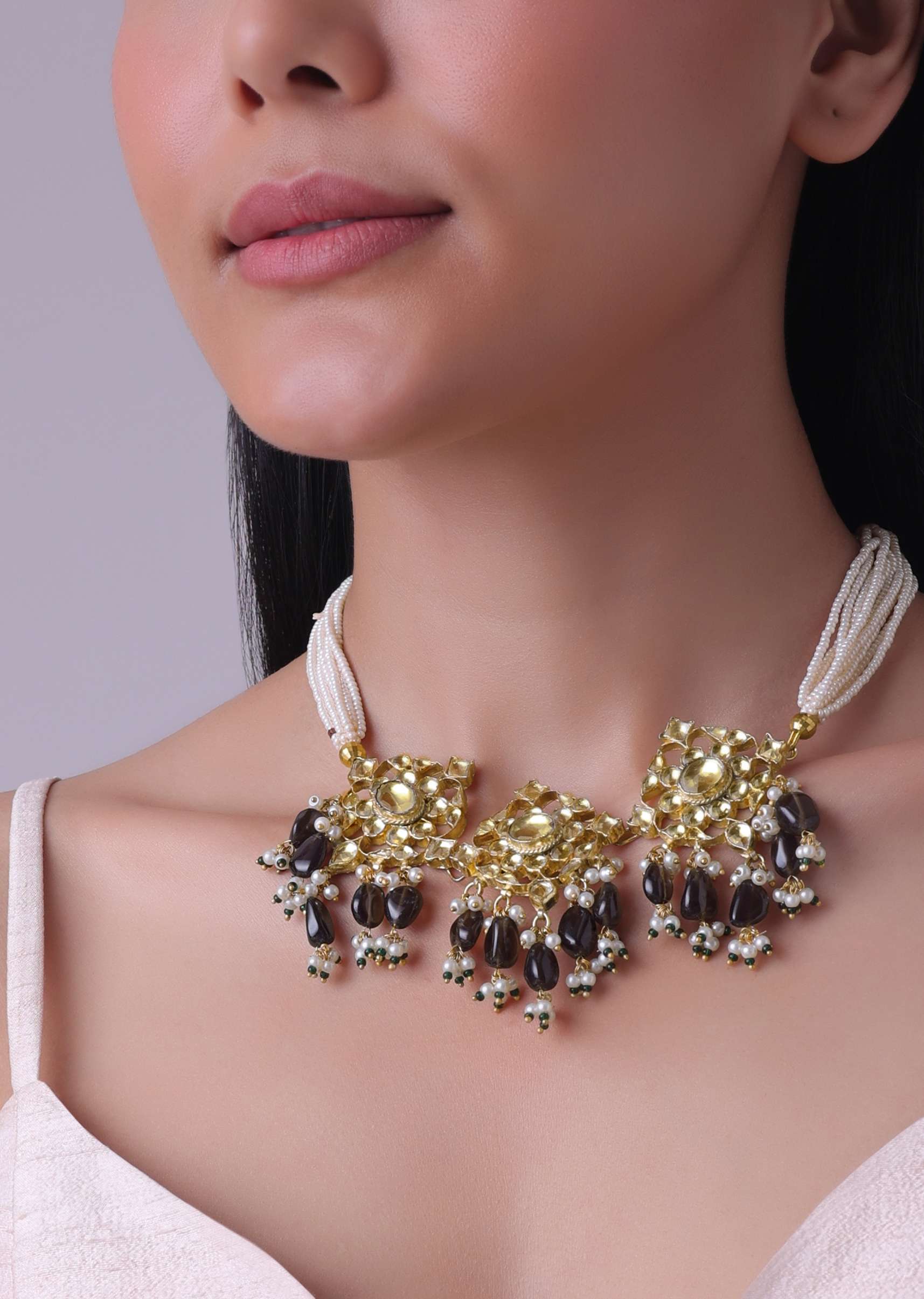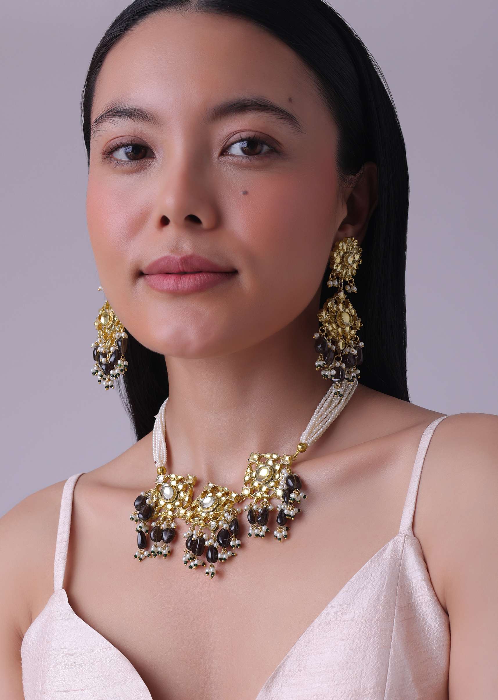 Gold Finish Kundan Polki Black Necklace Set With Beads, Stones, And Pearls