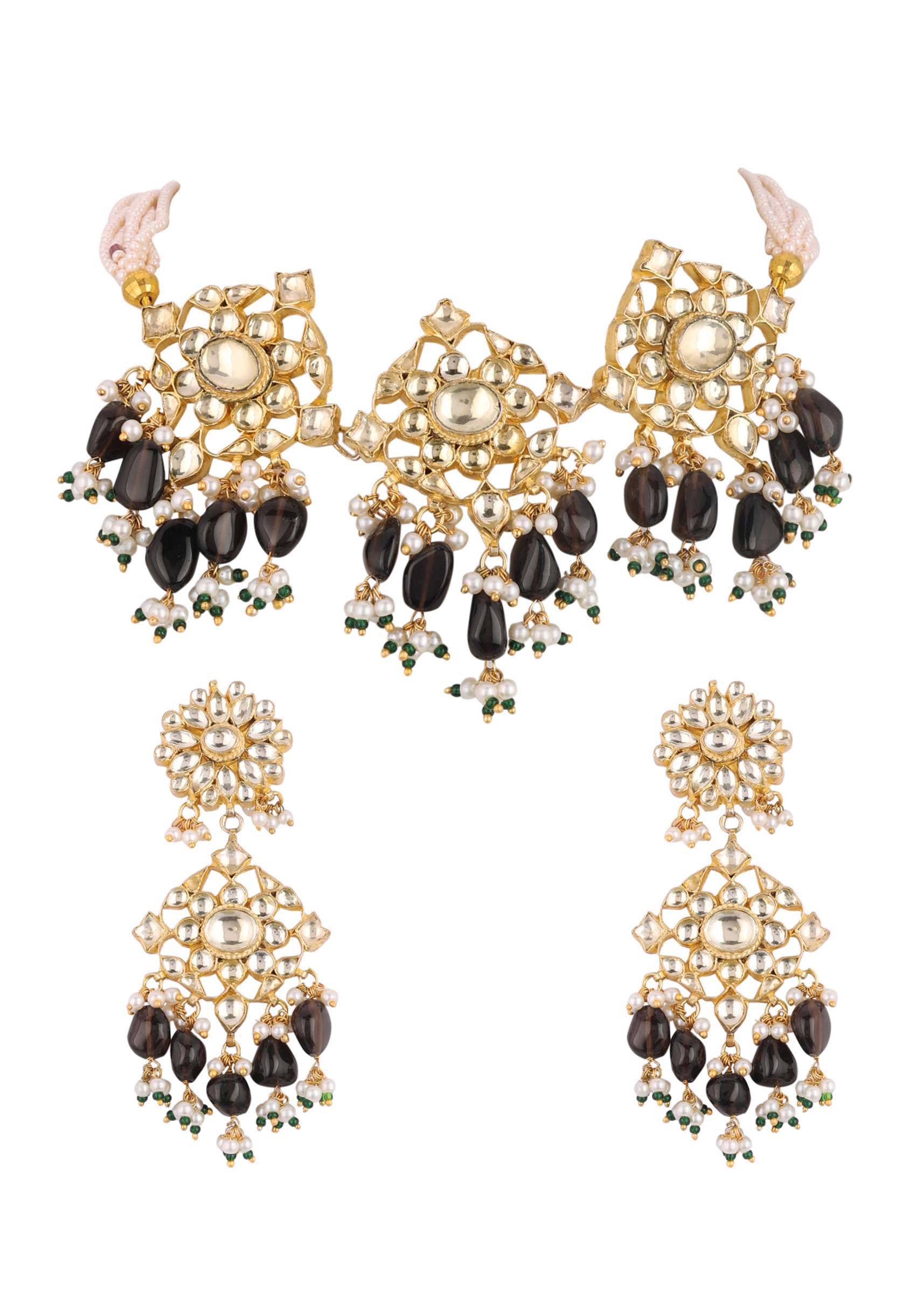 - The set features beautiful black stones and bead drops on the necklace with detailed polki work, perfect for your upcoming festive occasions or weddings.