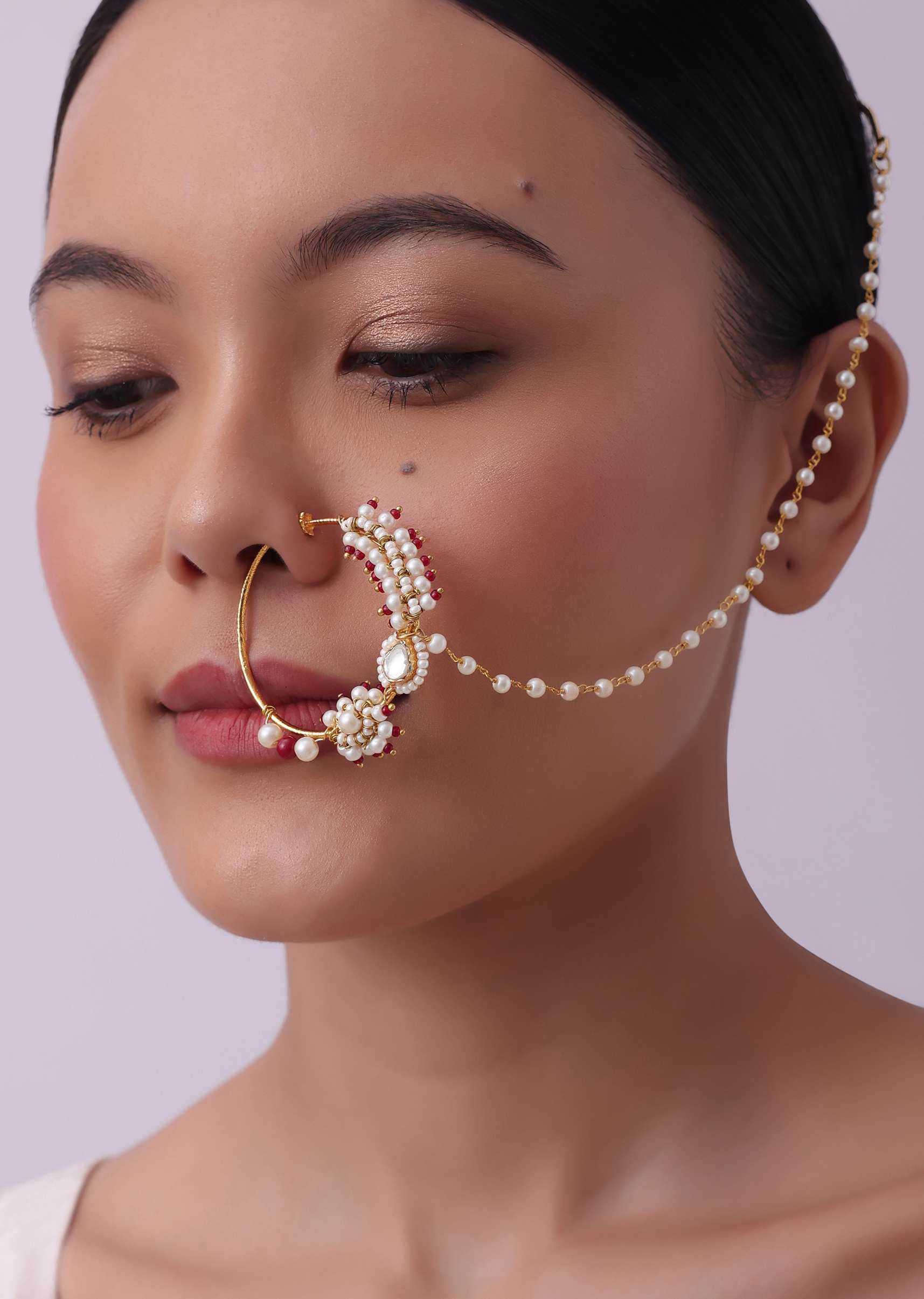 - Bridal kundan polki nath with a sleek string design in pearls, ruby beads, and white beads that emits sleek sophistication.