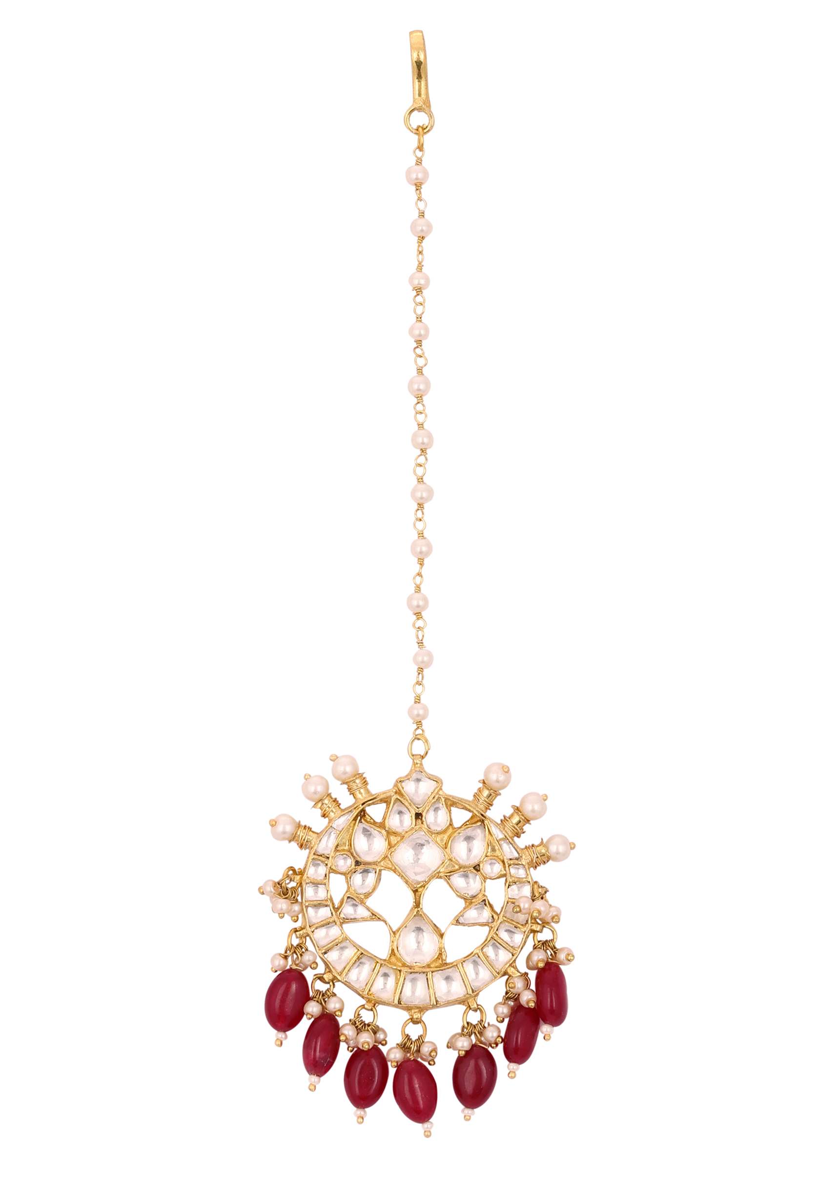 Gold Finish Kundan Red Floral Maangtika With Synthetic Ruby Stones