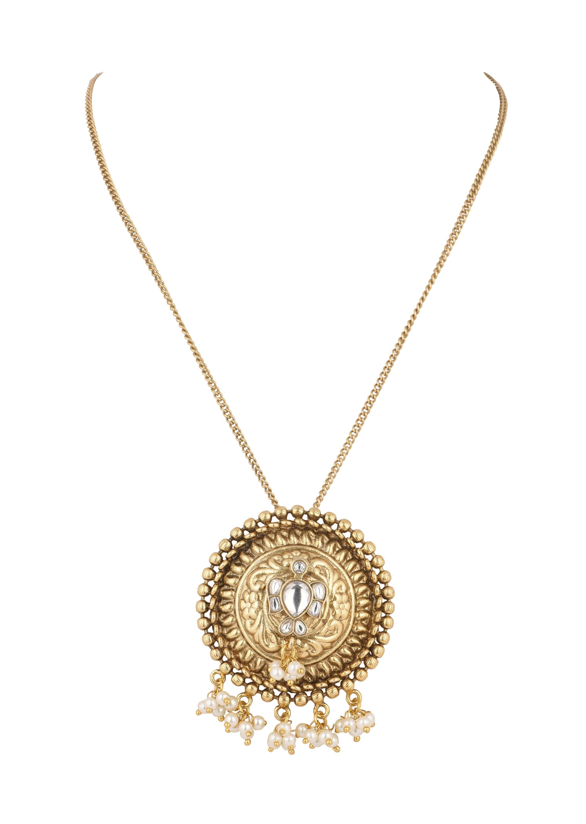 - Make a bold style statement with our gold finish long necklace embedded with a small motif beautifully blending fusion fashion with timeless elegance.